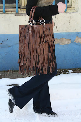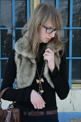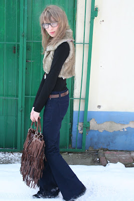 zestaw bardzo mi się za to podoba -spodnie świetnie wyglądają z tą futrzaną kamizelką i torbą z frędzlami! i to, że choć zestaw rodem z lat 70, za którymi nie przepadam szczególnie, jest minimalistycznie. i we wszystko idealnie wpasowują się okulary – super! 🙂