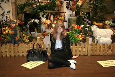 ..nie przeszkadza ani rąbek u spodnicy,( bo falbany to jest ta forma na spodnicy ,ktora uwielbiam), ale przeszkadza niesprzyjająca nieswiatateczna pogoda,ktora widac udzieliła sie zestawowi, ktory nie jest w optymistycznych kolorach. Pogoda nie pozwala na zdjecia w plenerze, ale od czego sa wystroje wewnatrz, o ktore zadbano tutaj, od razu humor jest optymistyczny i nawet Ci,ktorzy za swietami nie przepadaja usmiechaja sie na widok spiewajacego koguta, czy uroczego kroliczka. Sprzedawcy przescigaja sie w fantazyjnym ukladaniu stosu pisanek, a opakowania slodyczy i prezentow przybraly kolor zielony i zolty. Dobrze ze chociaz taka wiosne mozna ogladac, ale zycze Wam zeby wiosna goscila w sercach caly rok.