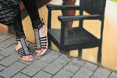 Co do samego storju to podoba mi się i nie podoba, a to dlatgeo, gdyż masz na sobie wszytsko co opanowało światową blogosferę o modzie. Legginsy latekowsowe, koszulka w paski, gladiatorki, pikowana a’la szanelka i skórzana kurtka…no nie mówię pasuje to do siebie, ale nei zaskakuje. Trochę to już oklepane, i przewidywalne połączenie… kiedyś był szał na styl kandynawski, teraz na rockowy z cwiekami…to pewnie pod wpływem takich blogów jak knightcat, czy Rumi. Więc myślę, że to nie ejst styl osobisty, a po prostu kopia czyjegoś i to bardzo dosłowna.