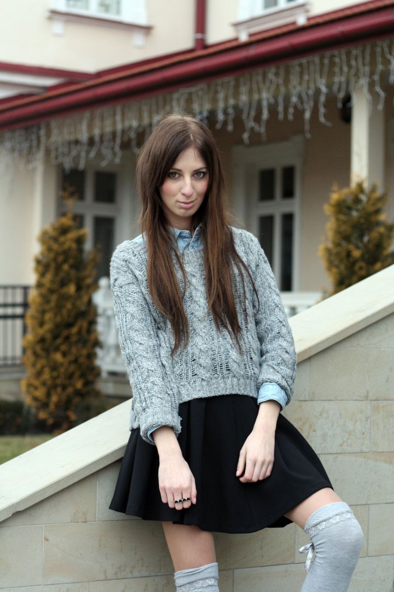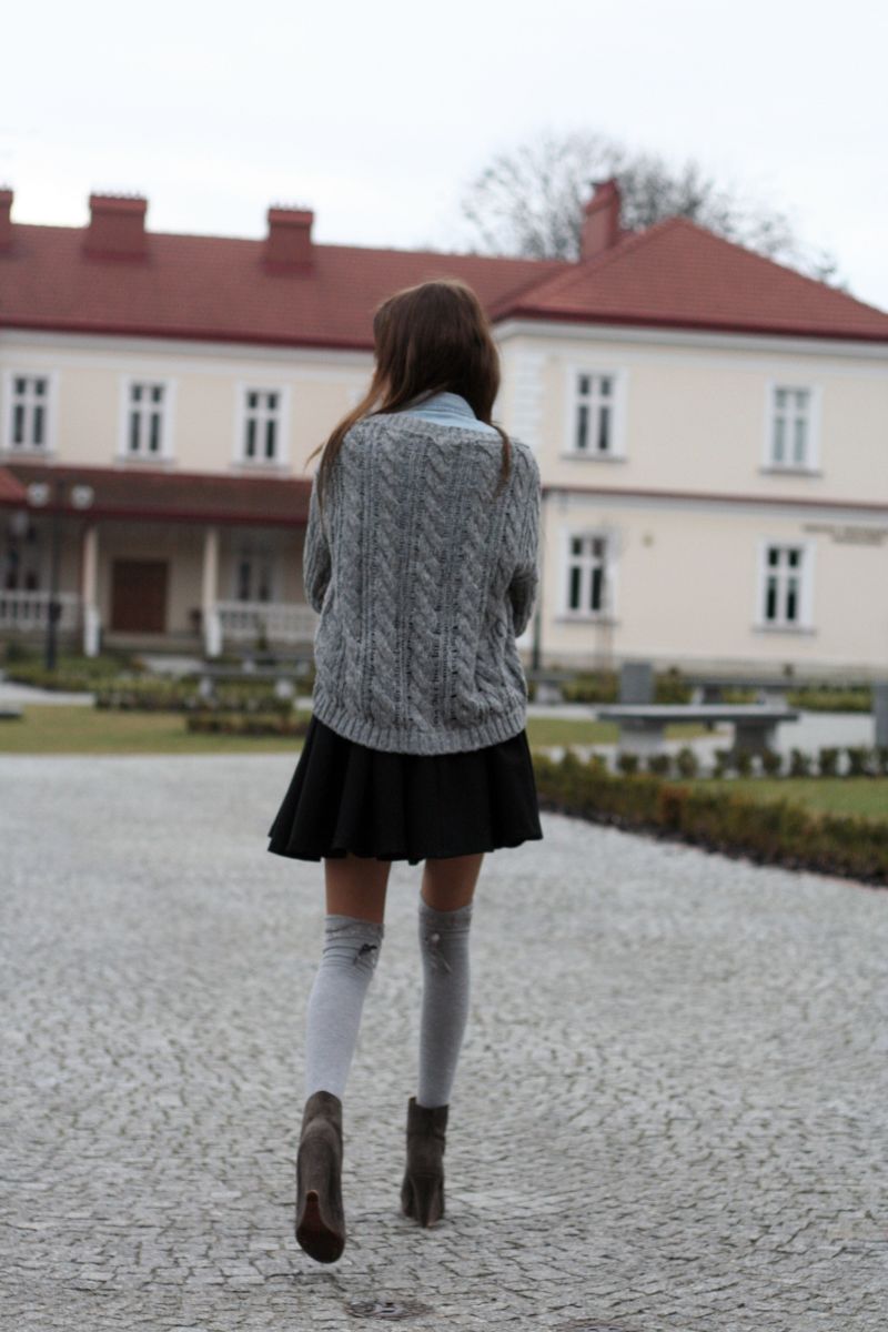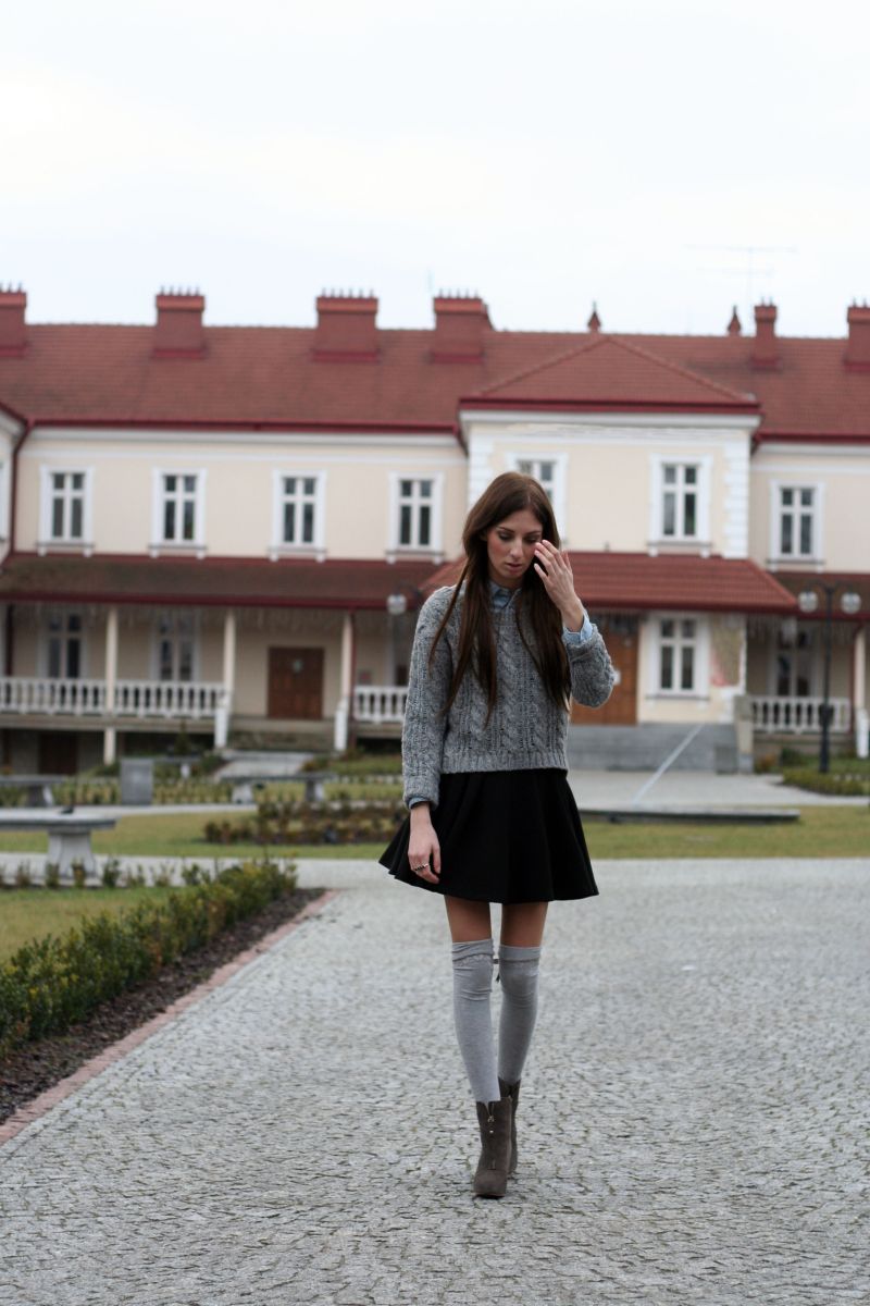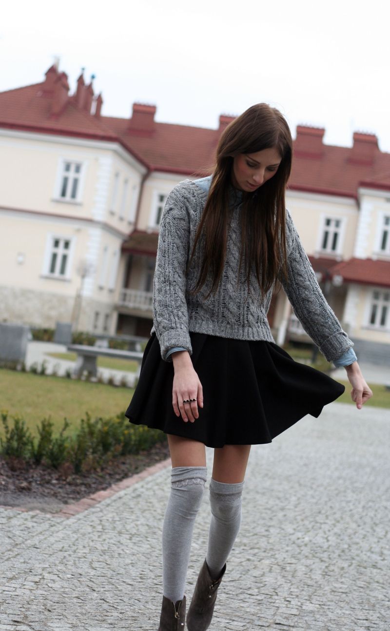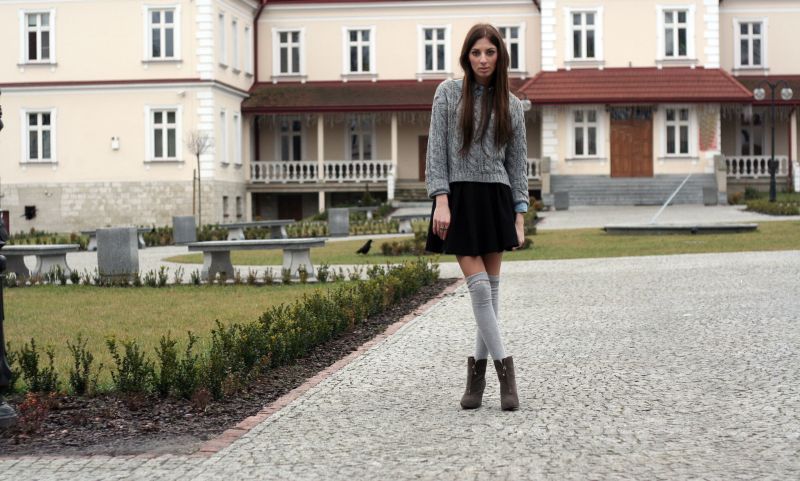 Zakolanówki to obowiązkowy element zimy- wystające z kozaków, zakładane do botków wraz ze spódnicą lub szortami- zawsze wyglądają stylowo. Moje ulubione zakolanówki w czarnym kolorze, 'zdradzam’ tylko z szarymi tak jak w tym outficie.