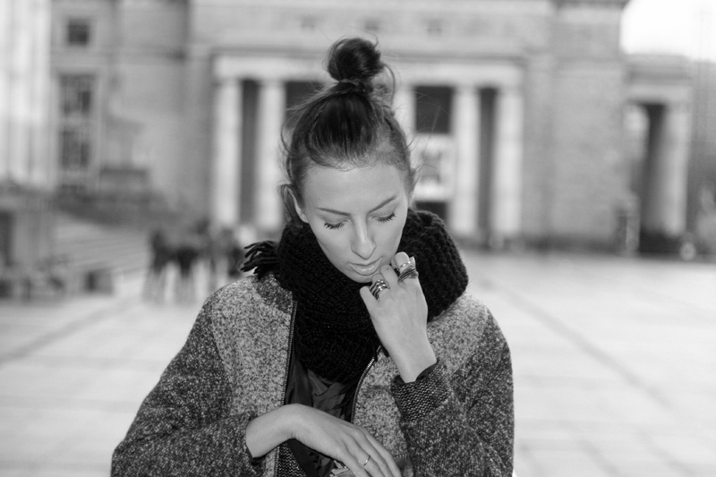 MANGO jacket | ZARA pants PULL&BEAR coat | H&M clutch and scarf | ALDO boots | RESERVED blouse | TOPSHOP rings