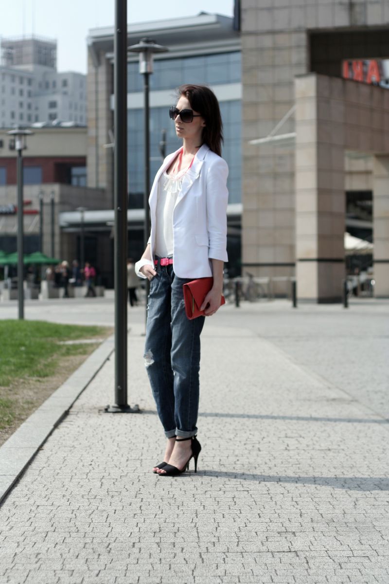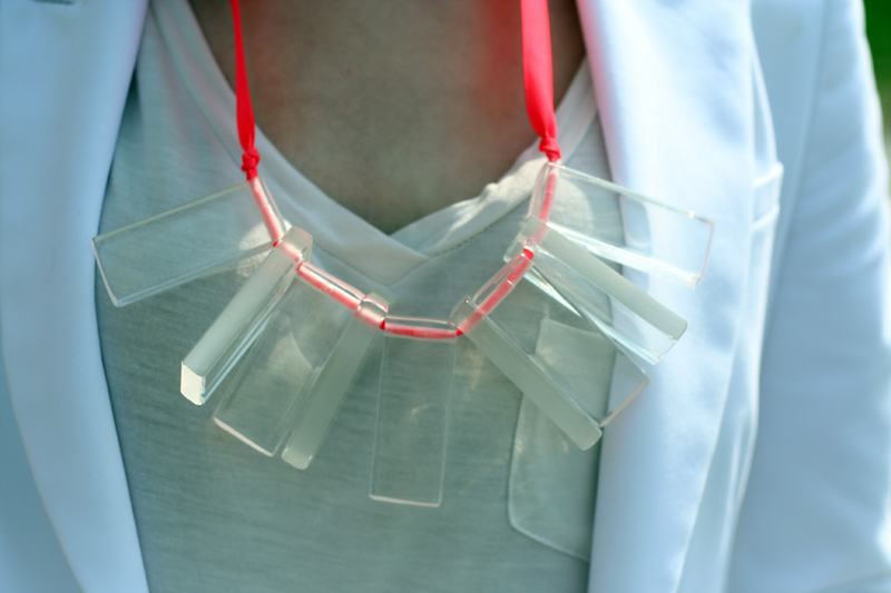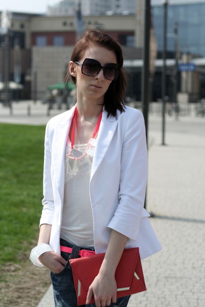 Zatęskniłam za takimi bezpiecznymi stylizacjami składającymi się z dżinsów i marynarki. Tą spokojną stylizację ożywiłam dodatkami fluo. Tak jak w poprzednim poście pisałam o transparentnych koszulach, tak dzisiaj pokazuję Wam mój nowy przeźroczysty naszyjnik oraz bransoletkę. Aktualnie szukam przeźroczystej kopertówki, więc jeśli gdzieś taką widzieliście to dajcie znać.