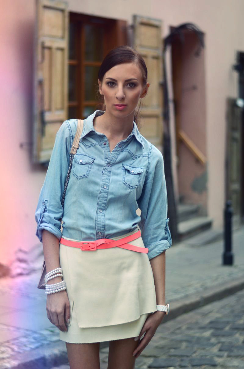 21 lipca 2012 at 14:19Ciekawa stylizacja: koszula dżinsowa i beżowa spódniczka-a jednak do siebie pasuje! I perełki oraz biały zegarek świetnie się 'zgrywają’,wypróbuję ten patent:). Wyglądasz ślicznie w takim delikatnym makijażu:)