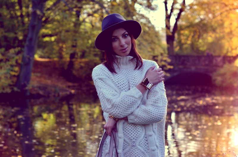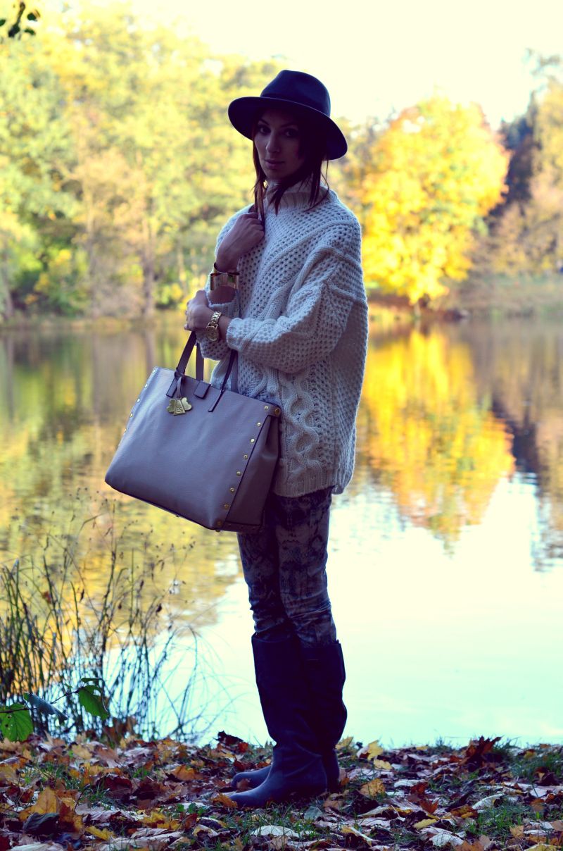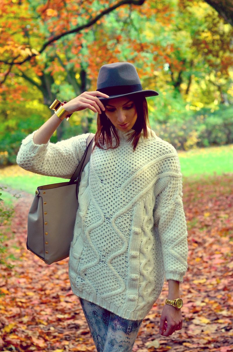 Gruby sweter, zamszowe kozaki ,kapelusz i torba xxl, która pomieści rzeczy na październikowy piknik. Jeszcze ostatnio były wystarczające jeśli chodzi o spacery do parku. Lubię ten przejściowy moment, gdy już jest za zimno na chodzenie w samych sukienkach, a jeszcze za ciepło na grube wełniane kurtki. Szkoda, że taka złota, ciepła, polska jesień trwa tak krótko.