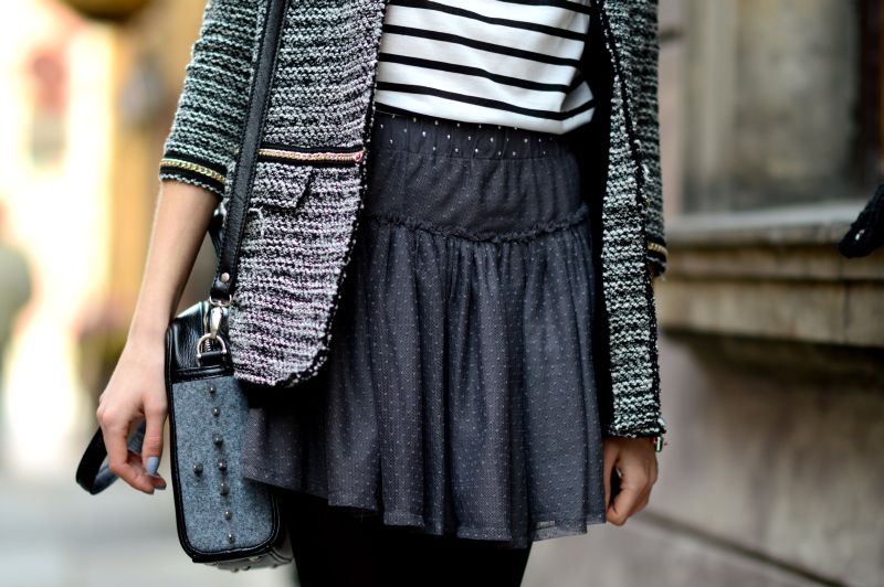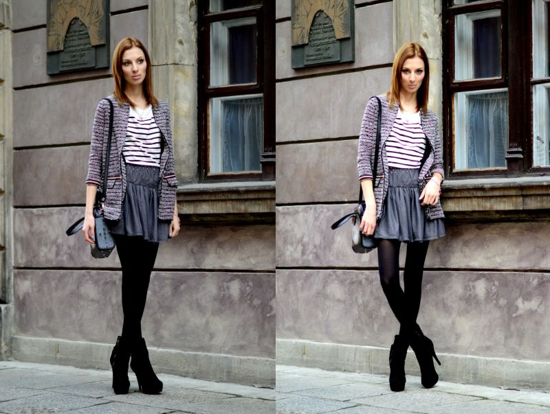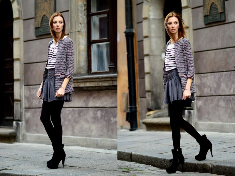 By odjąć jej trochę dziewczęcości- połączyłam ją z kobiecymi botkami na szpilce, żakietem bouclé i „ostrą” torebką.