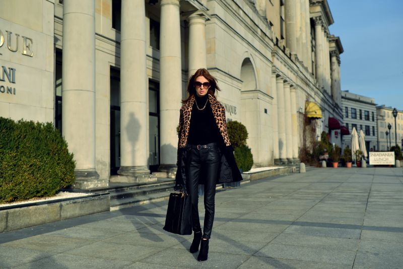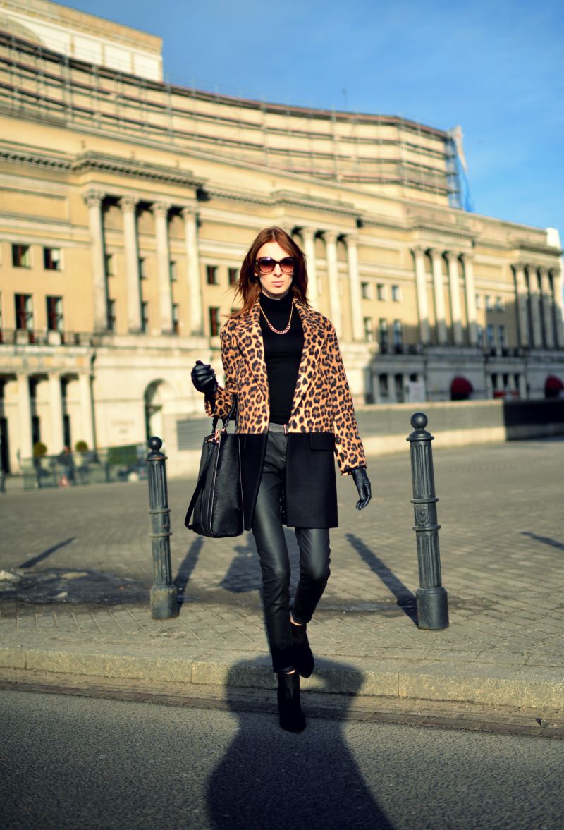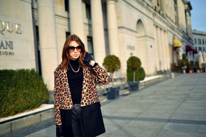 To pierwszy tak ekstrawagancki płaszcz w mojej szafie. Mówi się, że ten wzór jest odważny jak i trudny do noszenia. Ja nigdy nie miałam problemów z „oswojeniem” cętek. Postawiłam na uniwersalną czarną bazę, która sprawdza się zawsze, i złoto, które mogłoby się wydawać tandetne w połączeniu z tym printem, ale według mnie dodaje elegancji i szyku. Tak rzucające się w oczy wzory stanowią ciekawy element, który potrafi ożywić najzwyklejszy set.