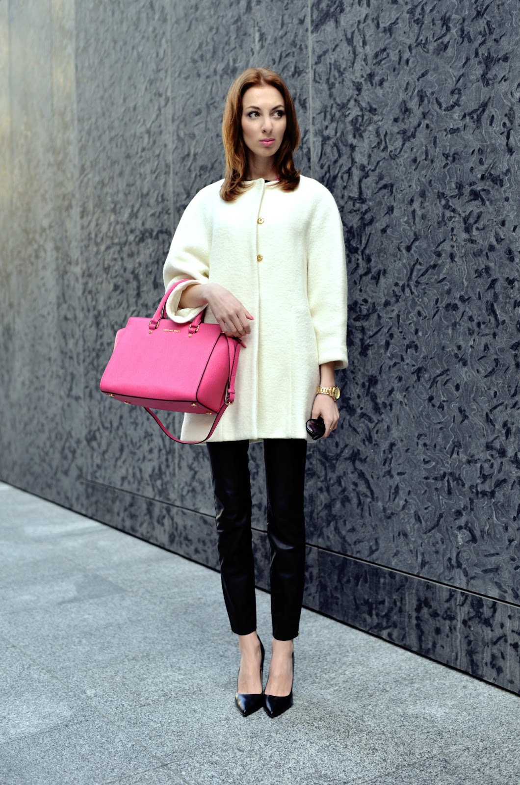 ZARA coat, blouse, pants and heels | CHOIES necklace | MICHAEL KORS bag | TOMMY HILFIGER watch