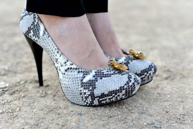 Dzisiaj motywem przewodnim stylizacji będą czaszki. Są obecne na spodniach, bluzce i butach, mimo to, nie ma się wrażenia, że jest czegoś za dużo. Wszystko komponuje się w jedną, spójną całość. Gdyby nie projekt Alexandra McQueena w postaci chusty w 2003 roku, pewnie nadal ten motyw byłby zarezerwowany tylko dla rockmenów. Teraz to idealne odzwierciedlenie stylu glamrock, świetnie uzupełniają look ze skórą i czernią. Żeby trochę załagodzić ten zestaw dobrałam kobiecą torebkę i buty z wykorzystaniem wężowej skóry.