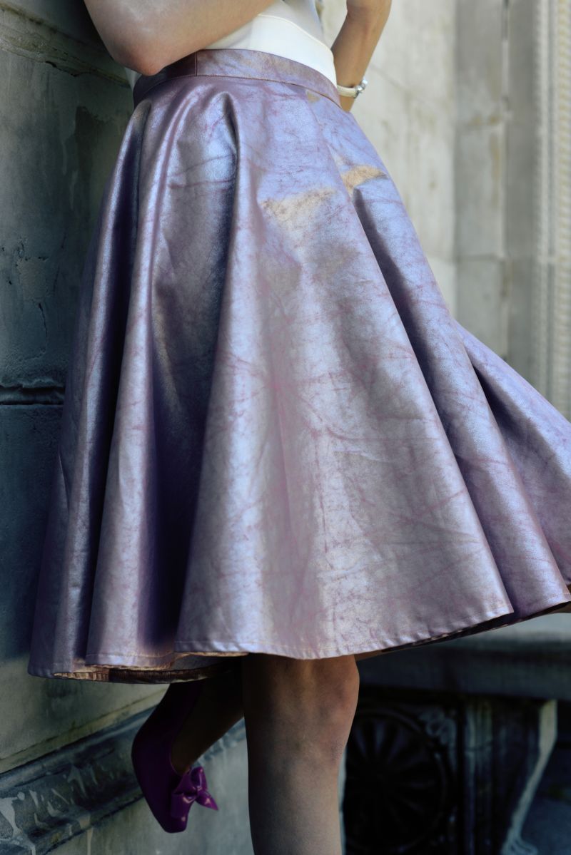 Dziś wybieramy się w podróż kosmiczną. W tym sezonie błysk był na najwyższym poziomie. Metaliczny trend przyjął się na dobre! Doskonale wiedzą o tym: Burberry ze swoim metalicznym płaszczem, Victor&Rolf z plisowaną maxi spódnicą, DKNY i ich ołówkowa spódnica czy Diesel, który na pokazie zaprezentował swoje srebrne szorty z tłoczoną wężową fakturą. Ja sprowadziłam kosmiczny trend na ziemię i wybrałam nie srebro (które też wkrótce zaprezentuje) a pudrowy róż. Spódnica z koła o długości midi jest bardzo kobieca. Kojarzy mi się z francuską elegancką i latami 50. Myślę, że to dopiero początek „romansu” z takim krojem spódnicy u mnie w szafie.