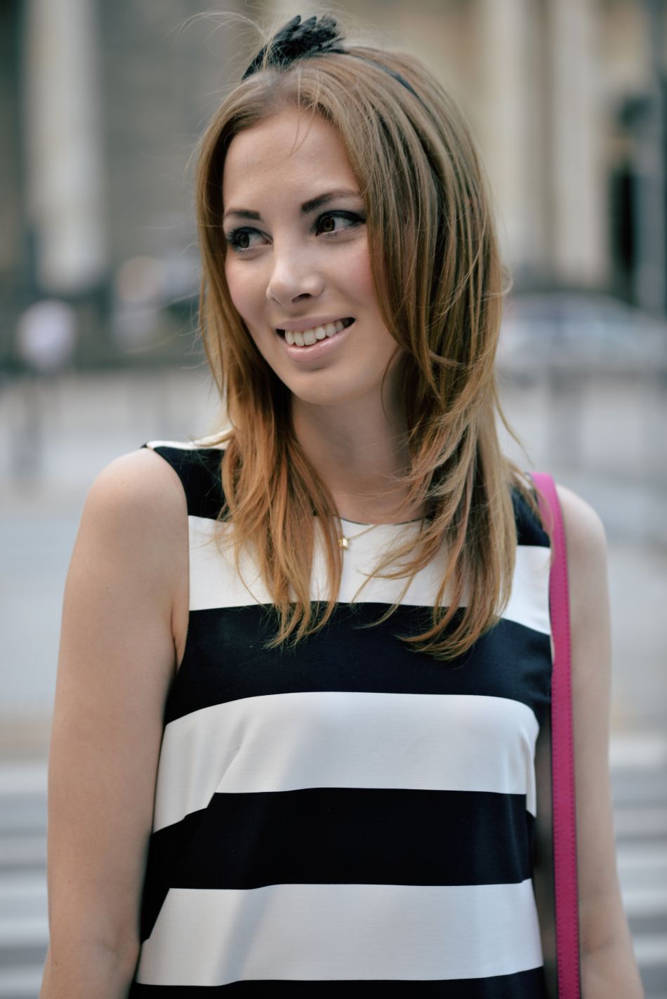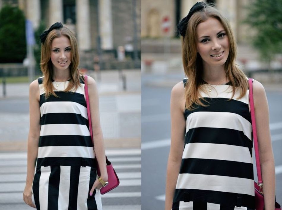 Nie wiem co musiałoby się stać, żebym przestała lubić biel i czerń. Te dwa kolory tworzą według mnie duet idealny. Zazwyczaj nie potrzebują już innego „towarzystwa”, ale z kolorowymi dodatkami potrafią wyglądać jeszcze lepiej. Black&white to klasyka, ale w żaden sposób nie możemy jej nazwać nudną. Wiedziałam, że klawisze namalowane na pasach będą tłem właśnie dla tej stylizacji. Żeby dodać wakacyjnego akcentu, dobrałam torbę w kolorze intensywnego różu- to ona nadaje dziewczęcości i sprawia, że na zestaw nie patrzymy już w kategorii „sztywnej” bieli i czerni.