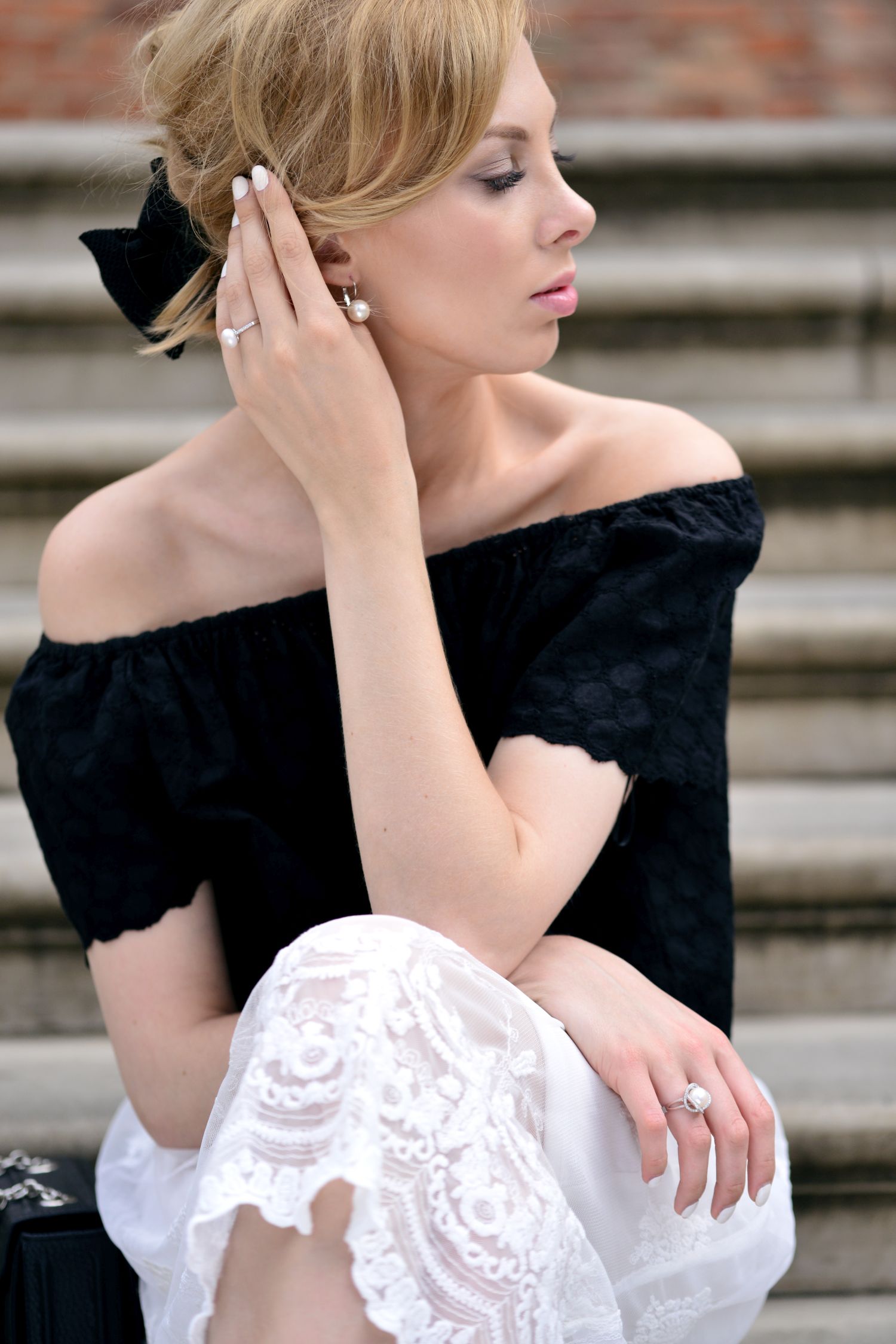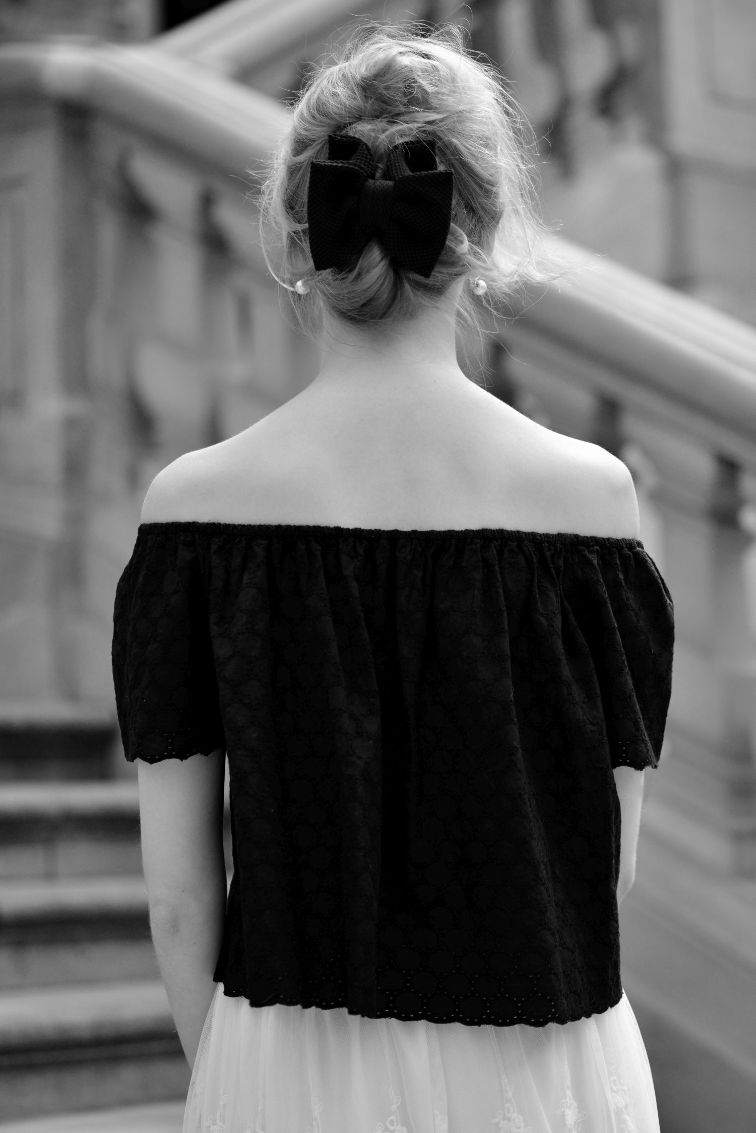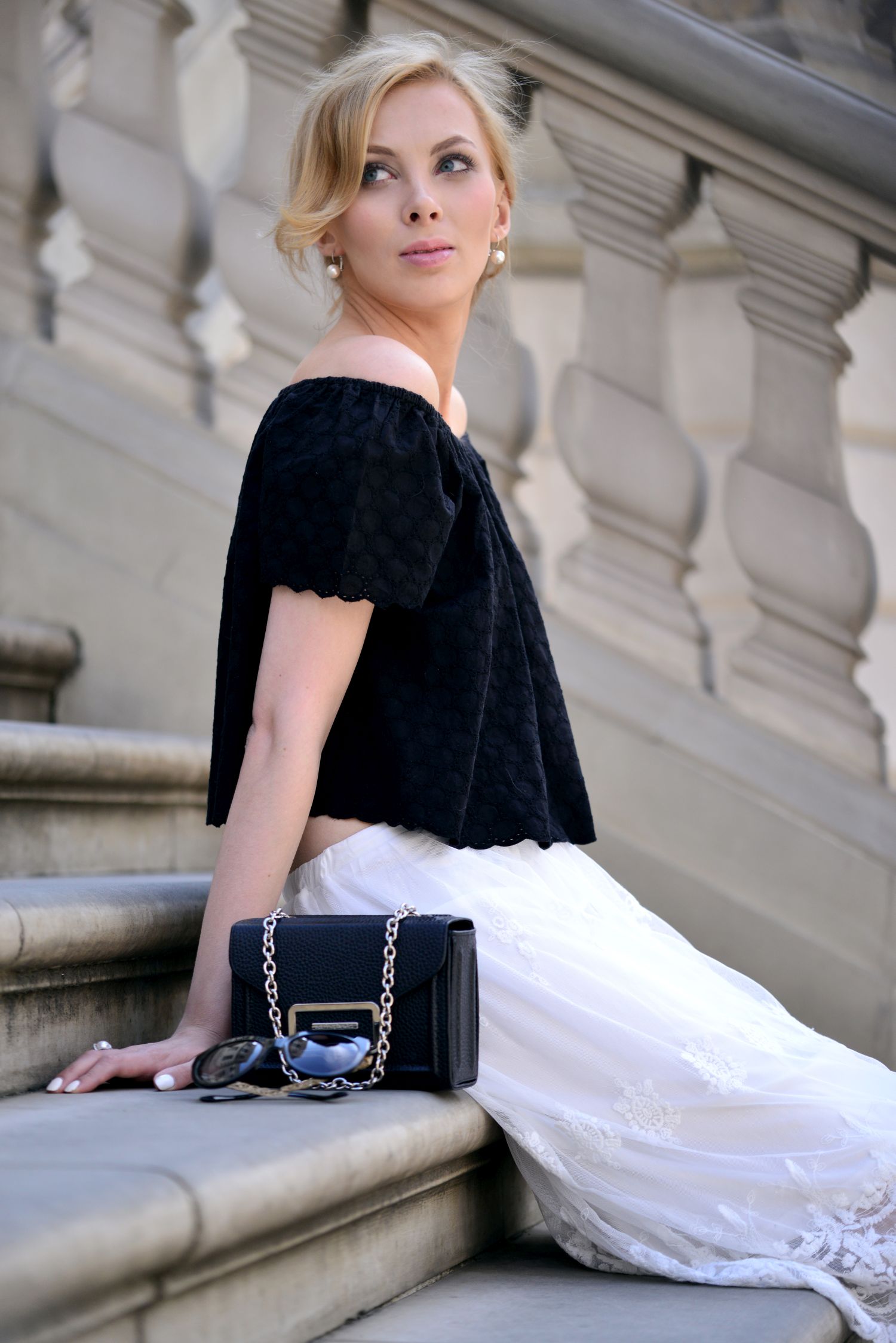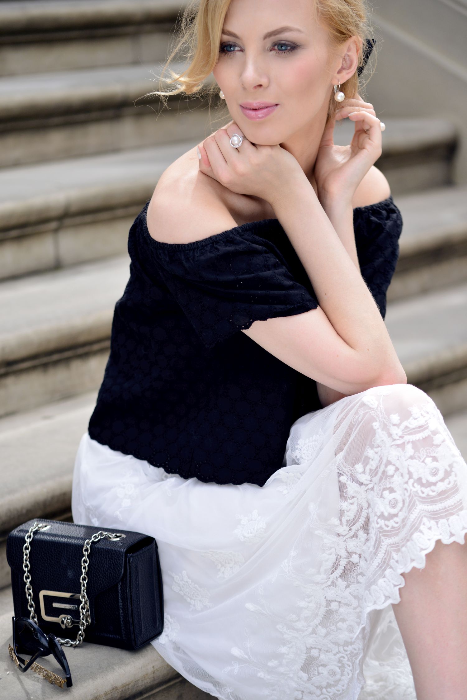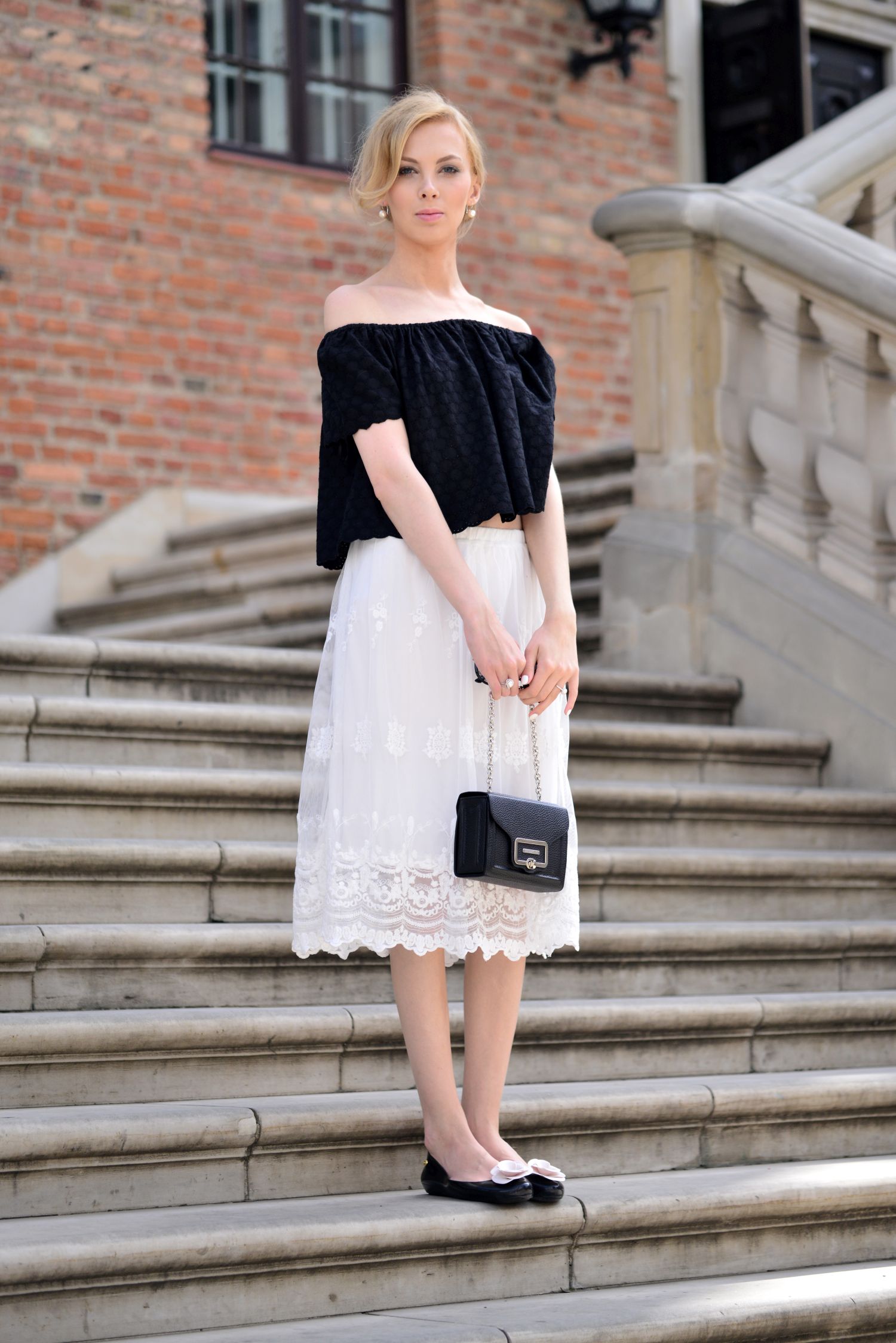 Rano, gdy jechałam robić zdjęcia do tego posta, układałam sobie mniej więcej w głowie co będę chciała Wam w nim napisać. Pomyślałam, że zacznę od nawiązania do Hiszpanii, flamenco i charakterystycznego dekoltu w bluzce oraz moich dwóch ulubionych kolorach, które przetaczają się przez bloga nieustannie. Jednak w czasie zdjęć jedna przypadkowa rozmowa sprawiła, że międzynarodowych powiązań będzie więcej:) To wszystko za sprawą przemiłego starszego Pana z Wielkiej Brytanii, który oprowadzał grupę turystów po muzeum Chopina, obok którego robiłam owe zdjęcia. Pan przechodząc obok mnie, zapytał czy jestem z Francji, ponieważ strój który mam na sobie idealnie wpisuje się w klimat Paryża i Champs-Élysées. Nawet nie wiecie jak zrobiło mi się miło. Po krótkiej rozmowie mężczyzna życzył mi udanych zdjęć, a ja z zaczerwienionymi policzkami podziękowałam i wróciłam do pozowania. Jakby tego było mało, to pod koniec zdjęć, dwie turystki z Japonii zapytały, czy mogą sobie zrobić ze mną zdjęcie:) Swoją drogą zawsze, gdy jestem w okolicach muzeum Chopina to zaskakuje mnie ogromna liczba turystów z Azji odwiedzających muzeum. Mam wrażenie, że jest ich więcej niż Polaków. Na koniec wrócę jeszcze do mojej czarno- białej stylizacji, to w końcu o niej miałam pisać. Niezależnie od tego z jakim krajem Wam się skojarzy, mam nadzieję, że przypadnie Wam do gustu. Na szczególną uwagę zasługuje tutaj koronkowa spódnica, która mi osobiście kojarzy się z…. Polską:)!
