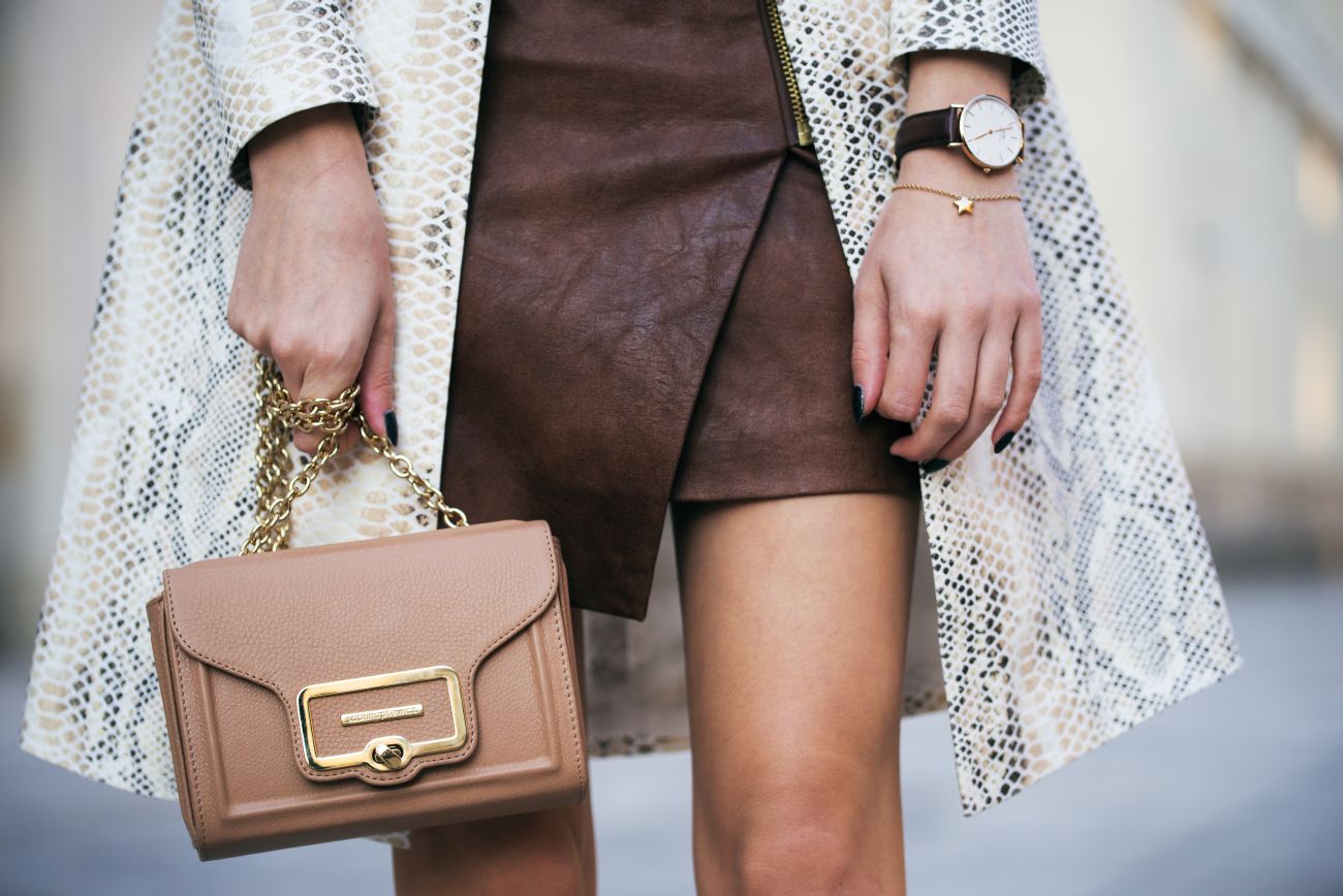 Płaszcz na pierwszy rzut oka wygląda na skórzany, w dotyku również sprawia takie wrażenie, jest dość sztywny i nigdy nie powiedziałabym, że aż w 93% składa się z bawełny, a jednak! W moim przekonaniu to on dodaje całości iskry i sprawia, że elegancka stylizacja zyskuje odpowiedniego pazura. Wisienką na torcie są natomiast buty, których powierzchnia przypomina łuskę jaszczurki. Taki efekt uzyskuje się w momencie laserowego cięcia skóry.