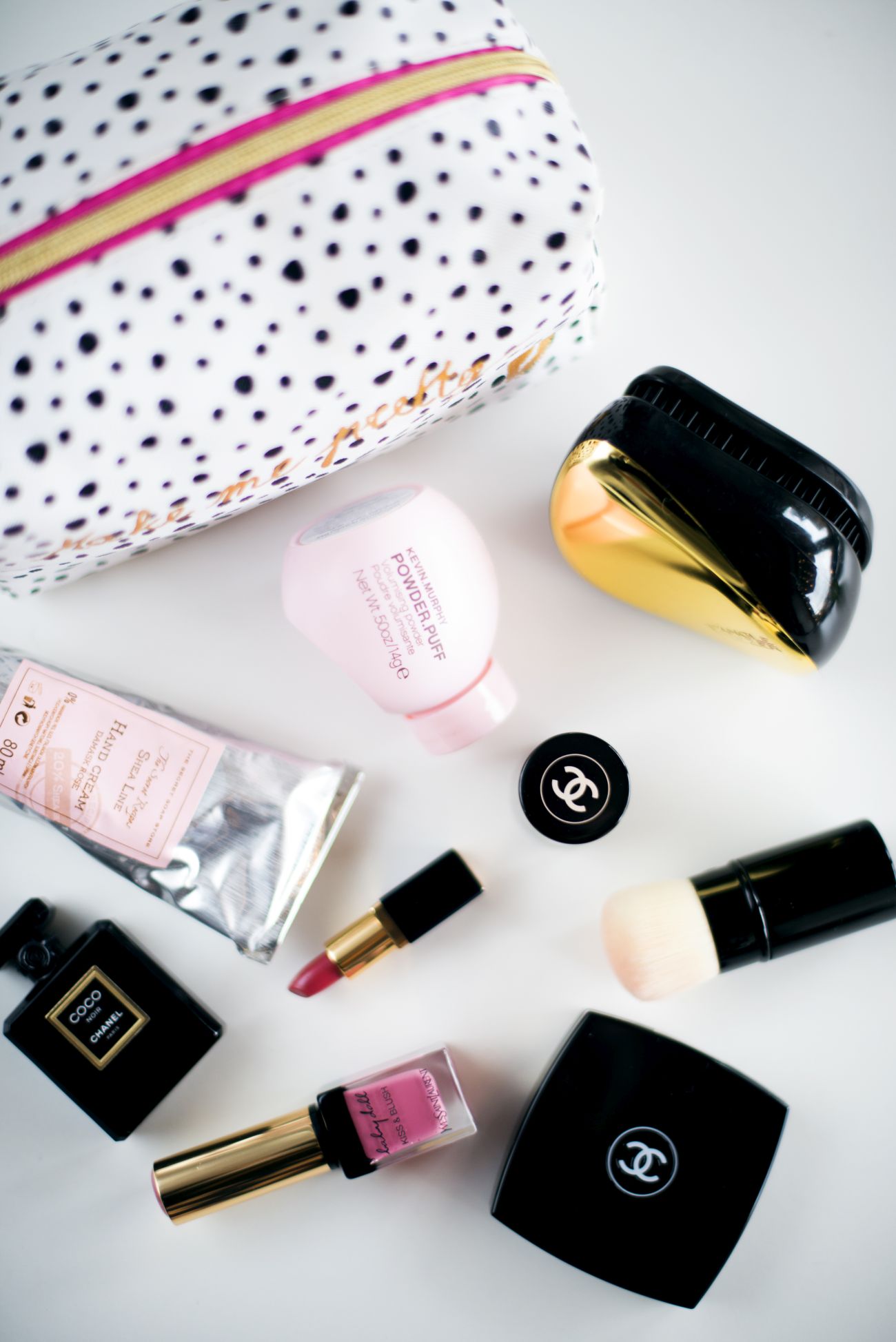 Moja kosmetyczka, którą mam zawsze przy sobie składa się z kilku elementów. Pierwszym z nich są miniaturowe perfumy, którymi mogę przedłużyć ulubiony zapach w ciągu dnia. Oczywiście jest w niej miejsce na lusterko, puder oraz mały pędzel, by poprawić makijaż. Do torebki zabieram również produkt 2 w 1 od YSL -róż ze szminką- zdecydowanie oszczędność miejsca. Mini szminka przydaje się przed nagłymi ewentualnymi spotkaniami. Skoro mamy już wszystko do poprawy makijażu to trzeba zadbać o włosy- szczotka i puder, pomagają okiełznać bałagan, jaki może powstać na głowie w ciągu dnia. Na koniec oczywiście chusteczki oraz krem do rąk, dzięki któremu moje dłonie mimo niskich temperatur wyglądają dobrze.