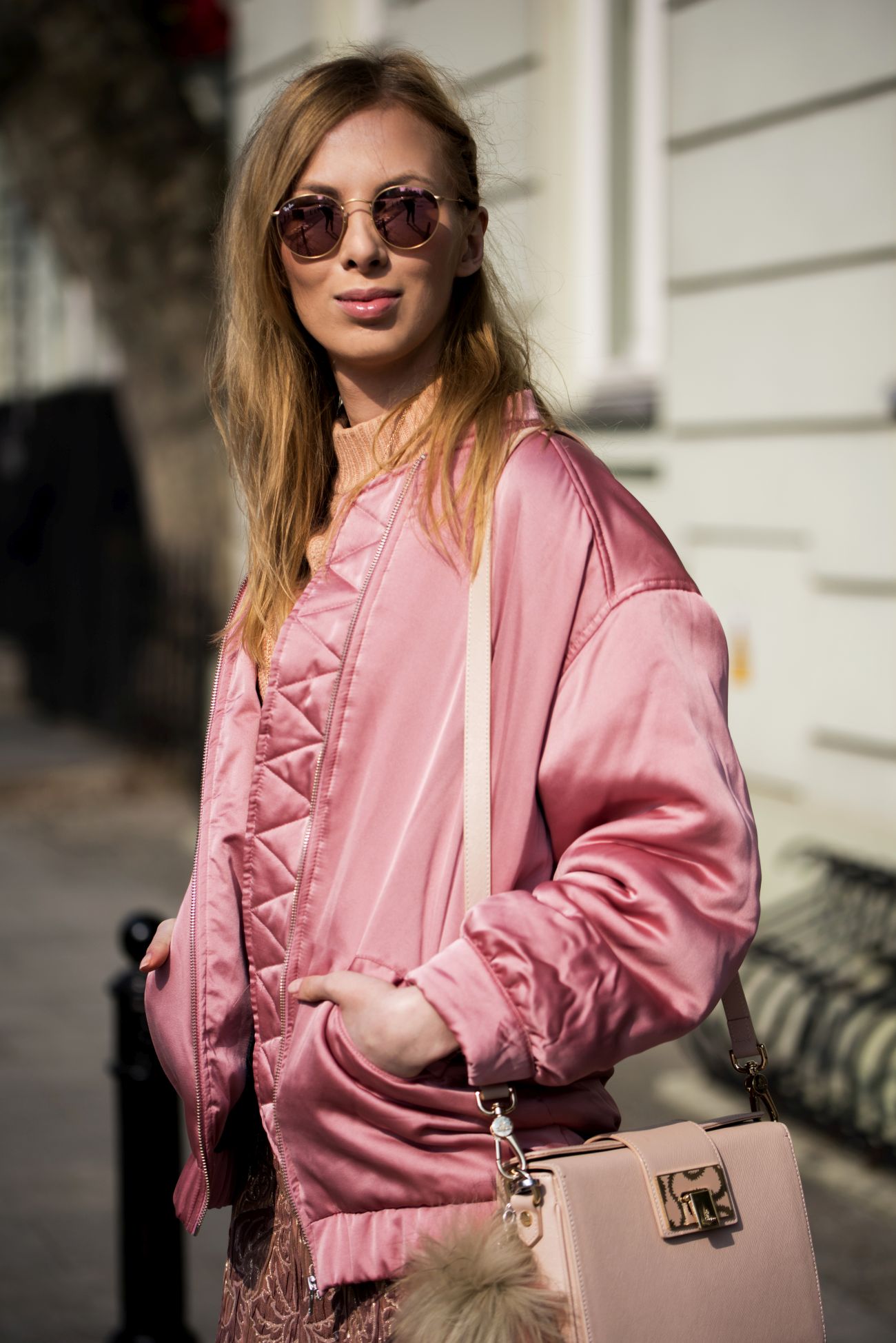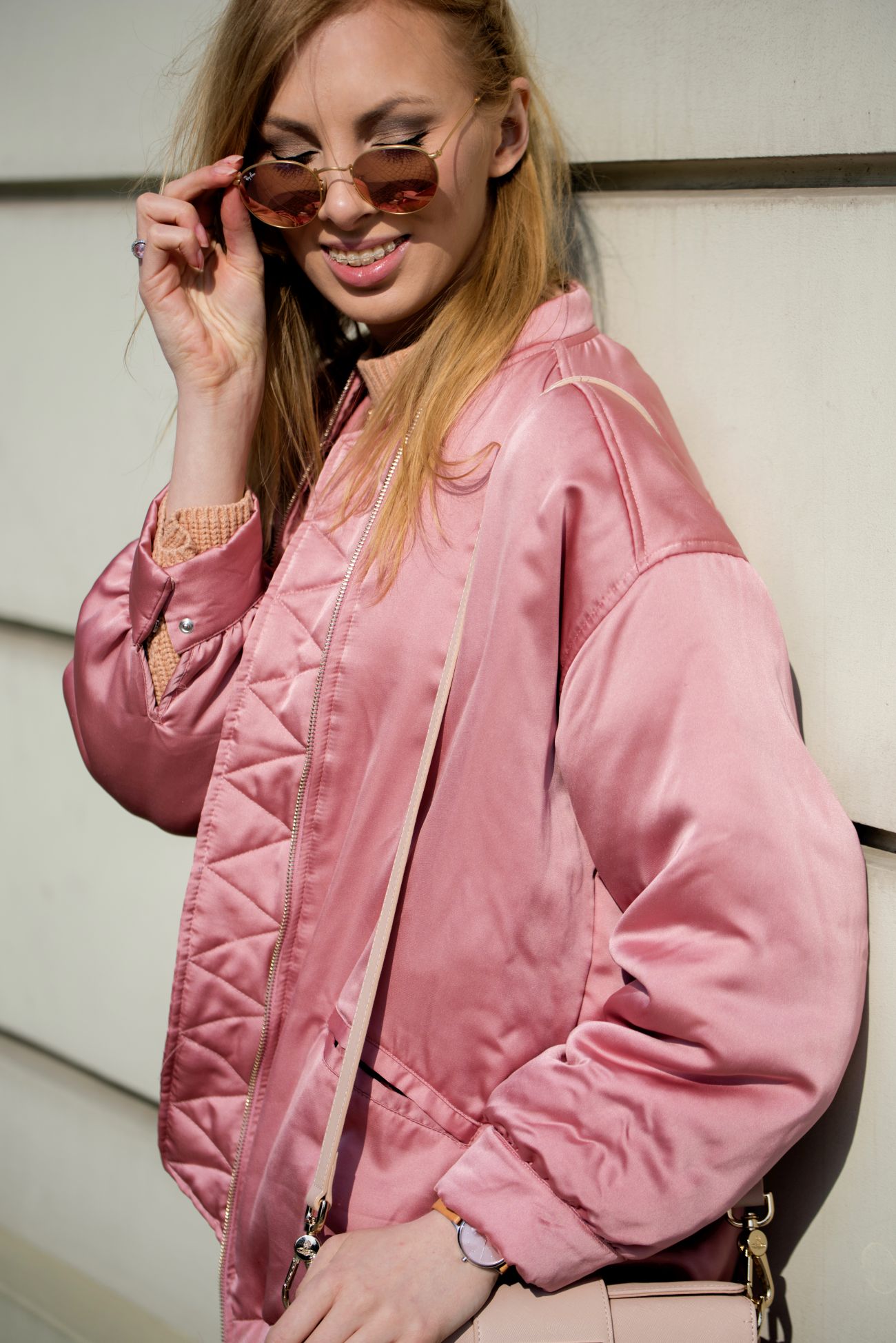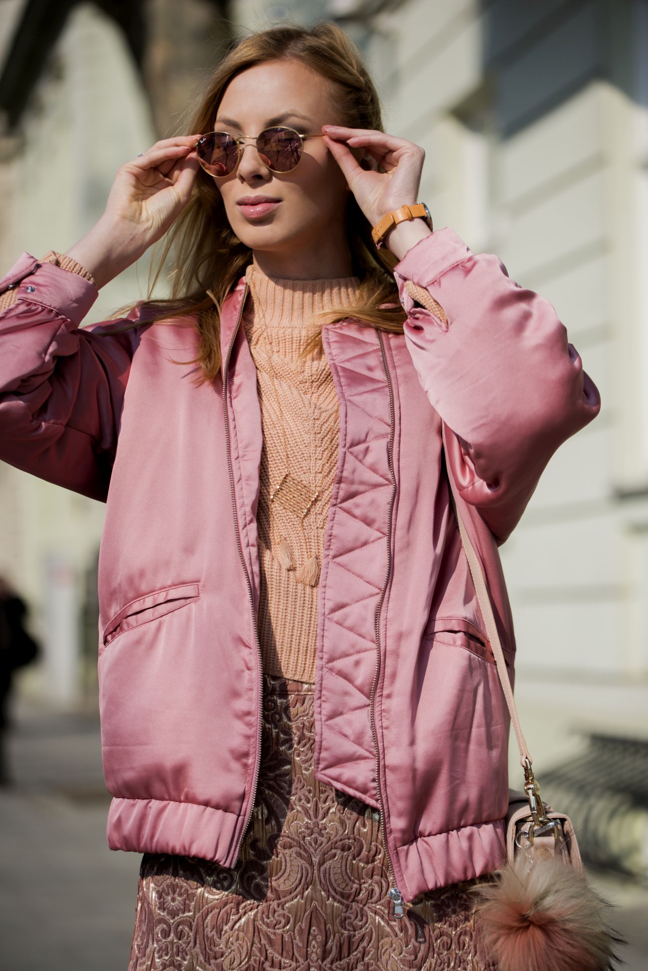Czas zapomnieć o zimie i szaroburych kolorach, w końcu kalendarz wskazał już pierwszy dzień wiosny! Skoro jesteśmy już przy najpiękniejszej porze roku to trzeba w nią wejść z różowym przytupem. Jak widzicie, nie ograniczyłam się wyłącznie do jednej rzeczy w tym kolorze. Cała stylizacja oparta jest na jasnych, pastelowych barwach, ale ostateczny efekt nie jest przesłodzony. W związku z tym mogłam pobawić się fakturami łącząc prążkowany golf z żakardową spódnicą i dobierając do nich kolejny już w mojej kolekcji bomber. Całość uzupełniły wycięte po bokach jazzówki. To w ostatnim czasie mój ulubiony rodzaj butów- wygodne, ale nadal kobiece!