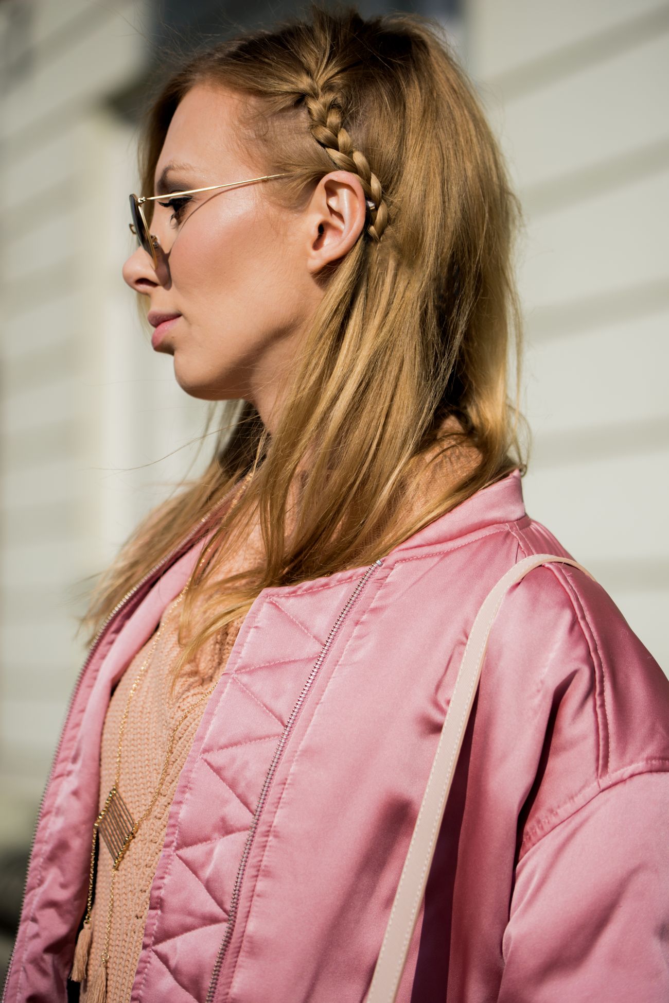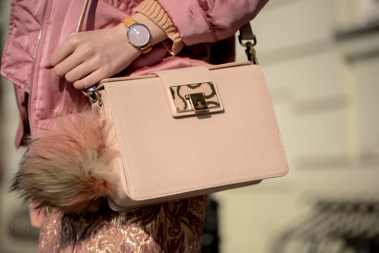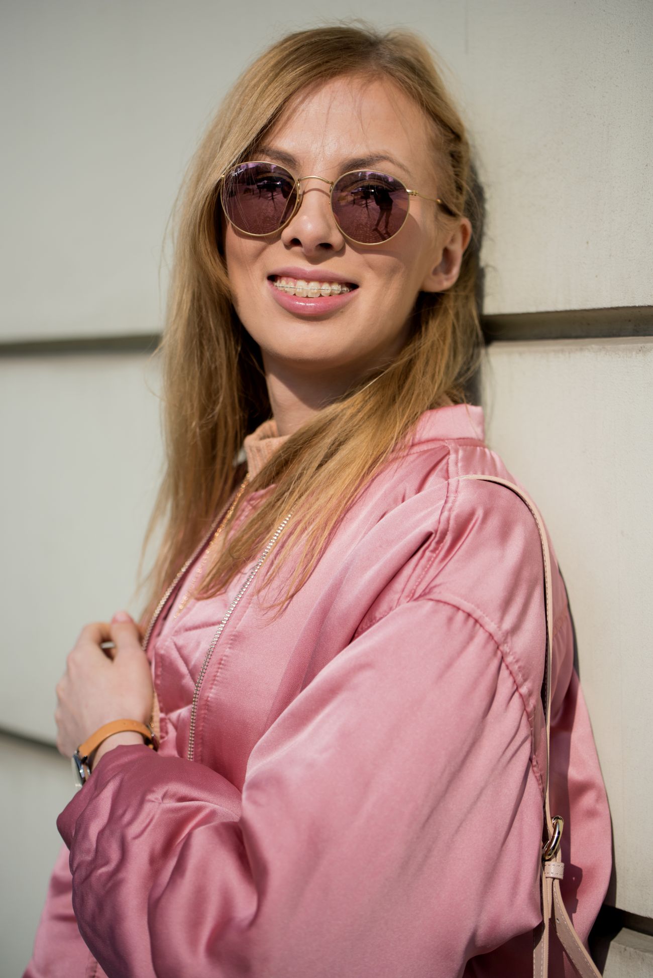 Czas zapomnieć o zimie i szaroburych kolorach, w końcu kalendarz wskazał już pierwszy dzień wiosny! Skoro jesteśmy już przy najpiękniejszej porze roku to trzeba w nią wejść z różowym przytupem. Jak widzicie, nie ograniczyłam się wyłącznie do jednej rzeczy w tym kolorze. Cała stylizacja oparta jest na jasnych, pastelowych barwach, ale ostateczny efekt nie jest przesłodzony. W związku z tym mogłam pobawić się fakturami łącząc prążkowany golf z żakardową spódnicą i dobierając do nich kolejny już w mojej kolekcji bomber. Całość uzupełniły wycięte po bokach jazzówki. To w ostatnim czasie mój ulubiony rodzaj butów- wygodne, ale nadal kobiece!