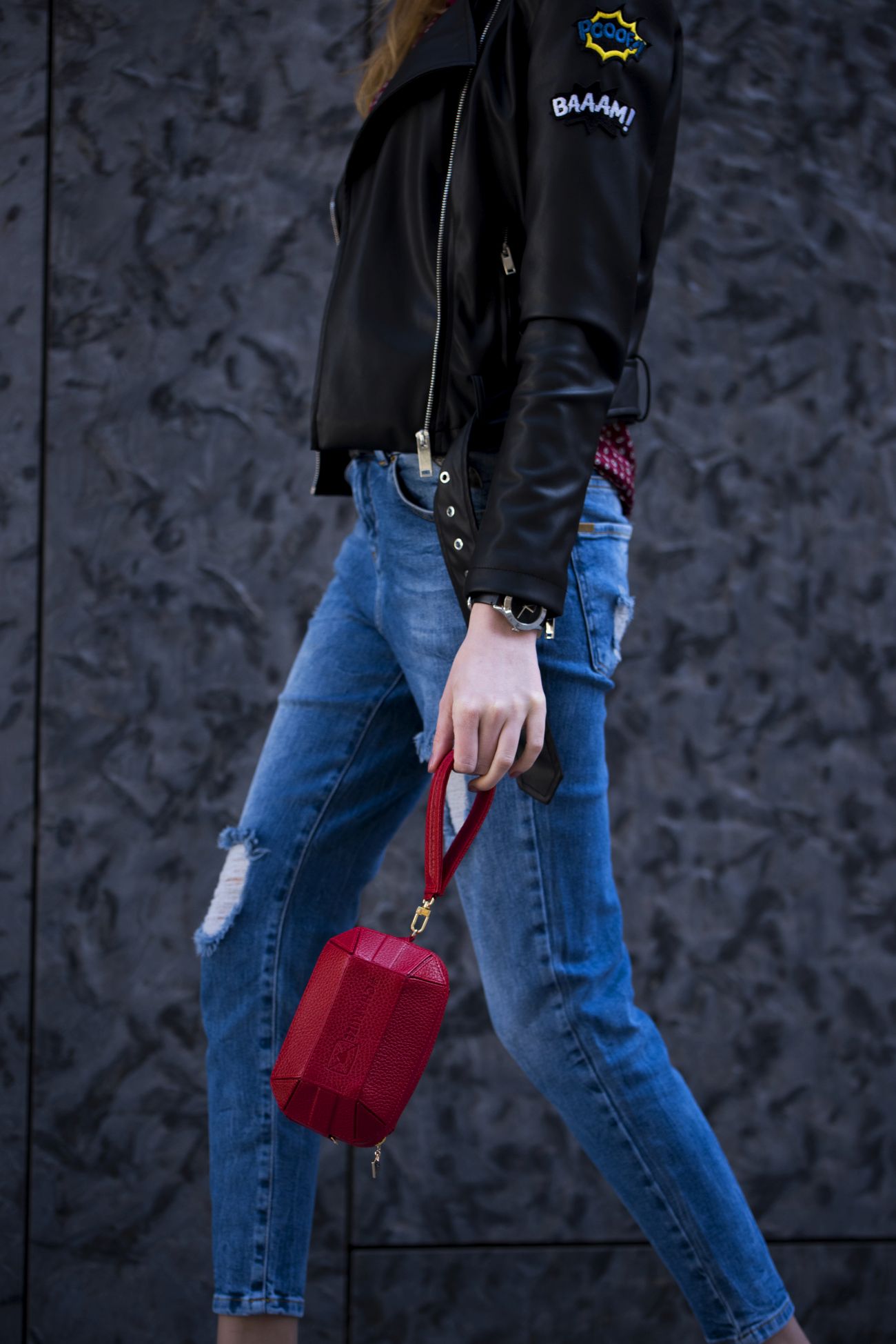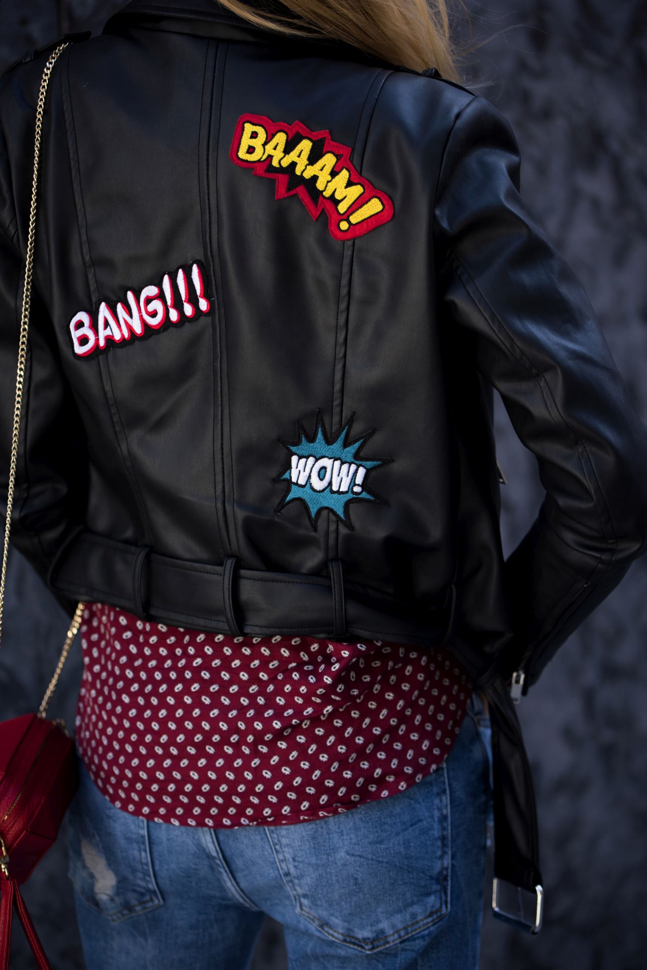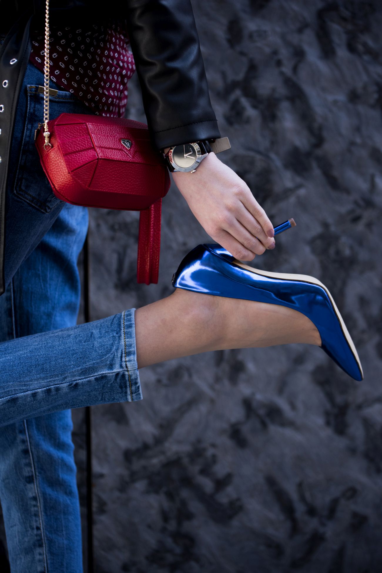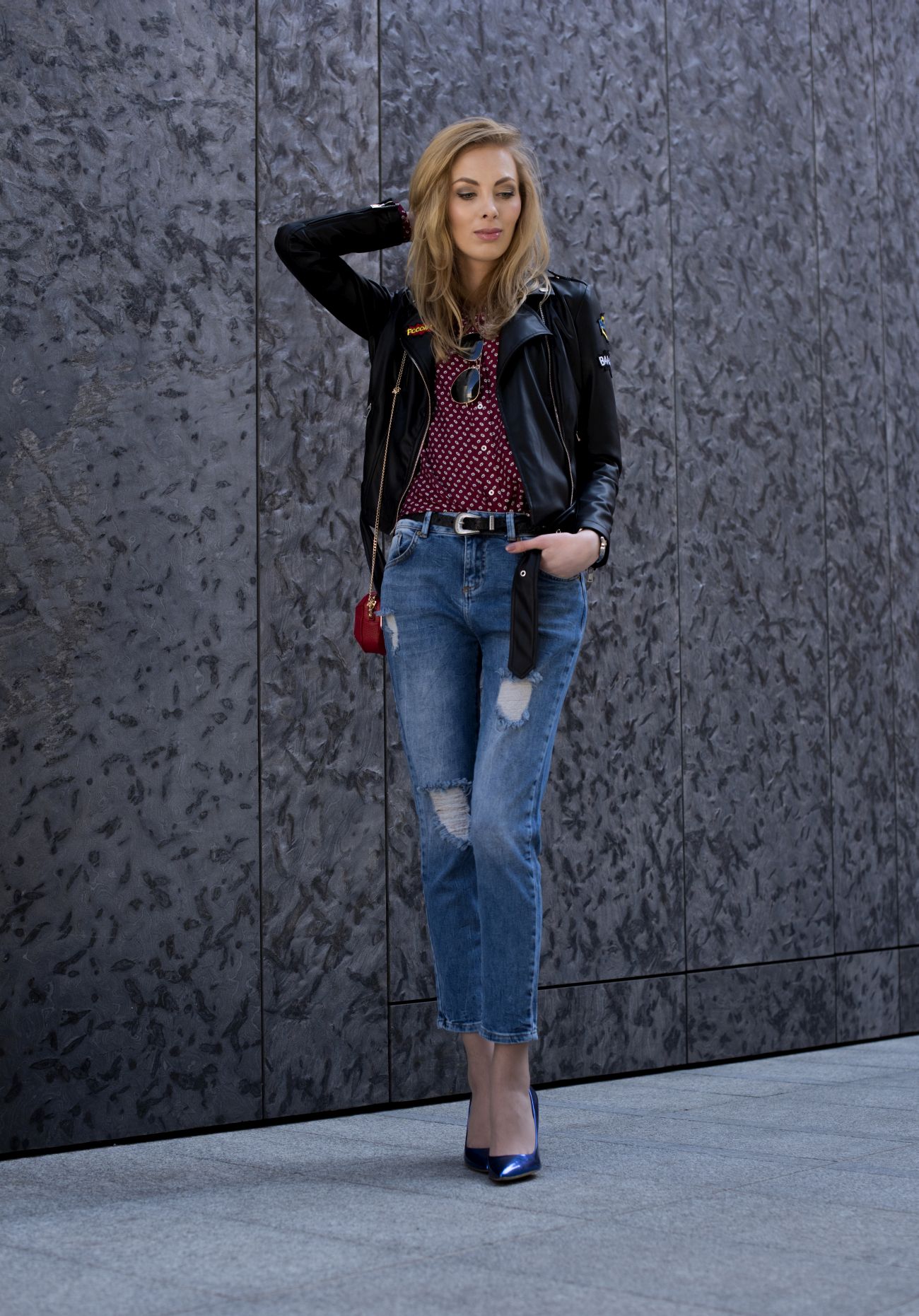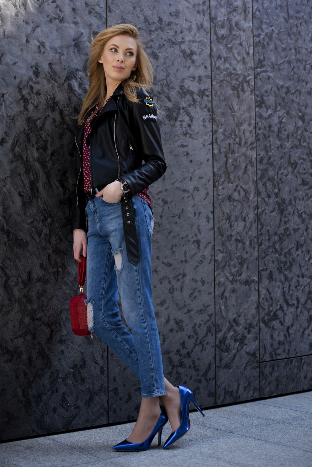 W końcu nie mówimy o zwykłych, klasycznych czółenkach, tylko metalicznych, przyciągających wzrok chabrowych szpilkach! Poza tym w zestawieniu z przecieranymi jeansami, które mi kojarzą się z wracającymi do łask ‘mom jeans’ i ramoneską pokrytą naszywkami (hit tej wiosny, na który koniecznie musicie zwrócić uwagę!), wspomniane szpilki i koszula nabierają luźniejszego, wręcz dziewczęcego charakteru, tworząc casualowy zestaw w sam raz na spotkania z przyjaciółmi, czy wyjście do kina.