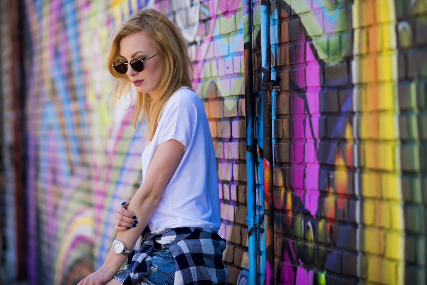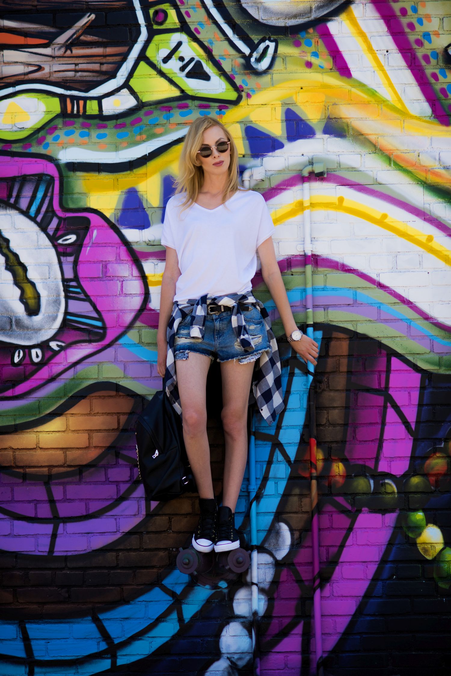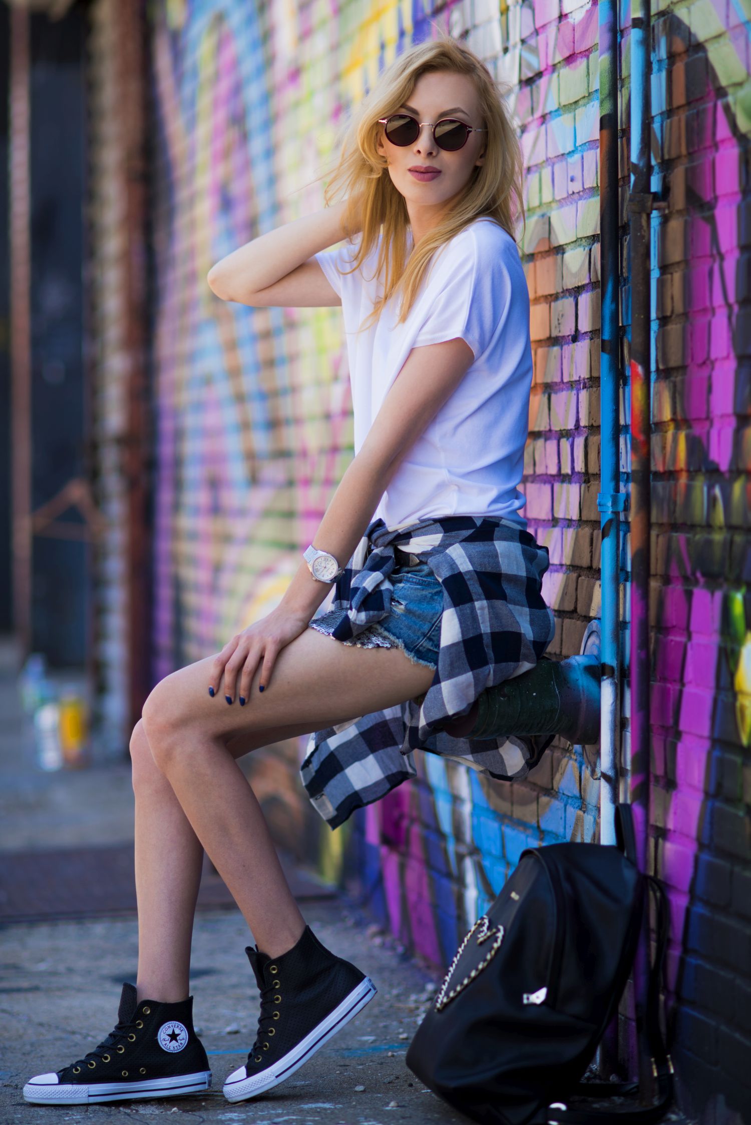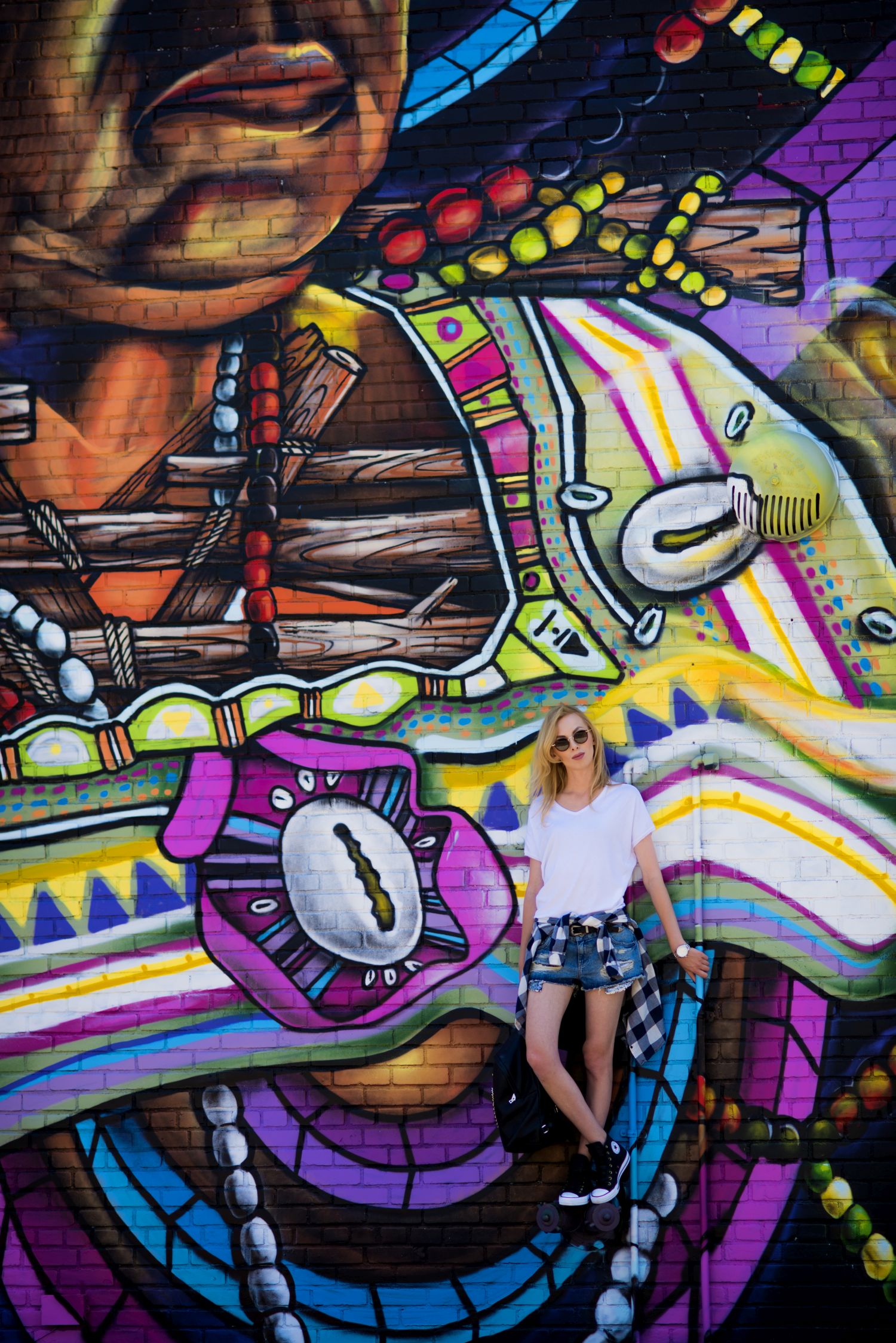 Nie mogłam przegapić takiej okazji i nie zrobić zdjęć w tak pięknym miejscu. Poszczególne murale na tyle mnie urzekły, że szykuje dla Was post z tymi, które najbardziej mi się spodobały. Poniżej znajdziecie natomiast moją stylizację. Do takiego miejsca zdecydowanie przypasował mi młodzieżowy zestaw z szortami, skórzanymi Conversami i plecakiem. Całość uzupełniła przewiązana w pasie koszula w kratę i okulary stylizowane na lenonki. Mam nadzieję, że Wam się spodoba:)!