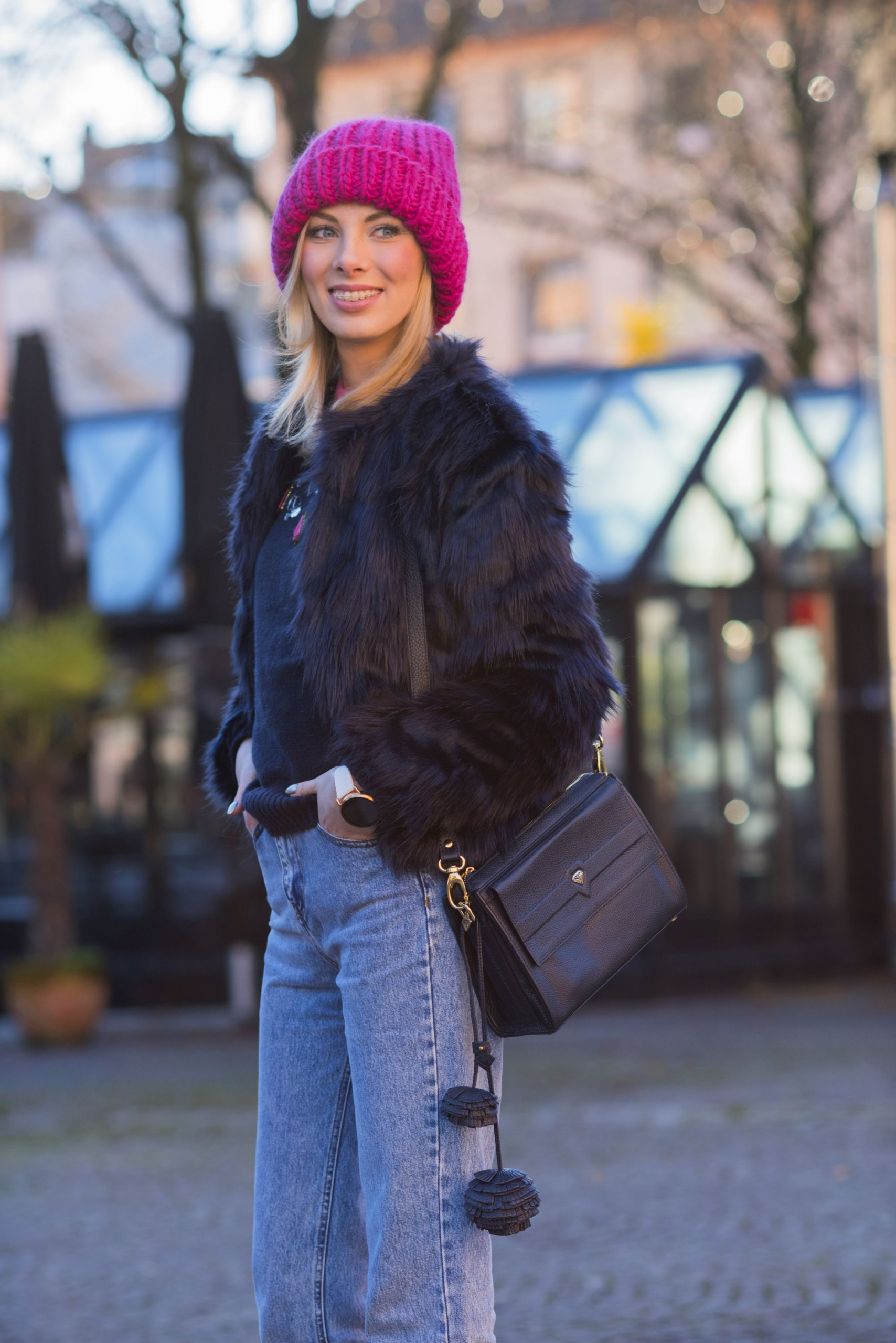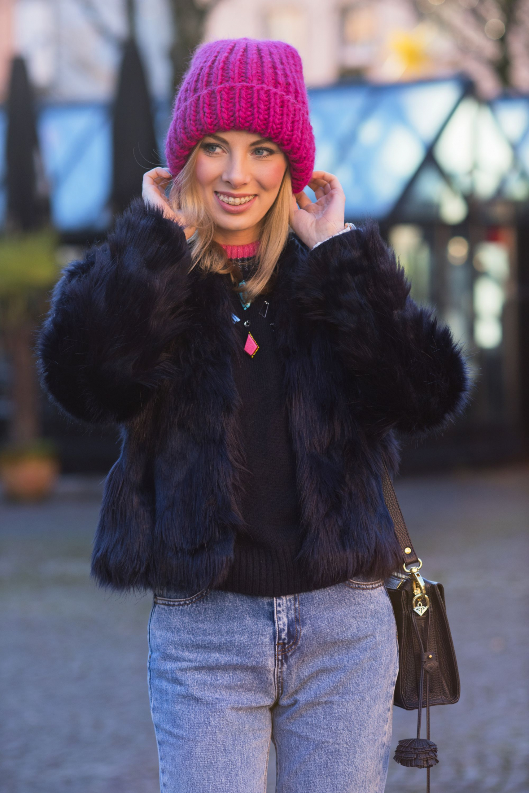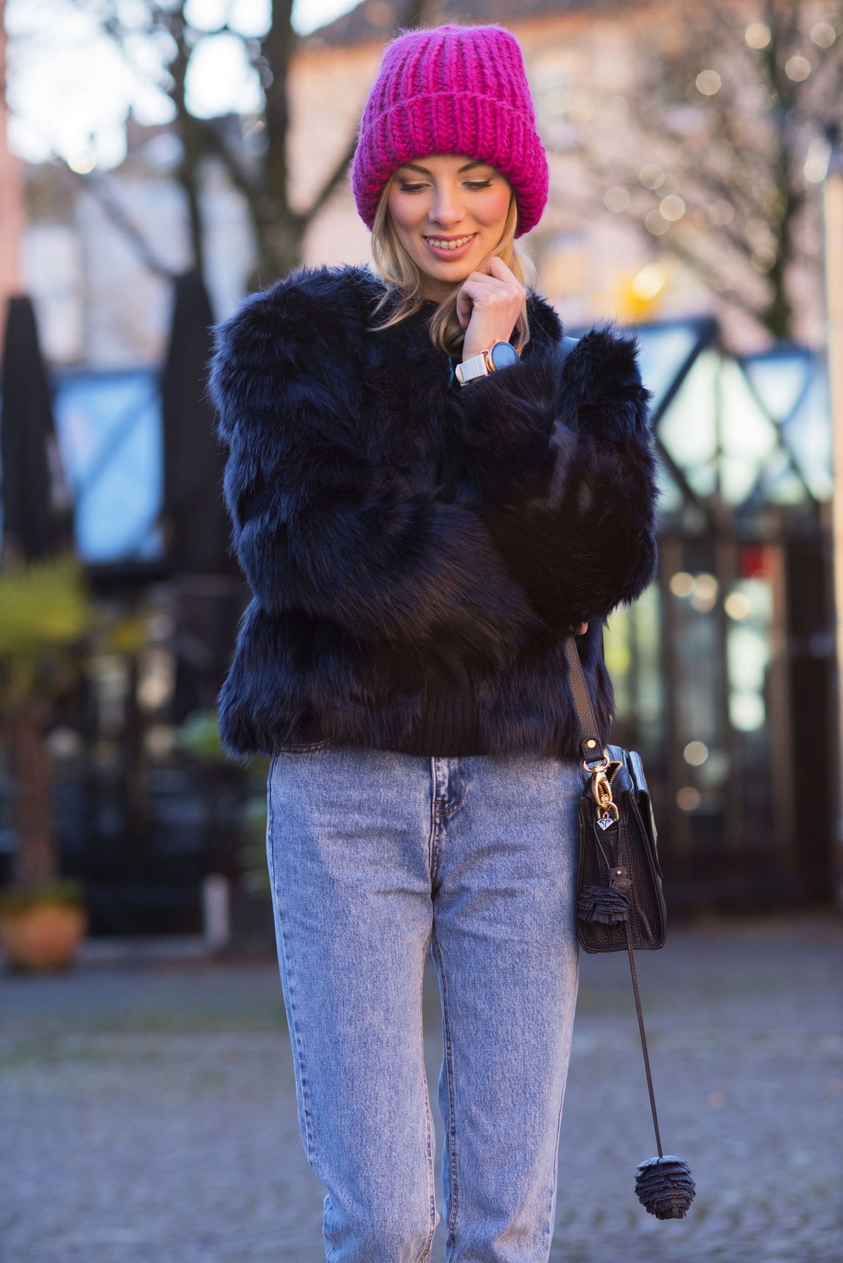 Kompletując tę stylizację nie przypuszczałam, że wraz z grubą, różową czapką z alpaki stworzy tak zgrany duet. W połączeniu z mom jeans mamy już całkiem niezłe trio! Przed Świętami widzieliście już mój granatowy total look z wełnianym płaszczem, teraz kolejne granatowe okrycie wierzchnie – ten kolor naprawdę coraz mocniej wkrada się do mojej szafy. W tym roku na pewno nie zabraknie go na blogu.