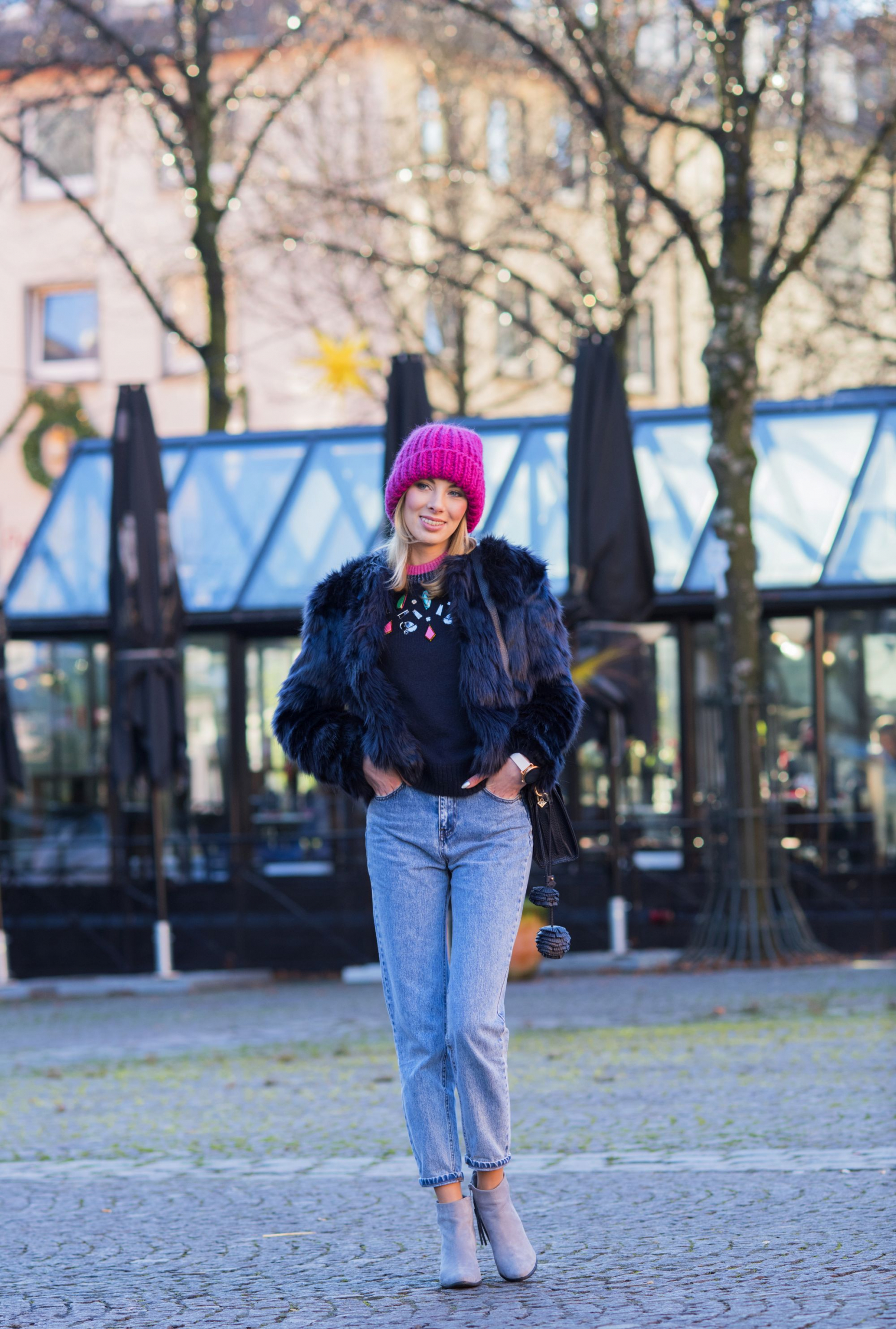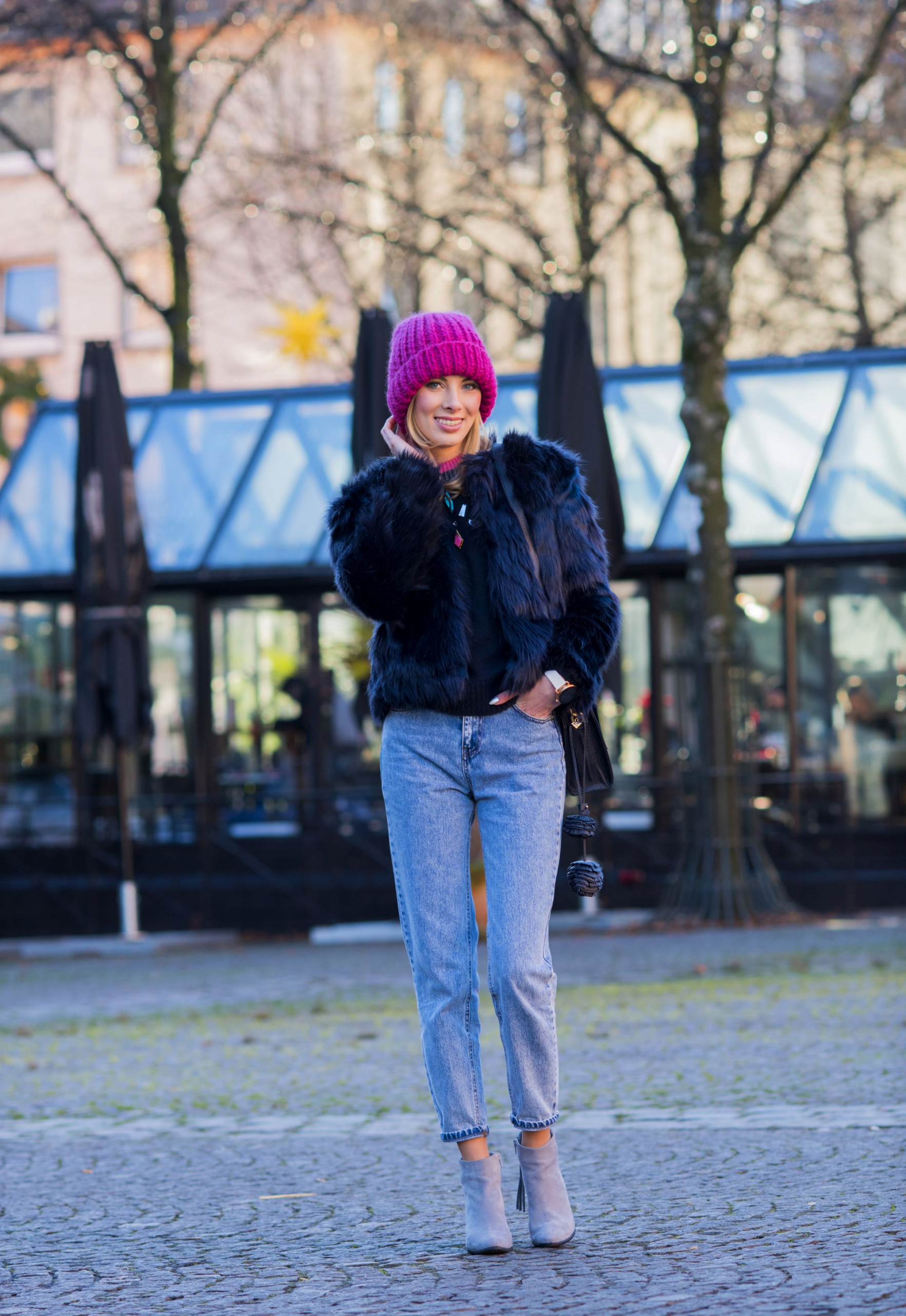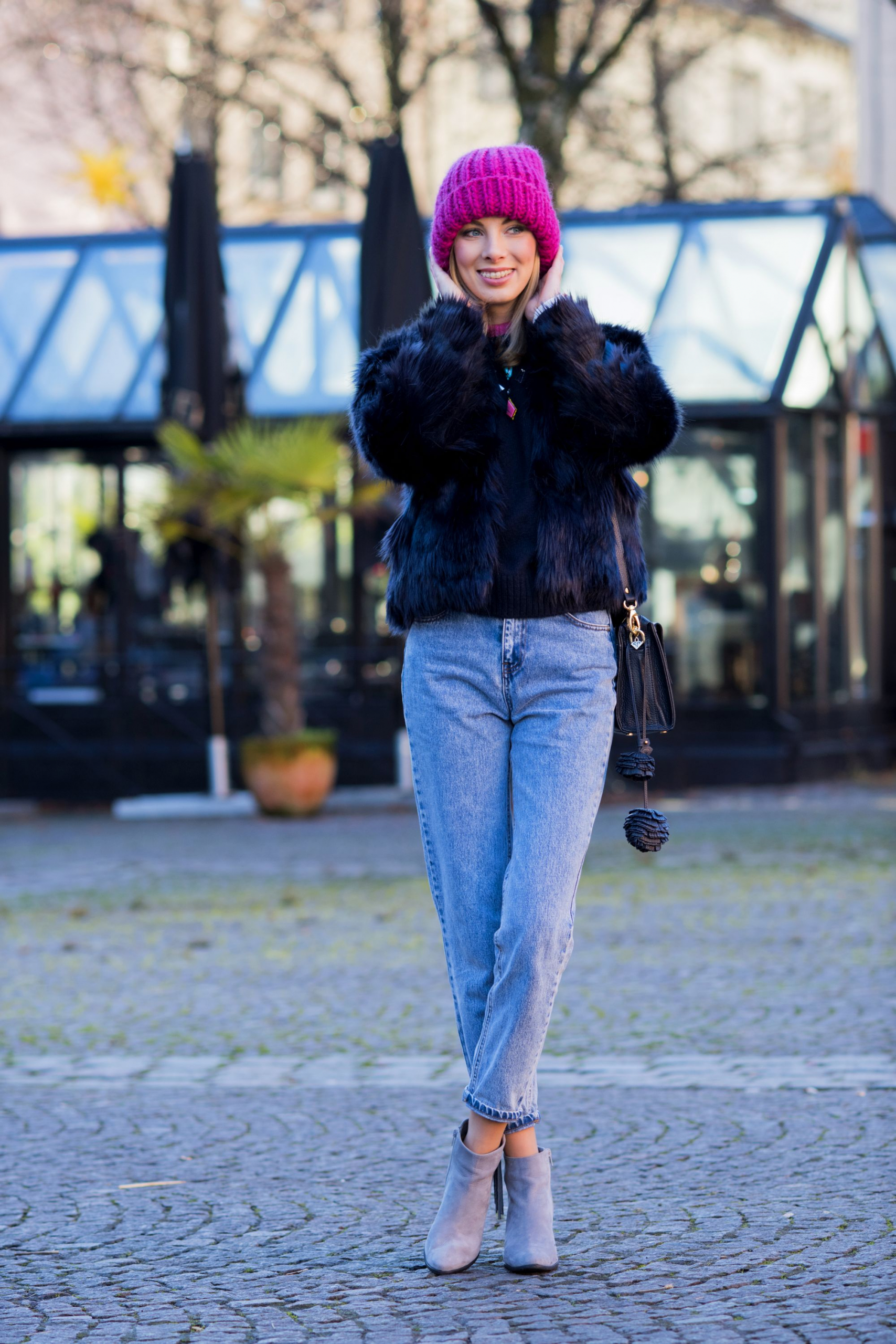Kompletując tę stylizację nie przypuszczałam, że wraz z grubą, różową czapką z alpaki stworzy tak zgrany duet. W połączeniu z mom jeans mamy już całkiem niezłe trio! Przed Świętami widzieliście już mój granatowy total look z wełnianym płaszczem, teraz kolejne granatowe okrycie wierzchnie – ten kolor naprawdę coraz mocniej wkrada się do mojej szafy. W tym roku na pewno nie zabraknie go na blogu.