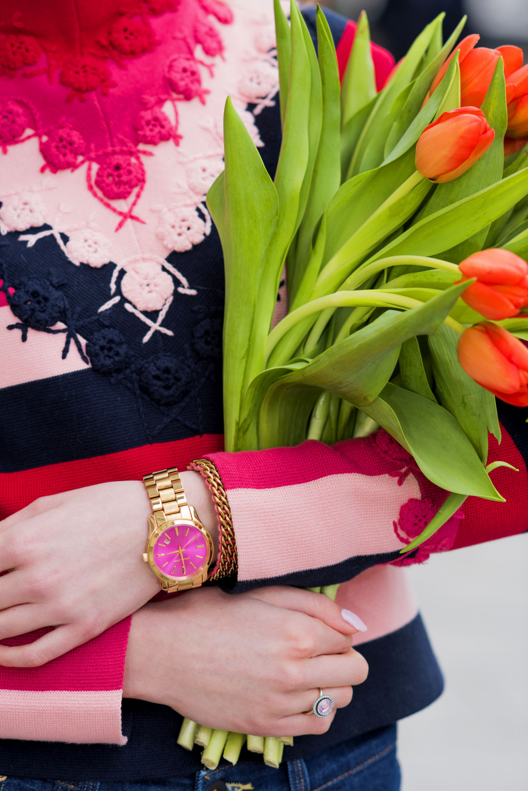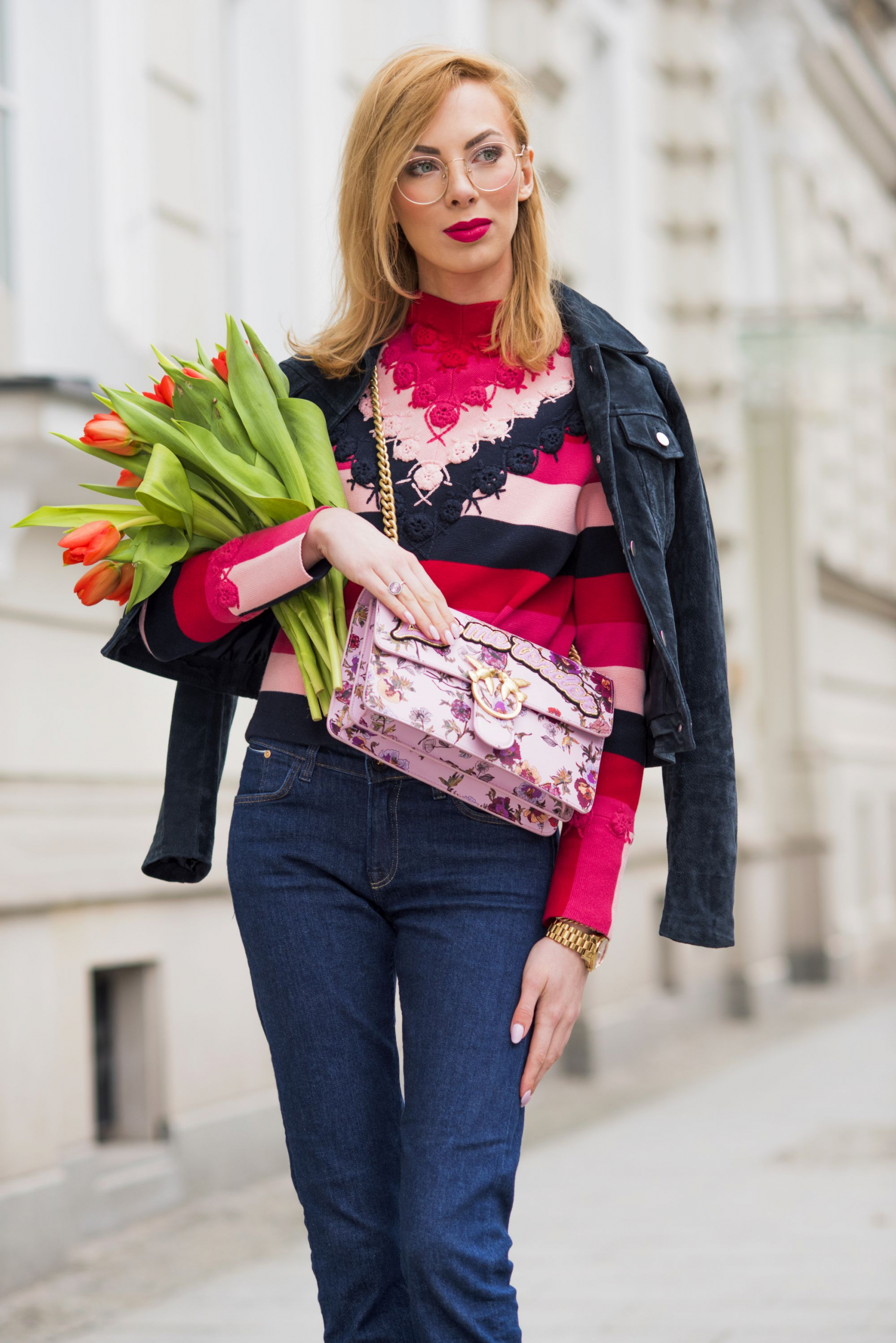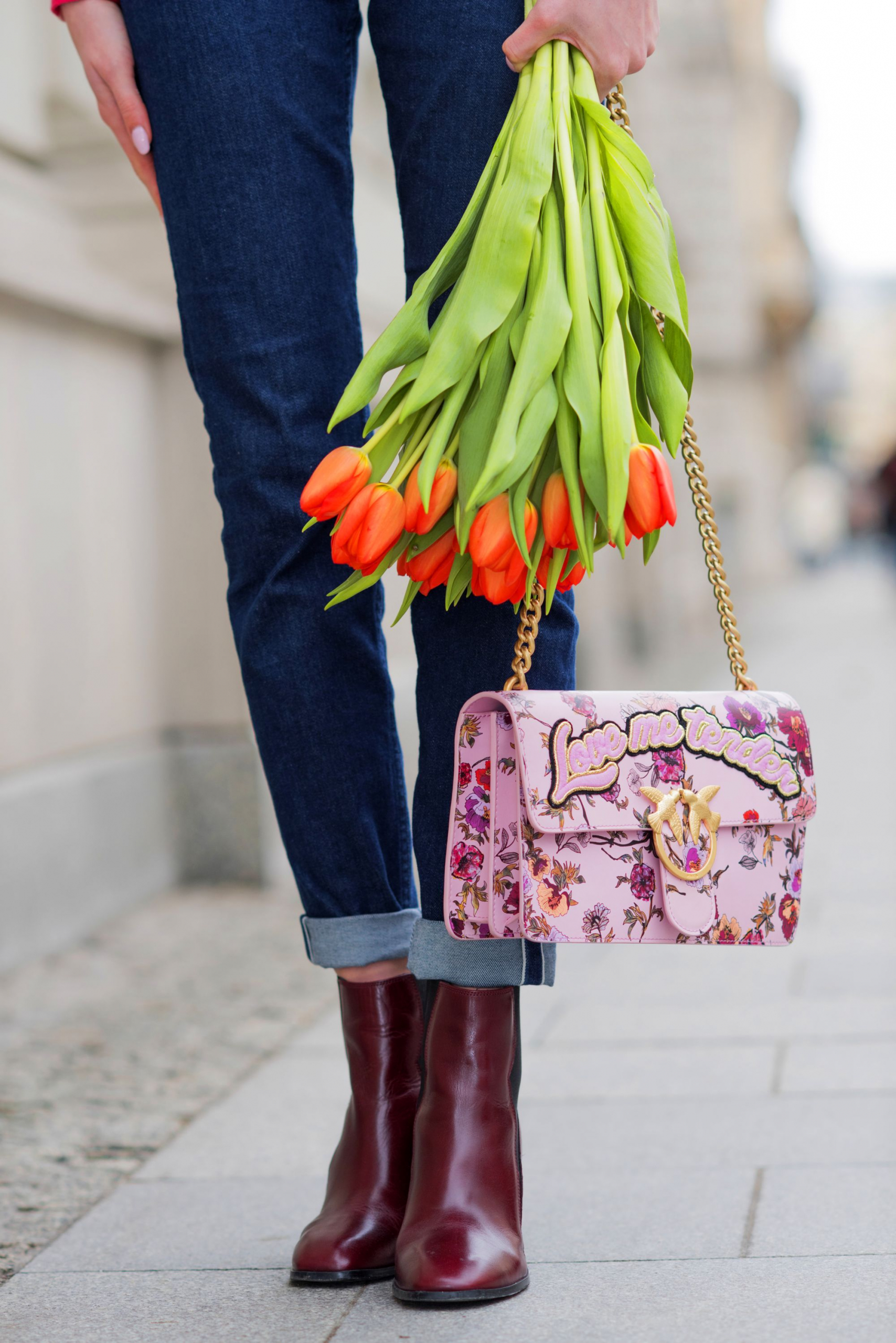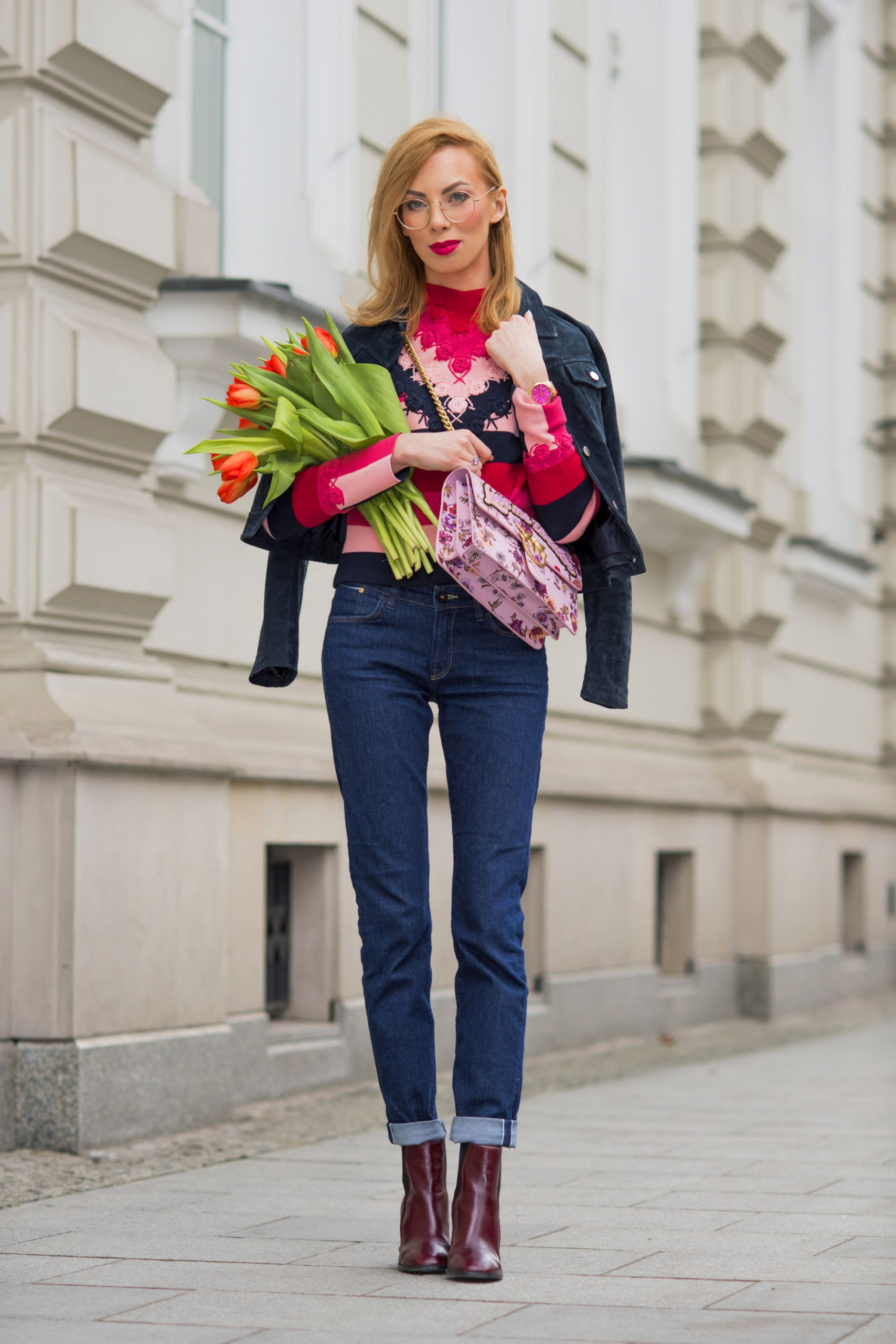 Kwiaty, ich również nie mogło tutaj zabraknąć – i tych świeżych (tulipany to jedne z moich ulubionych kwiatów) i tych na torebce. Tak kolorowa góra stylizacji wymagała bardziej stonowanego dołu, dlatego zdecydowałam się na granatowe, jeansy z wąską nogawką oraz botki w kolorze ciemnego, czerwonego wina. Całość zestawu uzupełniły okulary korekcyjne w złotych oprawkach. Uwielbiam je!