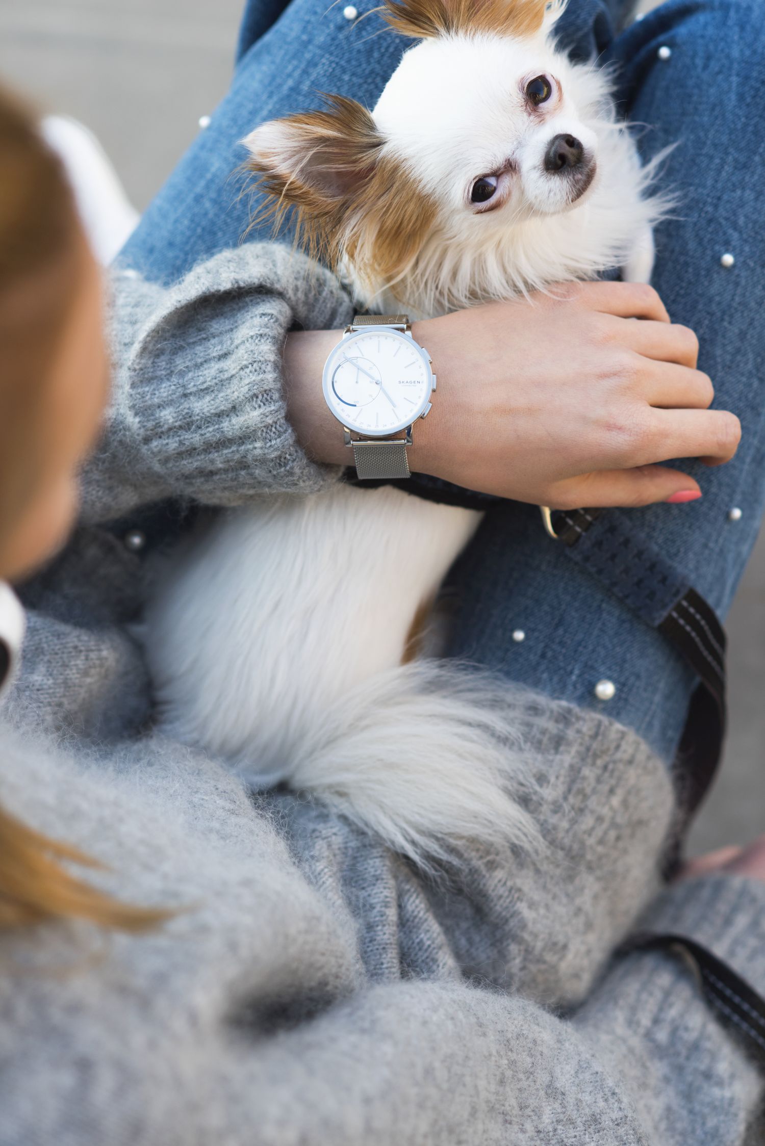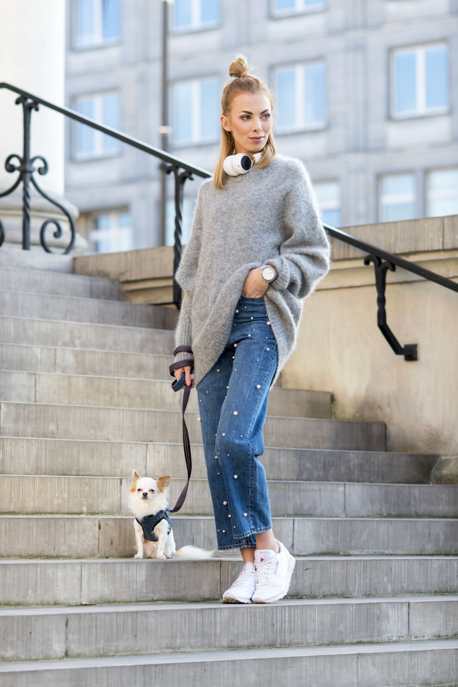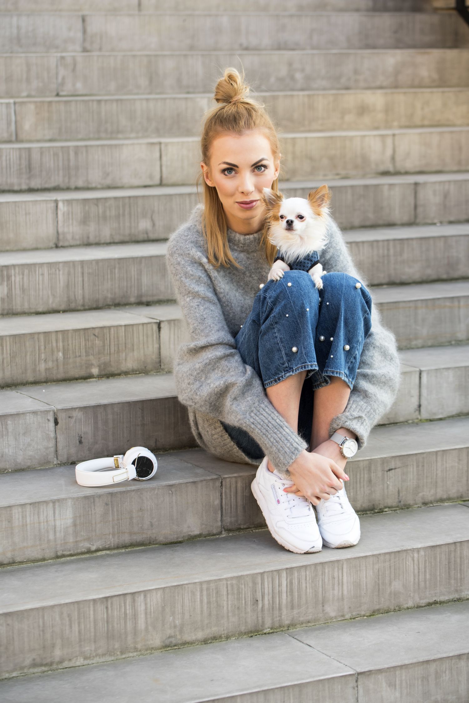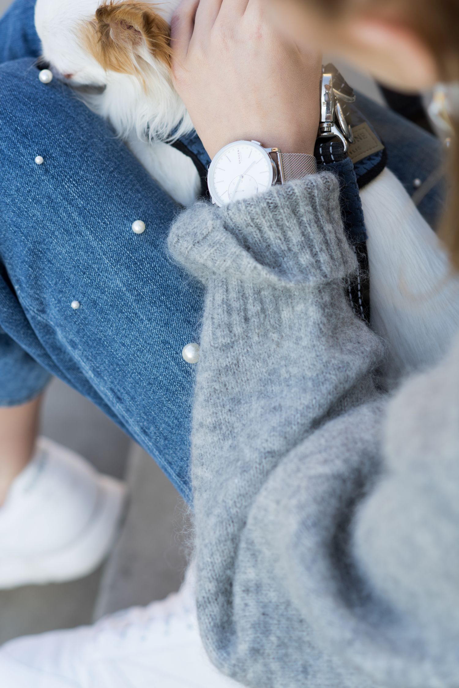 Dziś pokażę Wam natomiast mój zestaw, w którym przemierzałam kolejne uliczki miasta. Jak zwykle w takich wypadkach podstawą były dla mnie wygodne buty. Reebok Classic należą do moich faworytów pod tym względem. Ciepły, ale już nie najgrubszy sweter chronił mnie przed wiatrem, którego nie sposób uniknąć nad jeziorem, szczególnie w okolicach gór. Wisienką na torcie są natomiast szerokie jeansy przed kostkę pokryte z przodu perełkami. Szwajcaria jest krajem zegarków, więc jego również nie mogło zabraknąć w mojej stylizacji. Moje serce najmocniej bije w kierunku duńskiej marki Skagen, która niedawno wypuściła na rynek linię zegarków hybrydowych. Z zewnątrz wygląda jak klasyczny zegarek, ale w środku kryje sporo udogodnień. Po połączeniu ze smartfonem liczy nasze kroki, pokazuje godzinę w dwóch strefach czasowych. Ponadto można go ustawić w ten sposób by pokazywał przy pomocy małej tarczy, kto do nas dzwoni. Oczywiście ma w sobie również budzik. W końcu, gdzie jak gdzie, ale w Szwajcarii trzeba wstawać punktualnie!