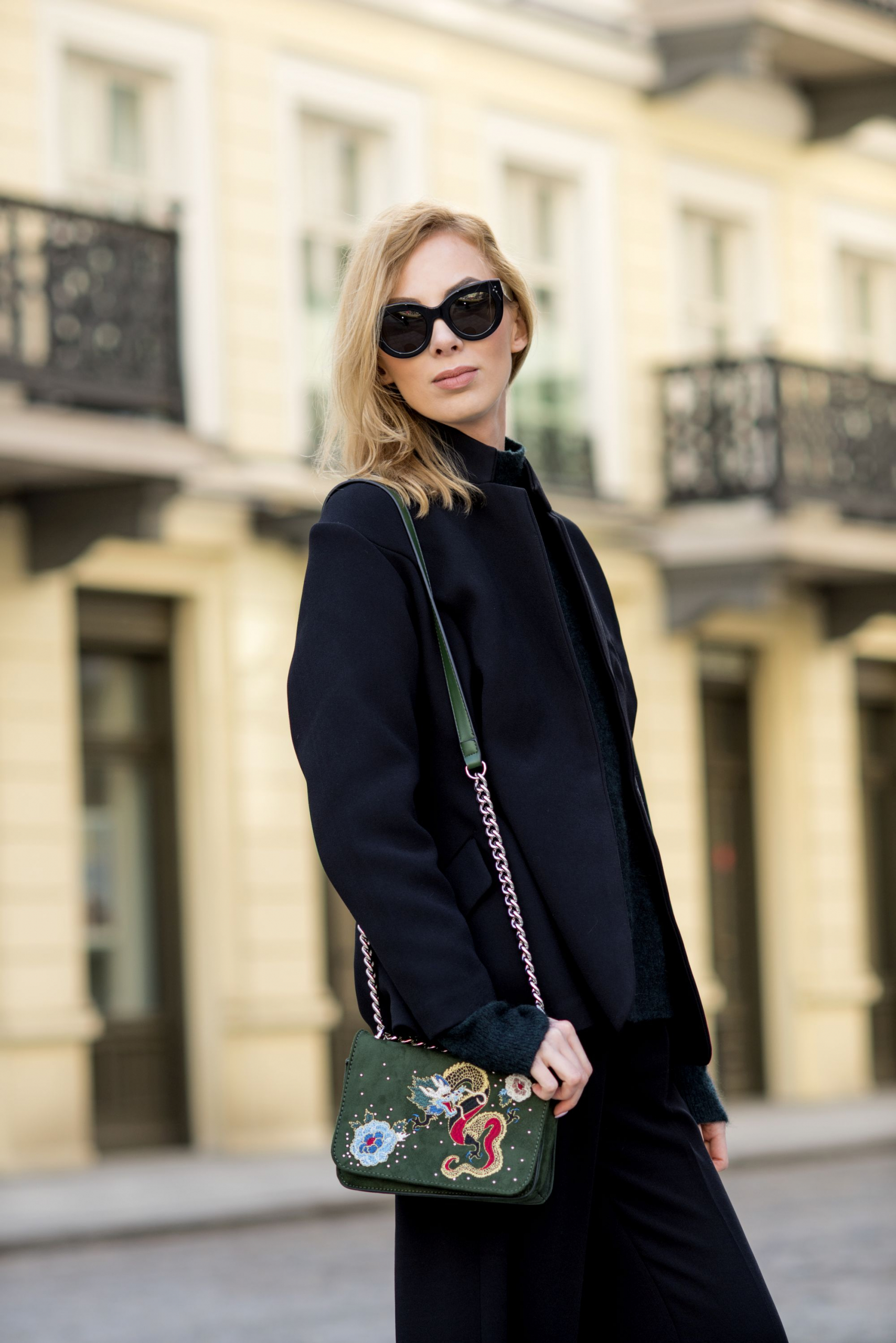 Stawiając na czarną bazę otwieramy sobie drogę do większego szaleństwa w doborze dodatków. Ja zdecydowałam się tym razem na zgniłozielone, zamszowe jazzówki ze skórzanym bordowym językiem z mojego ulubionego Loft37 oraz haftowaną torebkę w ciemniejszym odcieniu. Dajcie znać jak podoba Wam się taki zestaw?