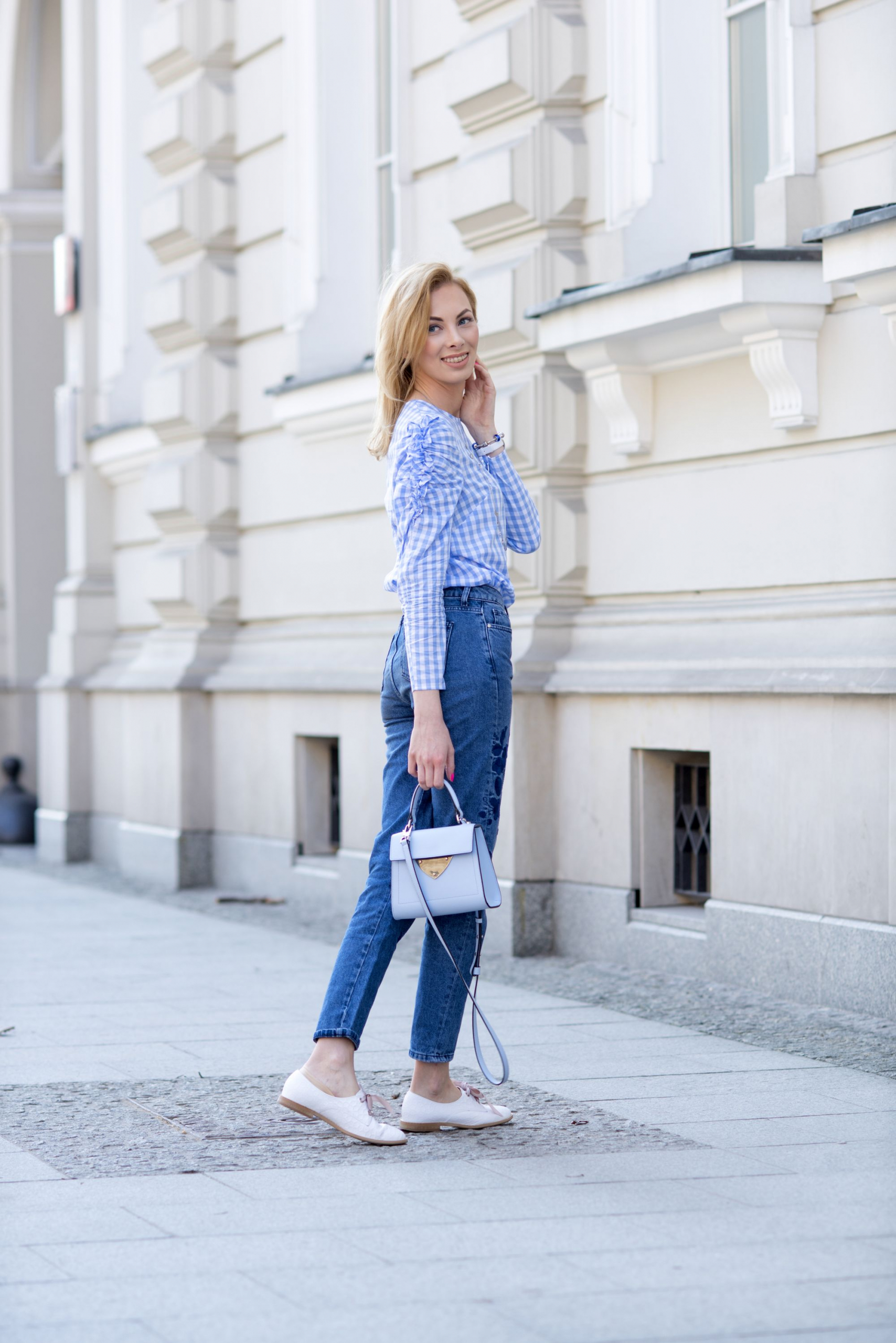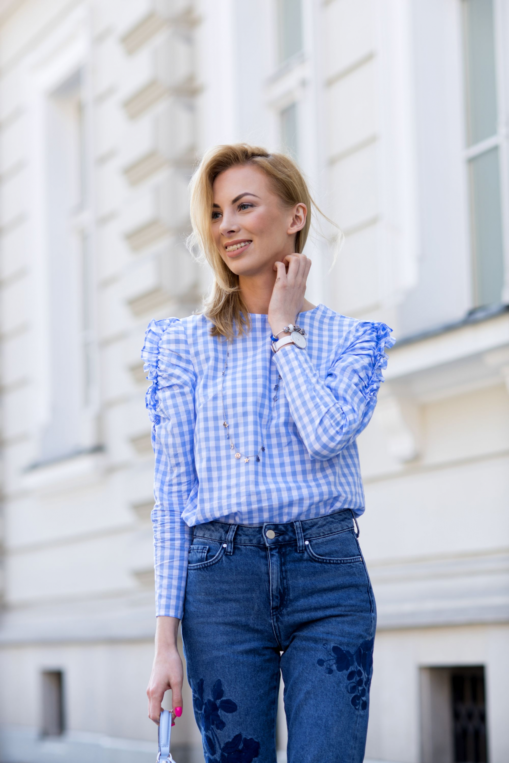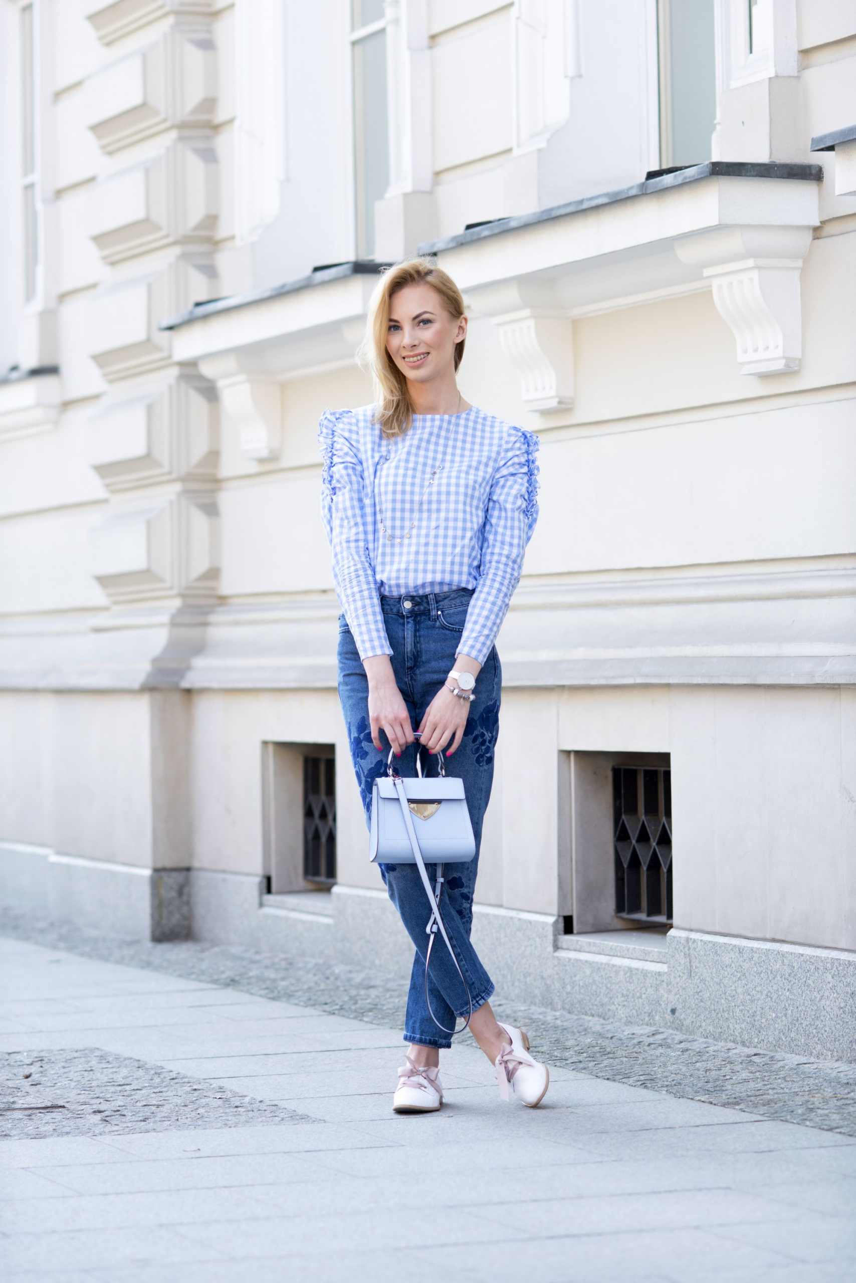 Jestem absolutnie zakochana w każdym pojedynczym elemencie stylizacji z dzisiejszego posta. Zaczynając od koszuli w drobną kratę z bufkami na rękawach, przez spodnie z wysokim stanem z kwiatowym haftem, na błękitnym mini kuferku i jazzówkach z kokardkami kończąc! Mimo że każdy z głównych elementów zestawu ma jakiś charakterystyczny detal to całość nie jest ‘przeładowana’, a dzięki temu znalazło się w nim jeszcze miejsce na zegarek na białym pasku oraz biżuterię. W ten sposób udało mi się stworzyć look w sam raz na wiosenne spacery, o ile wiosna raczy się u nas w końcu pokazać:) Dajcie znać co Wam spodobało się najbardziej!