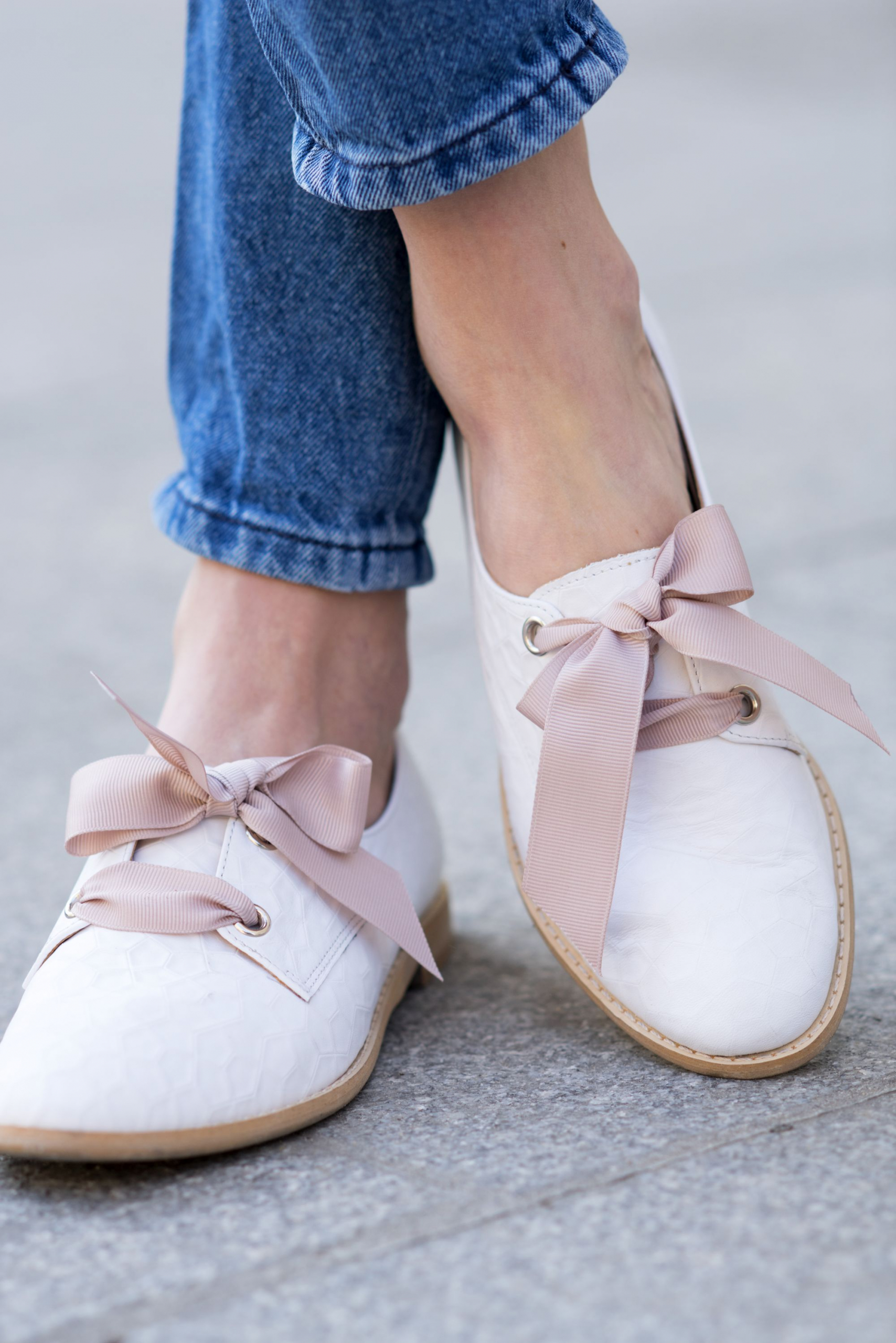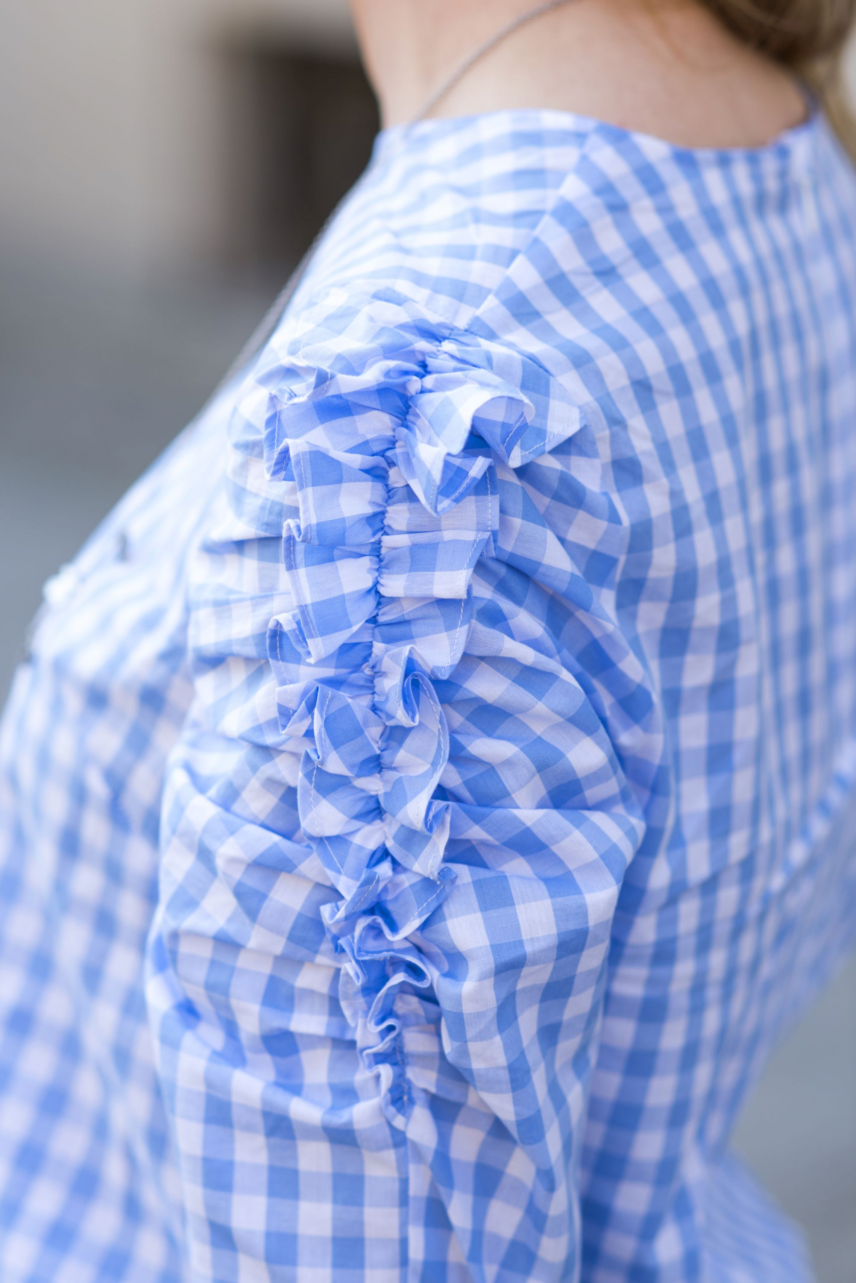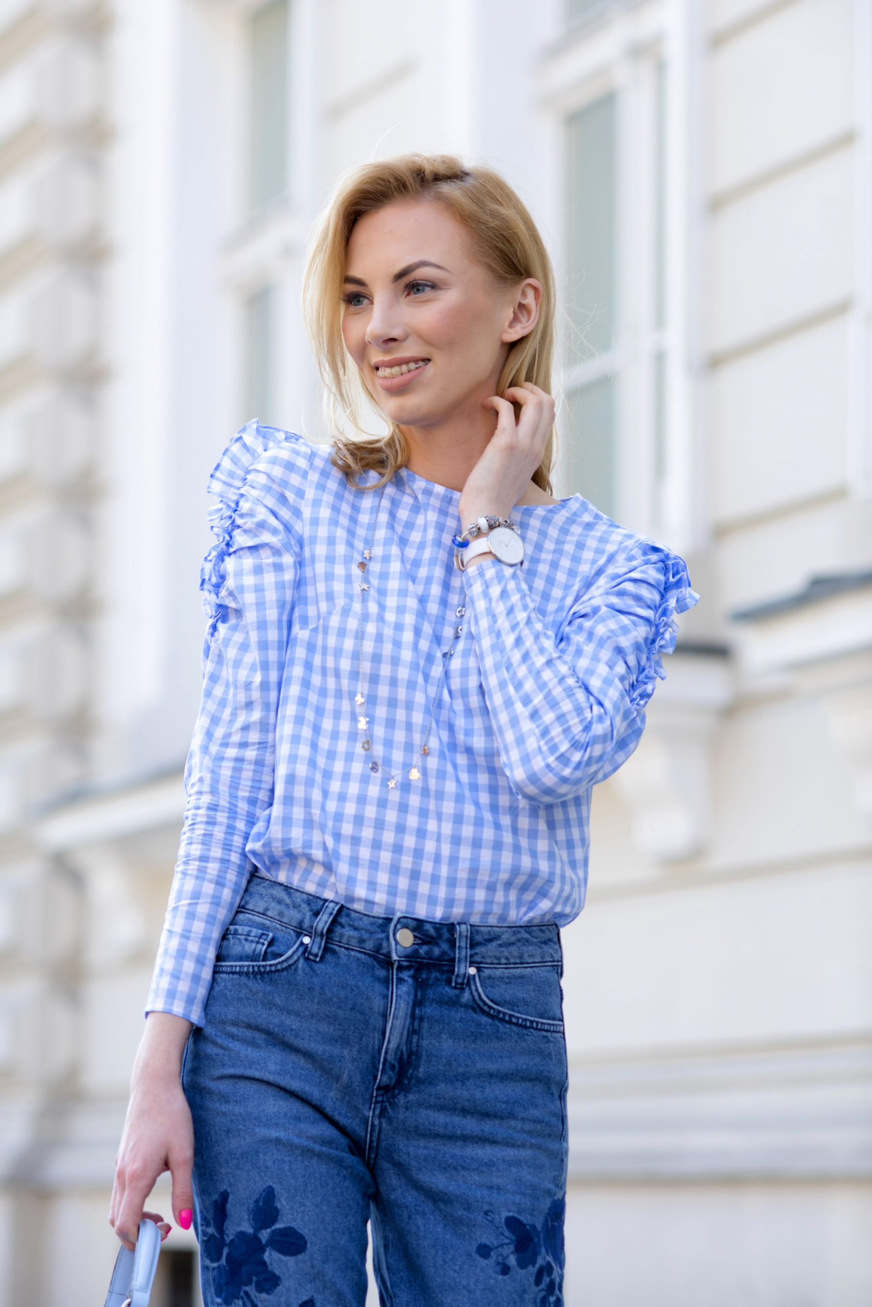Jestem absolutnie zakochana w każdym pojedynczym elemencie stylizacji z dzisiejszego posta. Zaczynając od koszuli w drobną kratę z bufkami na rękawach, przez spodnie z wysokim stanem z kwiatowym haftem, na błękitnym mini kuferku i jazzówkach z kokardkami kończąc! Mimo że każdy z głównych elementów zestawu ma jakiś charakterystyczny detal to całość nie jest ‘przeładowana’, a dzięki temu znalazło się w nim jeszcze miejsce na zegarek na białym pasku oraz biżuterię. W ten sposób udało mi się stworzyć look w sam raz na wiosenne spacery, o ile wiosna raczy się u nas w końcu pokazać:) Dajcie znać co Wam spodobało się najbardziej!