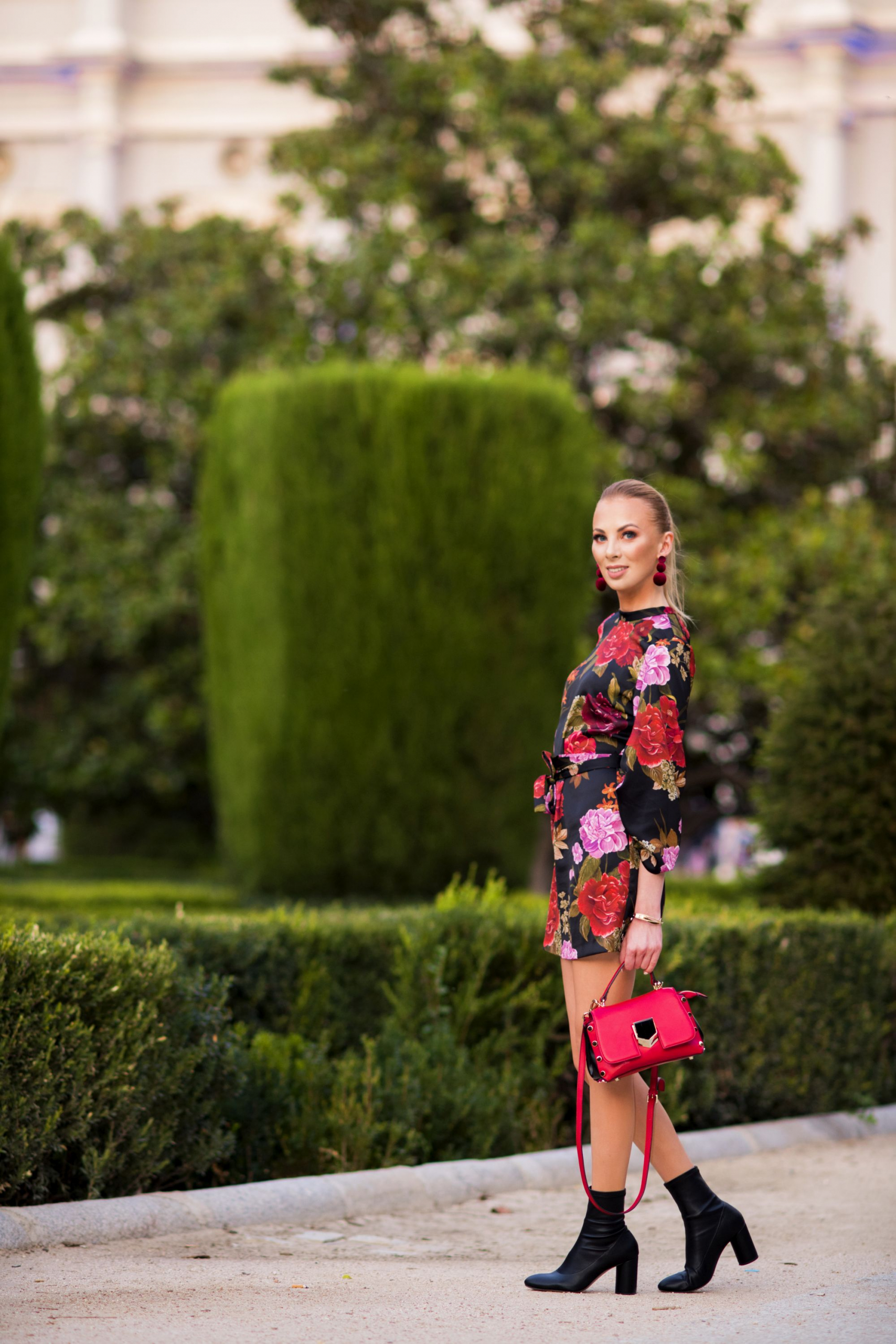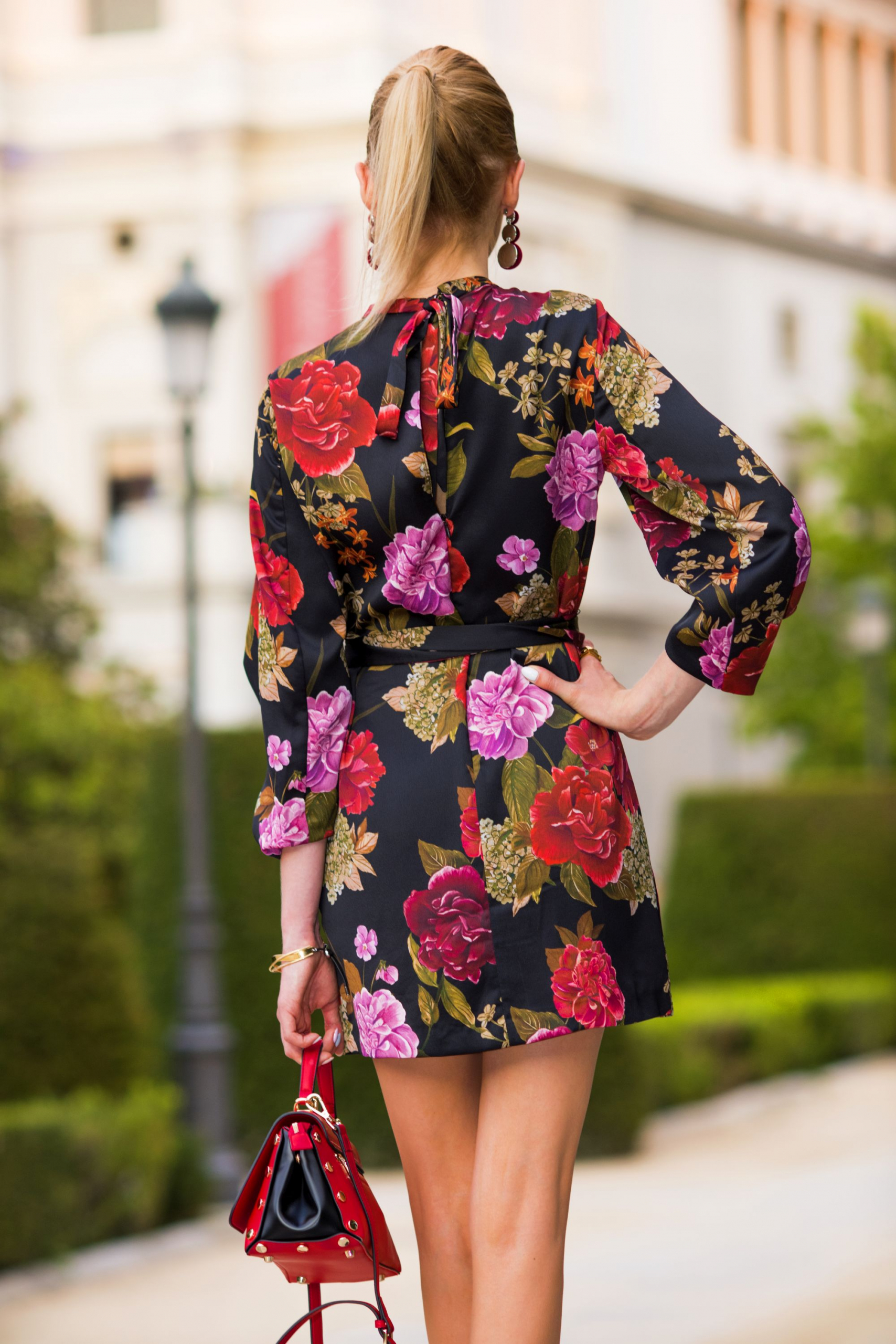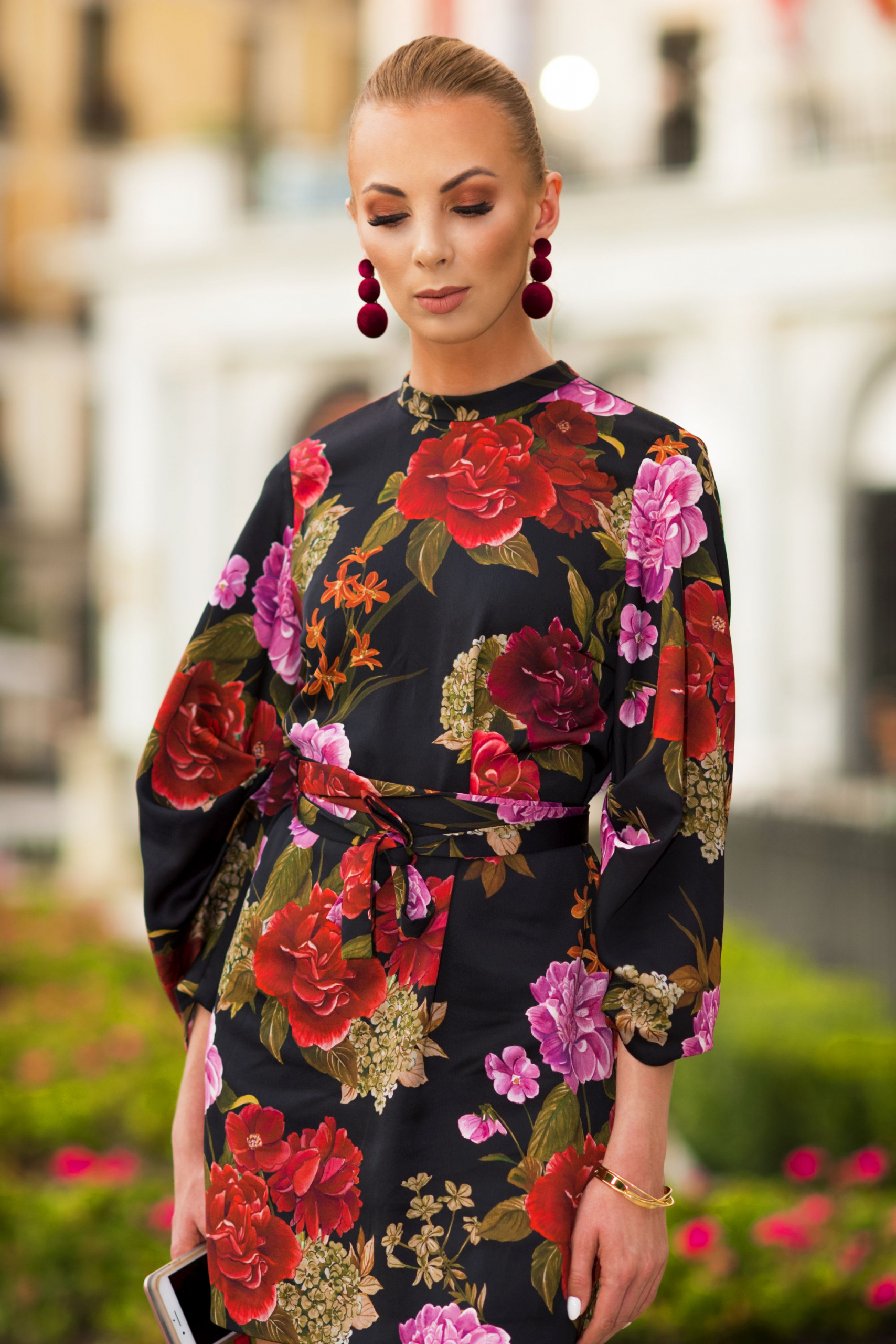 Impreza odbywała się w Teatrze Królewskim, dlatego moja stylizacja na tę okazję nie mogła być zwyczajna. Chciałam nawiązać w niej do japońskich korzeni marki, postawiłam więc na sukienkę w kwiaty z szerokimi rękawami, przewiązaną paskiem. Do sukienki dobrałam botki z nowej, jesiennej kolekcji Loft37 oraz welurowe kolczyki i czerwony kuferek z ćwiekami. Również mój makijaż był bardziej wyrazisty niż zwykle, a to za sprawą bordowo- pomarańczowych cieni do powiek z paletki Heat od Urban Decay. Jestem ciekawa jak spodoba Wam się całość. Koniecznie dajcie znać w komentarzach.