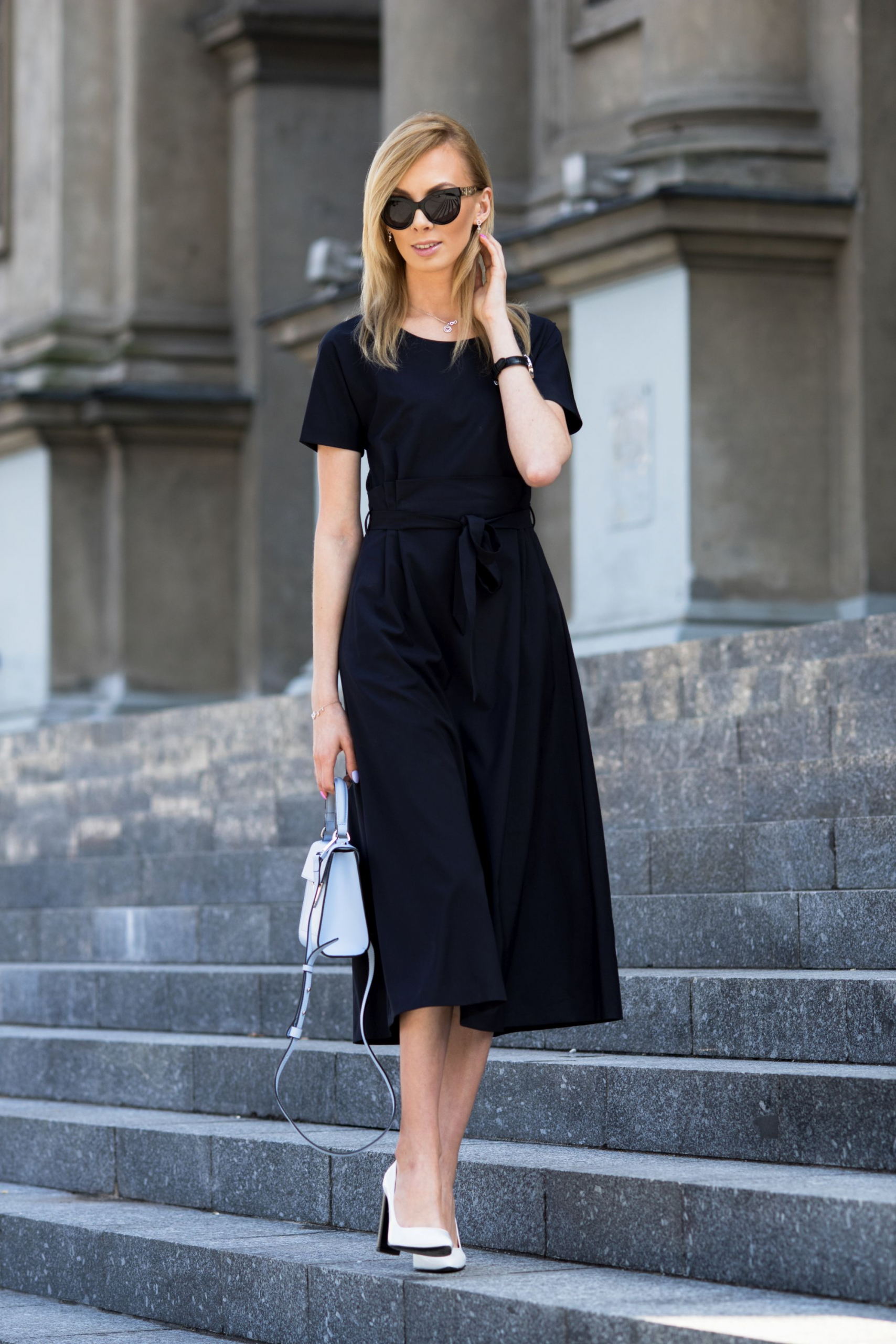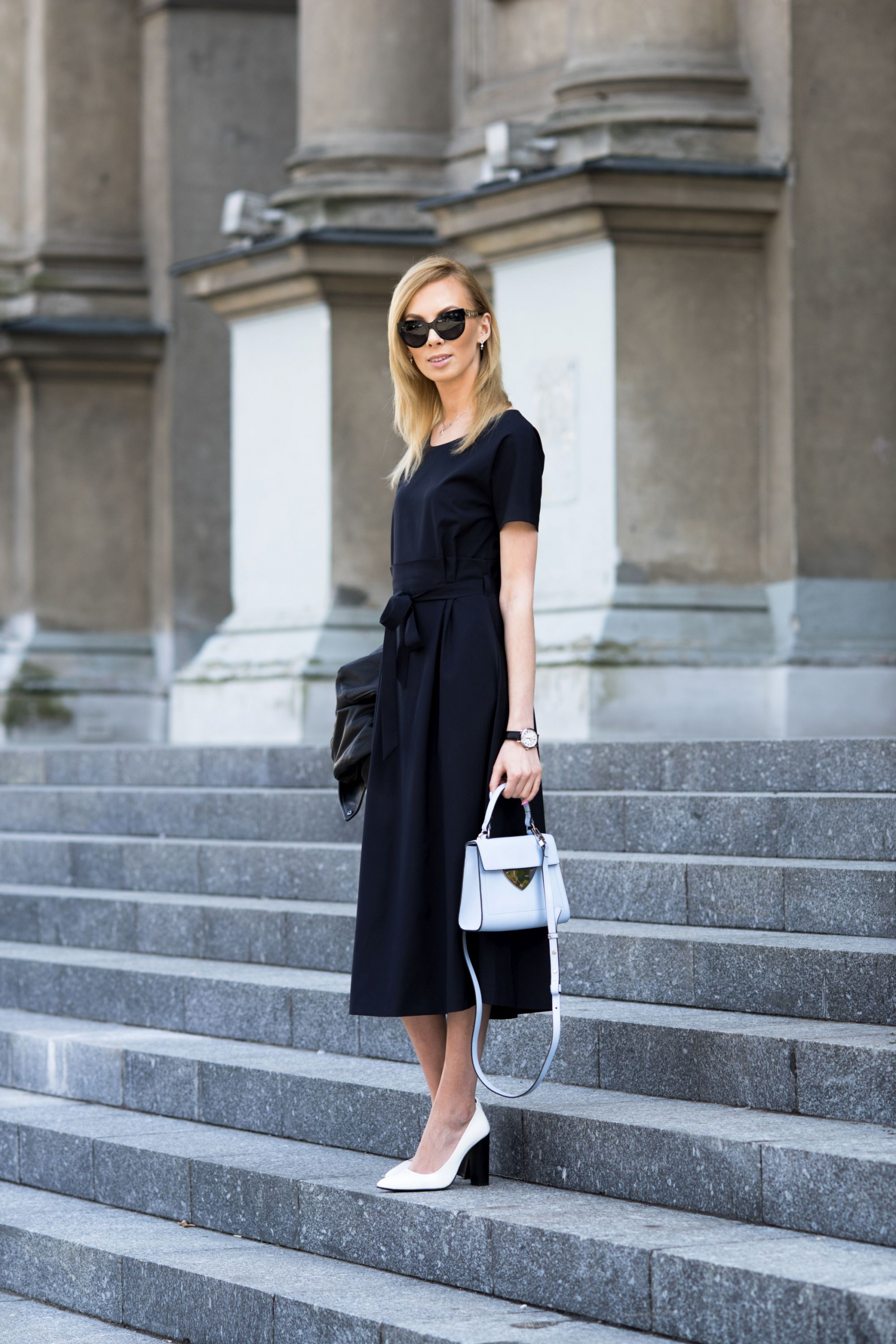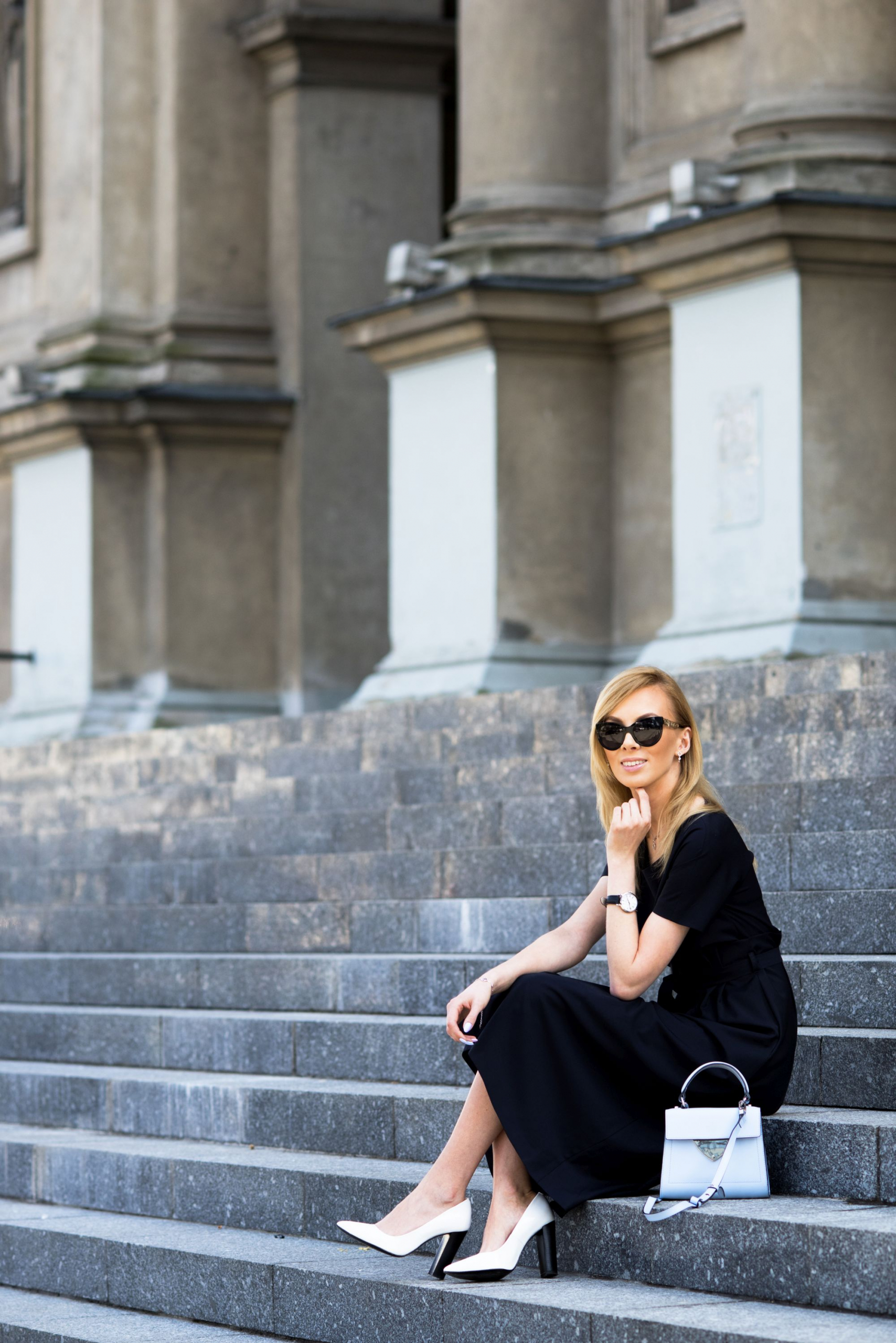 Człowiek z utęsknieniem czeka po zimie na piękną wiosnę, a w nagrodę dostaje lato. I jak tu znaleźć moment na chodzenie w trenczu czy ramoneskach? No nie da się! Zamiast tego trzeba z kurtek puchowych od razu przeskoczyć w letnie sukienki. W żaden sposób nie mam jednak zamiaru narzekać na ten stan rzeczy. Wręcz przeciwnie, bardzo szybko się dostosowałam, dlatego poniżej prezentuję Wam już pierwszy stricte wiosenno letni zestaw z elegancką, granatową sukienką z wełny dziewiczej sięgającą do połowy łydki. Sukienka jest projektu Dawida Tomaszewskiego i powstała we współpracy z moją ukochaną marką Patrizia Aryton. Zestawiłam ją z białymi czółenkami na czarnym klocku. Wiosną ten kolor butów będzie w trendach! Jeśli chodzi o torebkę wybrałam pastelowy błękit, który świetnie wybija się na tle granatowej sukienki. Całość uzupełniła przepiękna srebrna biżuteria od Apartu, zegarek Albert Riele oraz jedne z moich ulubionych przeciwsłonecznych okularów od D&G. Mam nadzieję, że stylizacja Wam się spodoba!