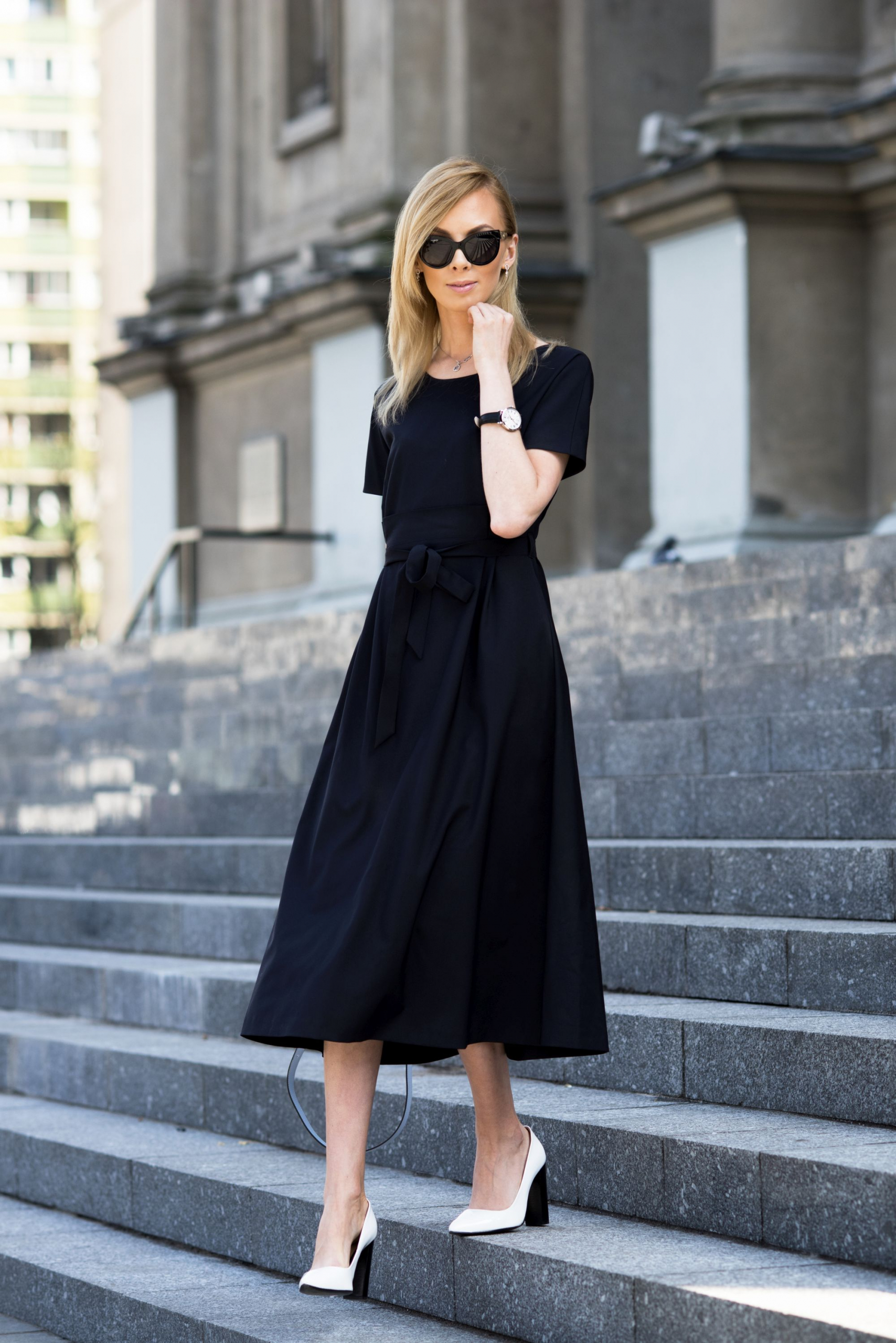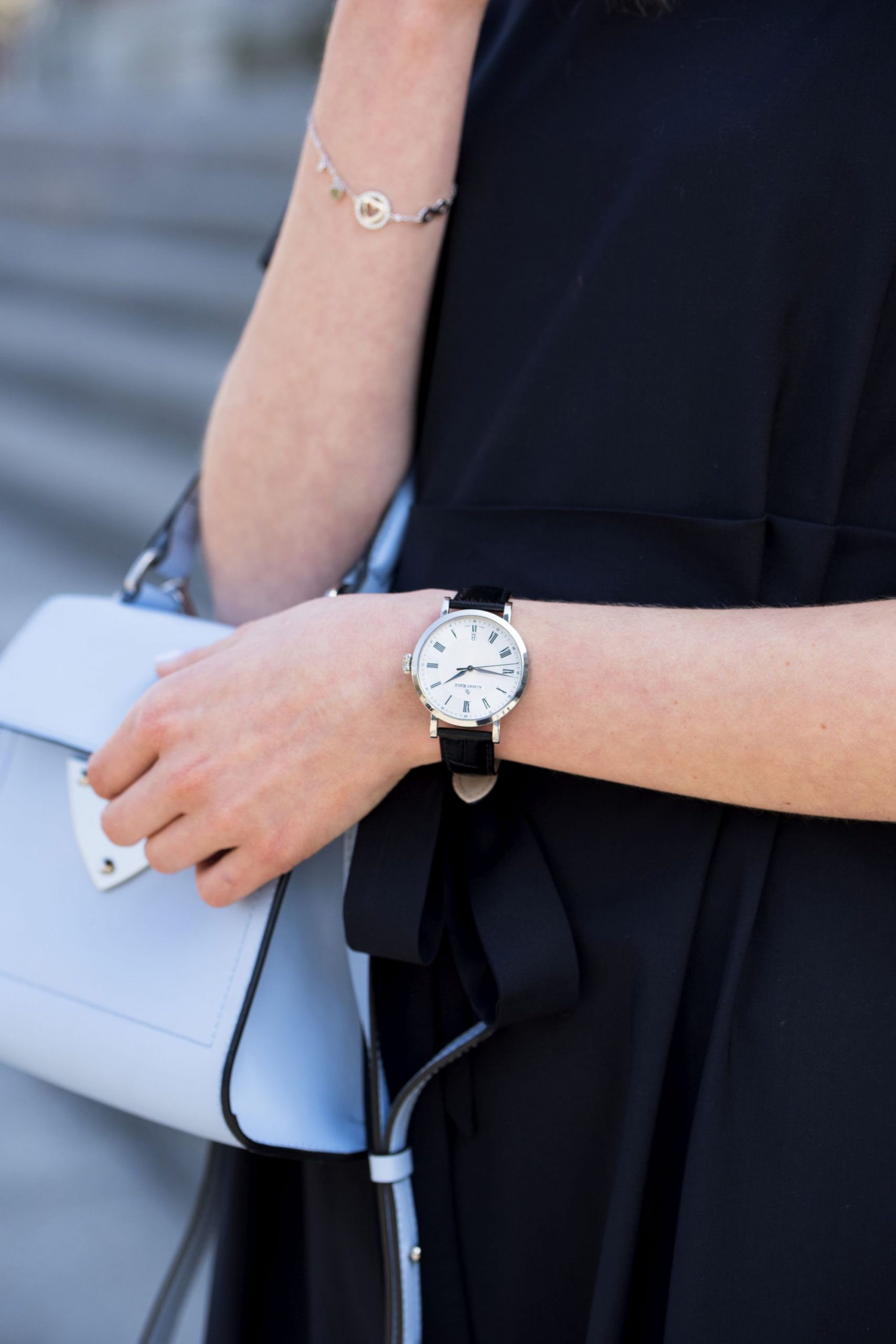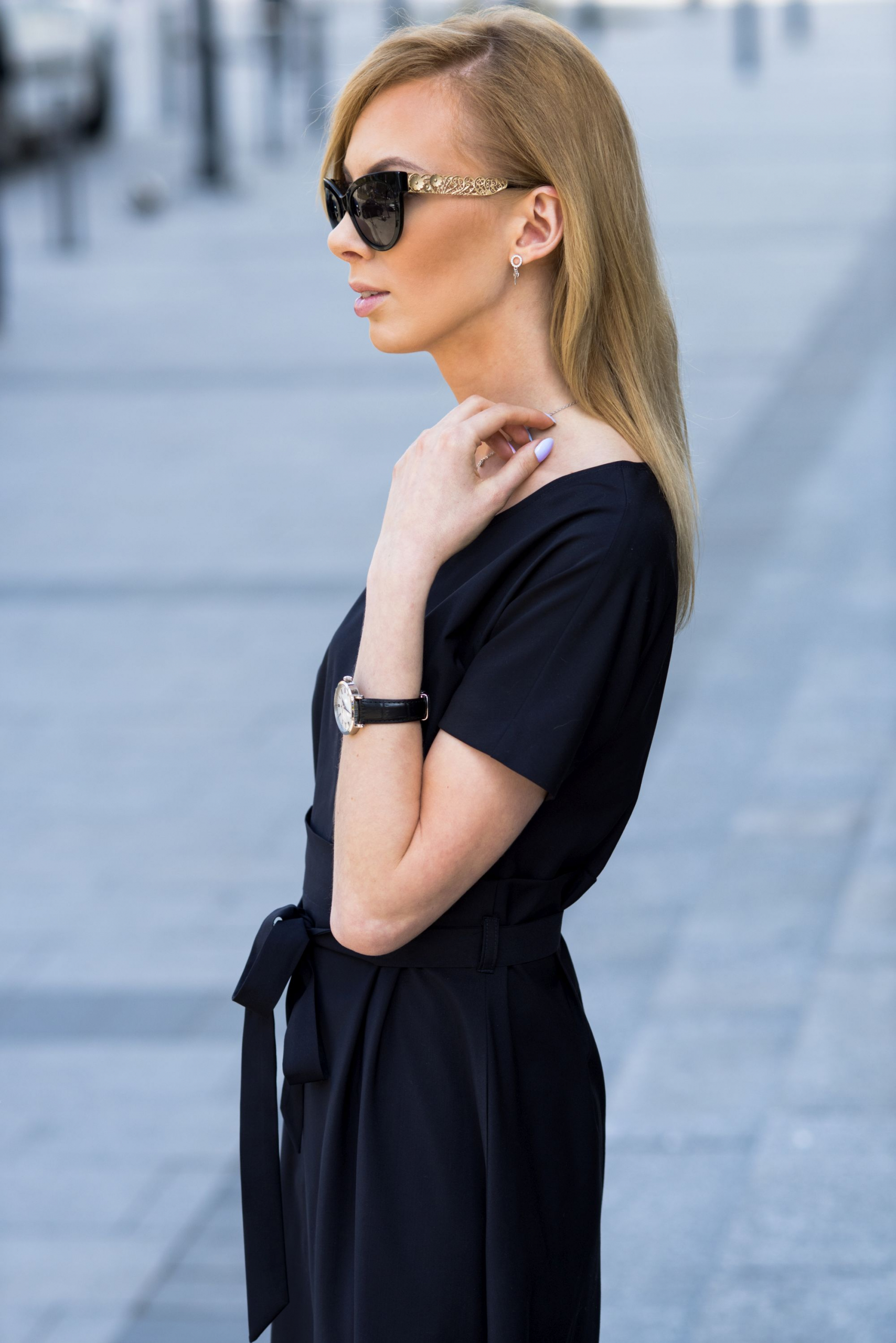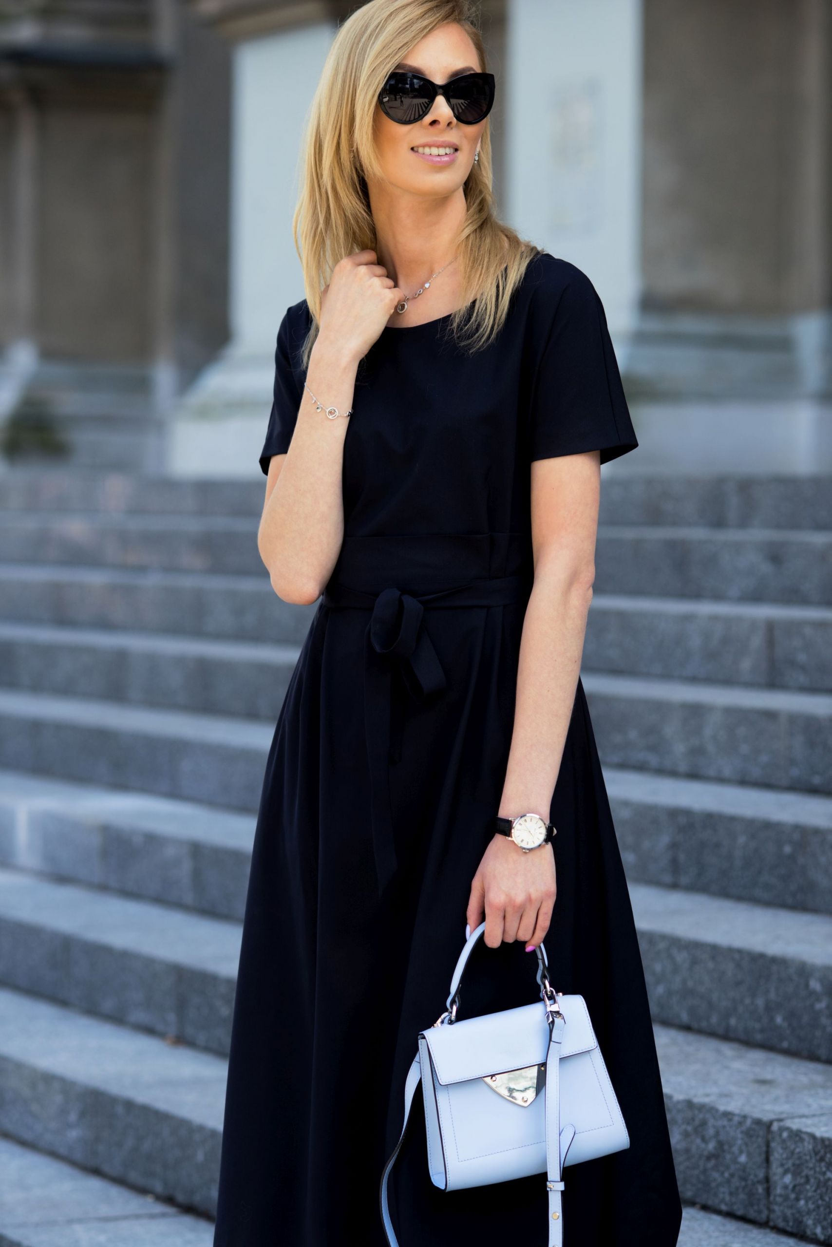 Człowiek z utęsknieniem czeka po zimie na piękną wiosnę, a w nagrodę dostaje lato. I jak tu znaleźć moment na chodzenie w trenczu czy ramoneskach? No nie da się! Zamiast tego trzeba z kurtek puchowych od razu przeskoczyć w letnie sukienki. W żaden sposób nie mam jednak zamiaru narzekać na ten stan rzeczy. Wręcz przeciwnie, bardzo szybko się dostosowałam, dlatego poniżej prezentuję Wam już pierwszy stricte wiosenno letni zestaw z elegancką, granatową sukienką z wełny dziewiczej sięgającą do połowy łydki. Sukienka jest projektu Dawida Tomaszewskiego i powstała we współpracy z moją ukochaną marką Patrizia Aryton. Zestawiłam ją z białymi czółenkami na czarnym klocku. Wiosną ten kolor butów będzie w trendach! Jeśli chodzi o torebkę wybrałam pastelowy błękit, który świetnie wybija się na tle granatowej sukienki. Całość uzupełniła przepiękna srebrna biżuteria od Apartu, zegarek Albert Riele oraz jedne z moich ulubionych przeciwsłonecznych okularów od D&G. Mam nadzieję, że stylizacja Wam się spodoba!