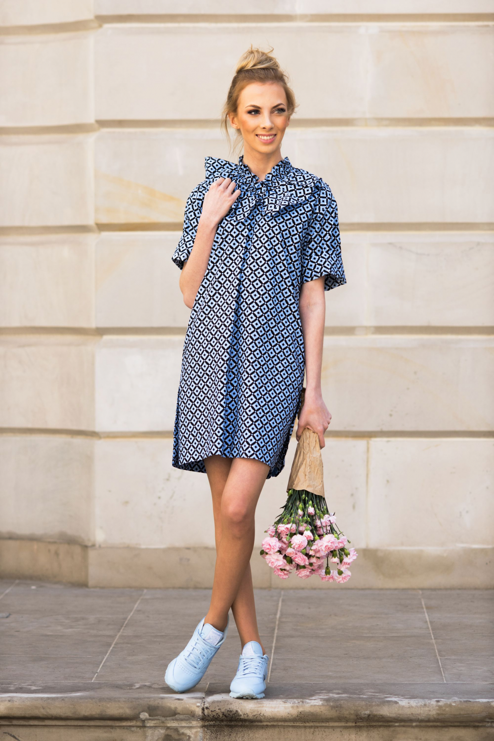 Wracając do mojej stylizacji – sukienkę zestawiłam z wygodnymi, sportowymi butami w błękitnym kolorze, które świetnie sprawdzą się na spacer. Do tego dobrałam dodatkowo granatowy, wiosenny płaszcz, który szczególnie rano i wieczorami bardzo przydaje się kiedy jest chłodniej niż w ciągu dnia.
