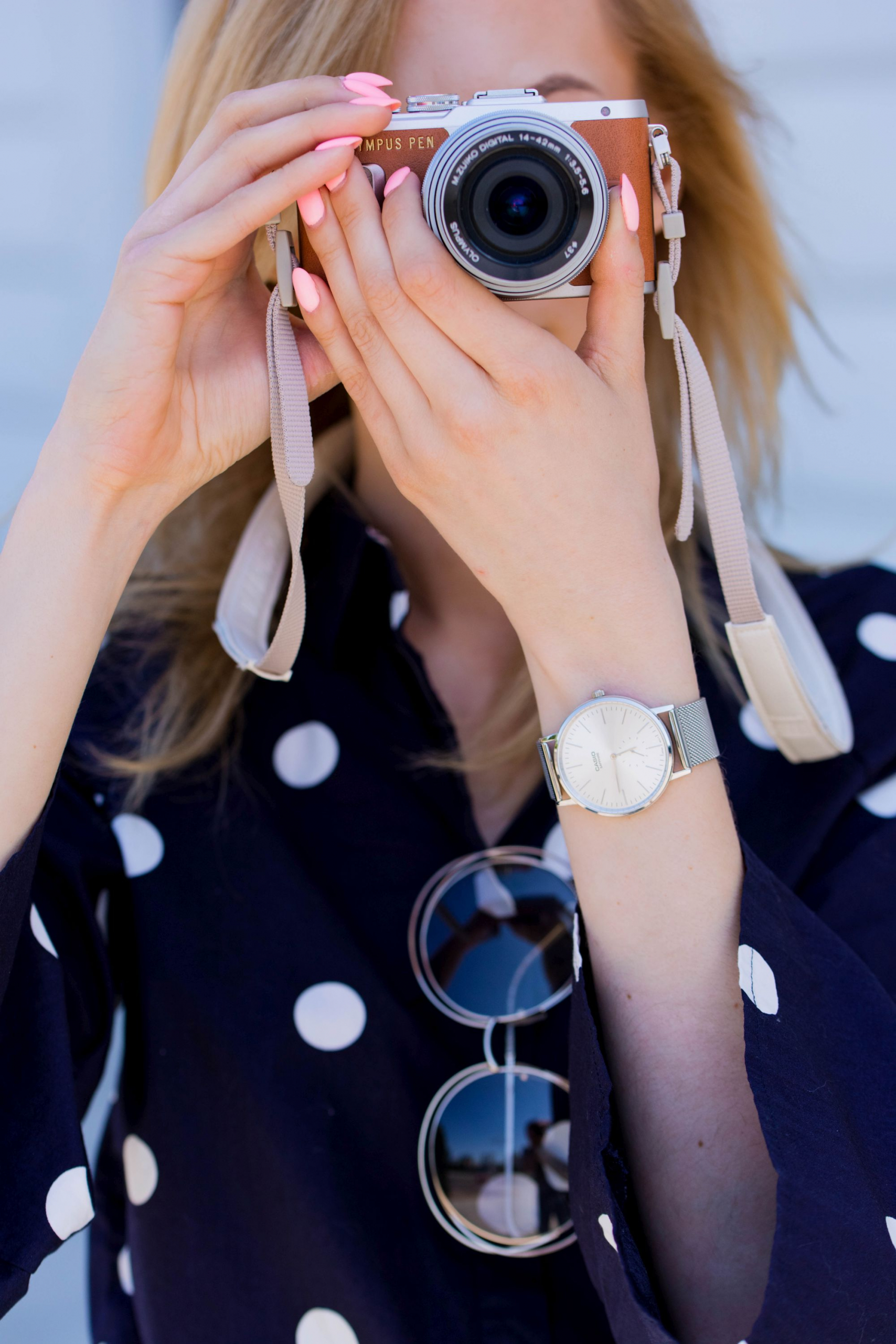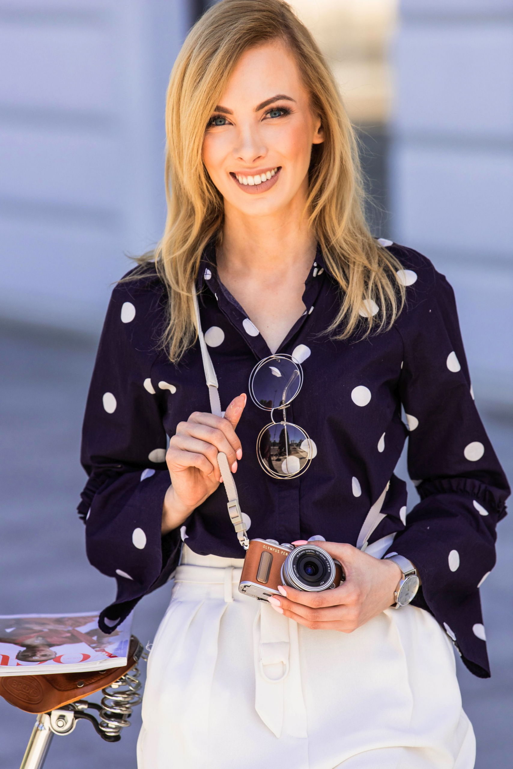 Ostatnio wybrałam się na pierwszą przejażdżkę i razem z Manolo w koszyku, dotarliśmy na Plac Piłsudskiego. To w jego pobliżu, udało nam się zrobić dla Was zdjęcia stylizacji. Mój pierwszy tegoroczny look rowerowy, składał się z białych cygaretek z wysokim stanem oraz granatowej koszuli w grochy. Do tego wygodne balerinki oraz biały wiklinowy koszyk. Całość uzupełniły jeszcze okulary Chloe oraz srebrny zegarek Casio. To marka, którą pamiętam od dzieciństwa. Mój dziadek kupił mi jeden kiedy miałam z 10 lat i od tamtego czasu nie rozstawałam się z nim przez dobrych kilka lat. Teraz często wspominam go z sentymentem i sama nie wiem gdzie się podziewa. Chyba będę musiała go poszukać w kartonach na strychu. Pewnie nic mu nie jest i po wymianie baterii będzie dalej działał!