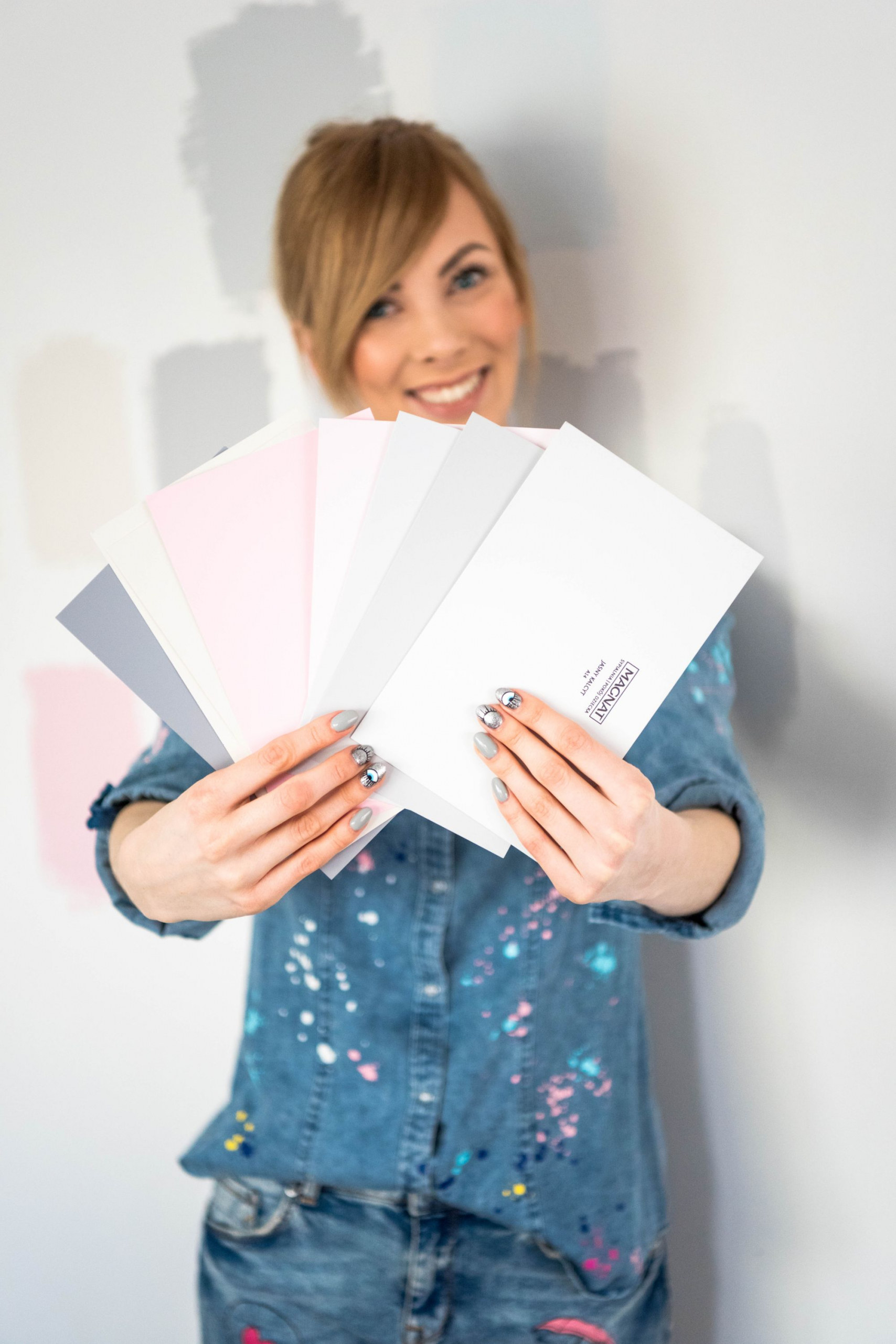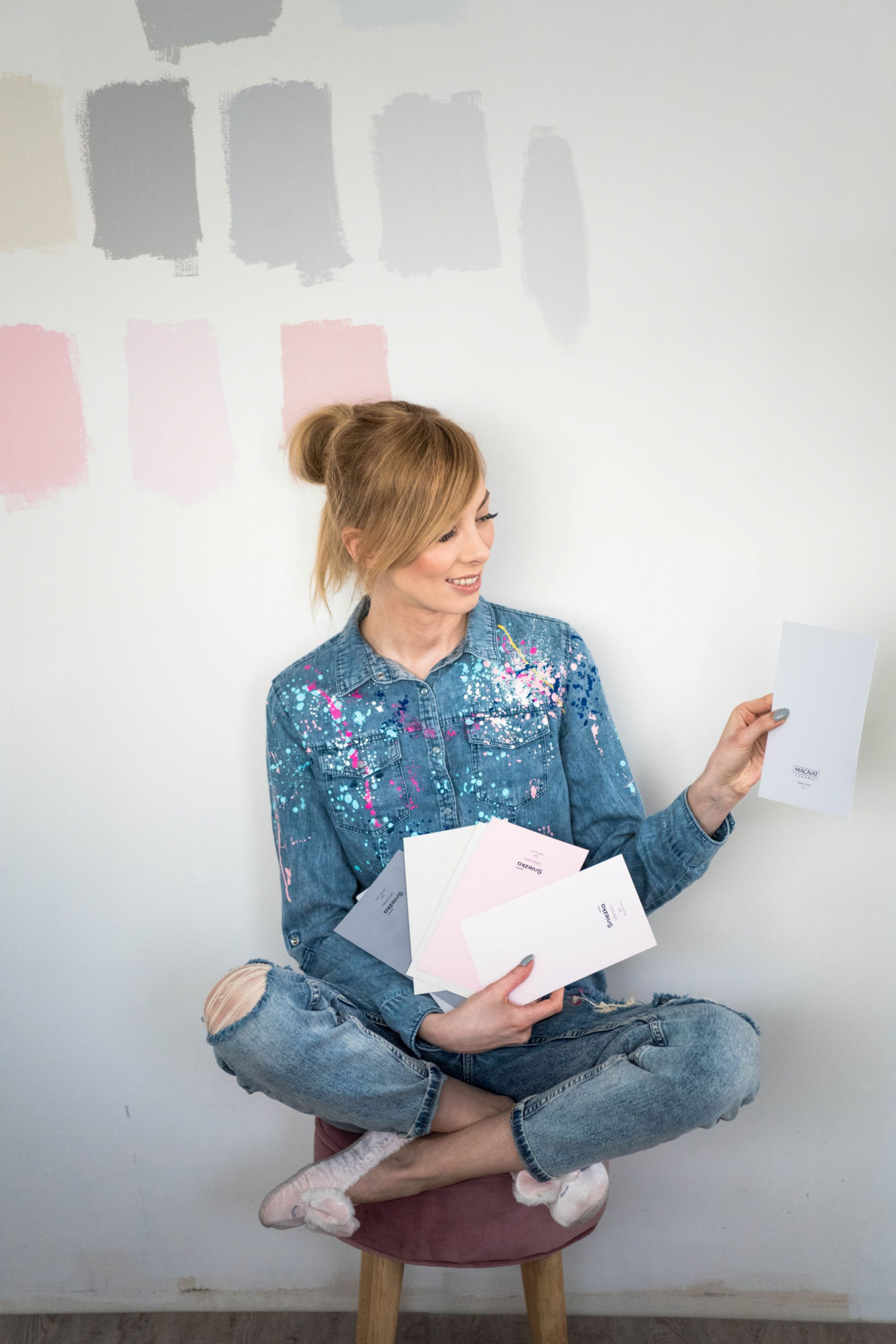 Wstępny plan zakładał, że ściany w biurze lub jak kto woli gabinecie będą w kolorze pudrowego różu. Wszystko miało być delikatne i bardzo dziewczęce. Wraz z postępującymi pracami wykończeniowymi, mój pierwotny wybór coraz mniej mnie przekonywał. Doszłam w końcu do wniosku, że lepiej postawić na różowe dodatki, niż ściany w tym kolorze i w ten właśnie sposób zdecydowałam, że to szarość zagości w gabinecie. Chcąc upewnić się w swojej decyzji, kupiłam kilka próbek w różnych odcieniach różu oraz szarości i pomalowałam fragment ściany każdą z nich. W ten sposób mogłam porównać jak każdy z kolorów prezentuje się na żywo (porównać między sobą)- w warunkach, w których będę widziała go na co dzień. Światło w sklepach i co gorsza próbniki podwieszone gdzieś wysoko nad głowami, bardzo przekłamują kolory, dlatego moim zdaniem nie ma się co nimi sugerować tylko kupić próbki (ich koszt to 2-3 zł za sztukę). Takim oto sposobem moja ściana przez moment wyglądała tak jak na poniższym zdjęciu…