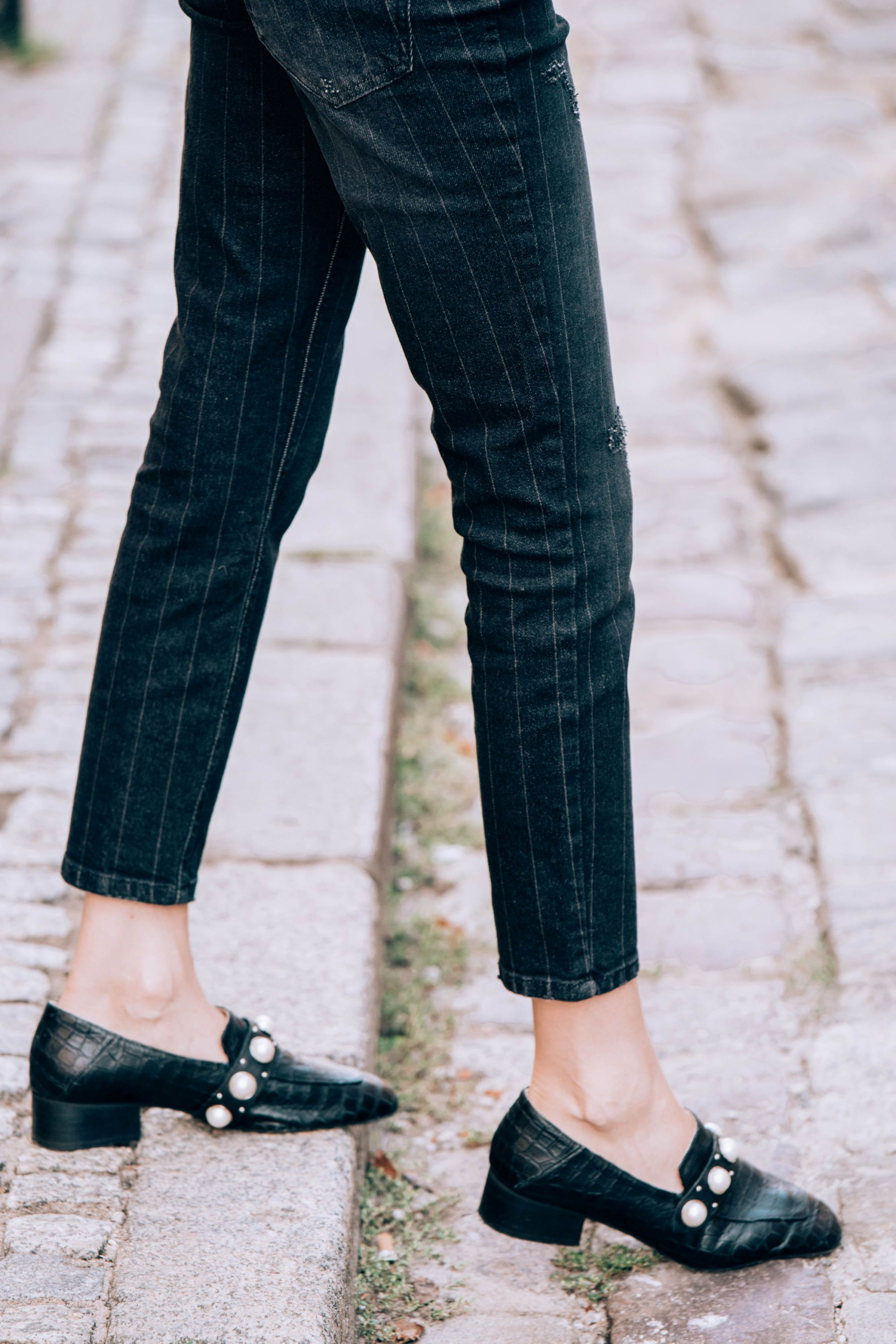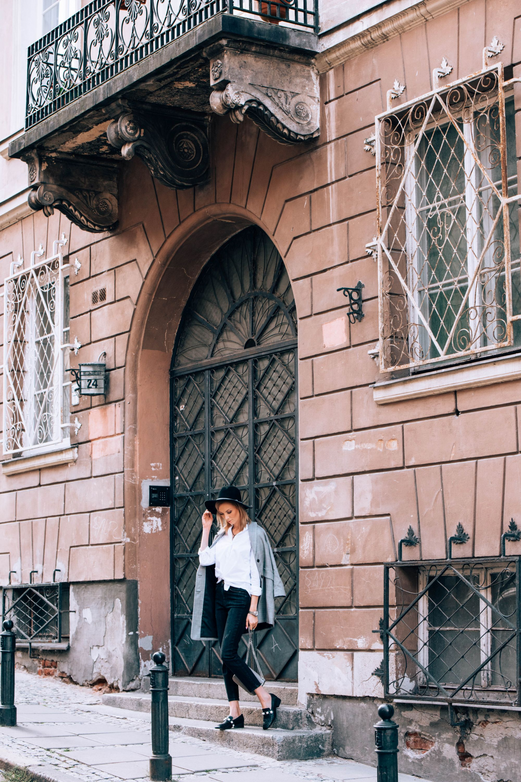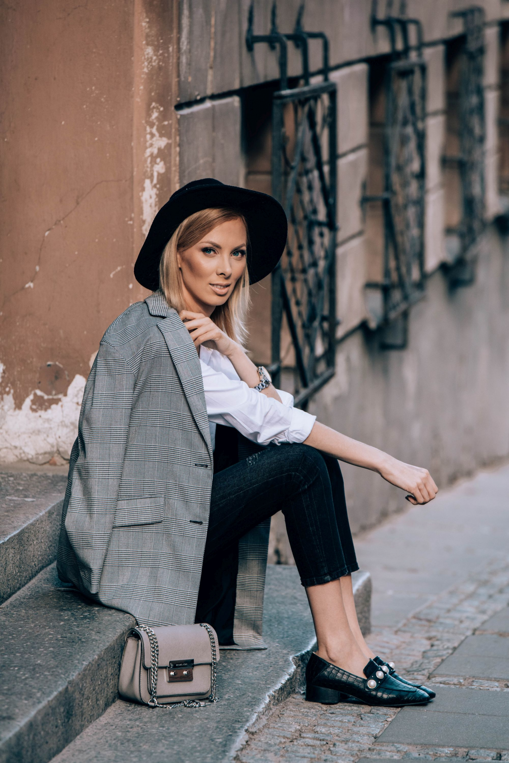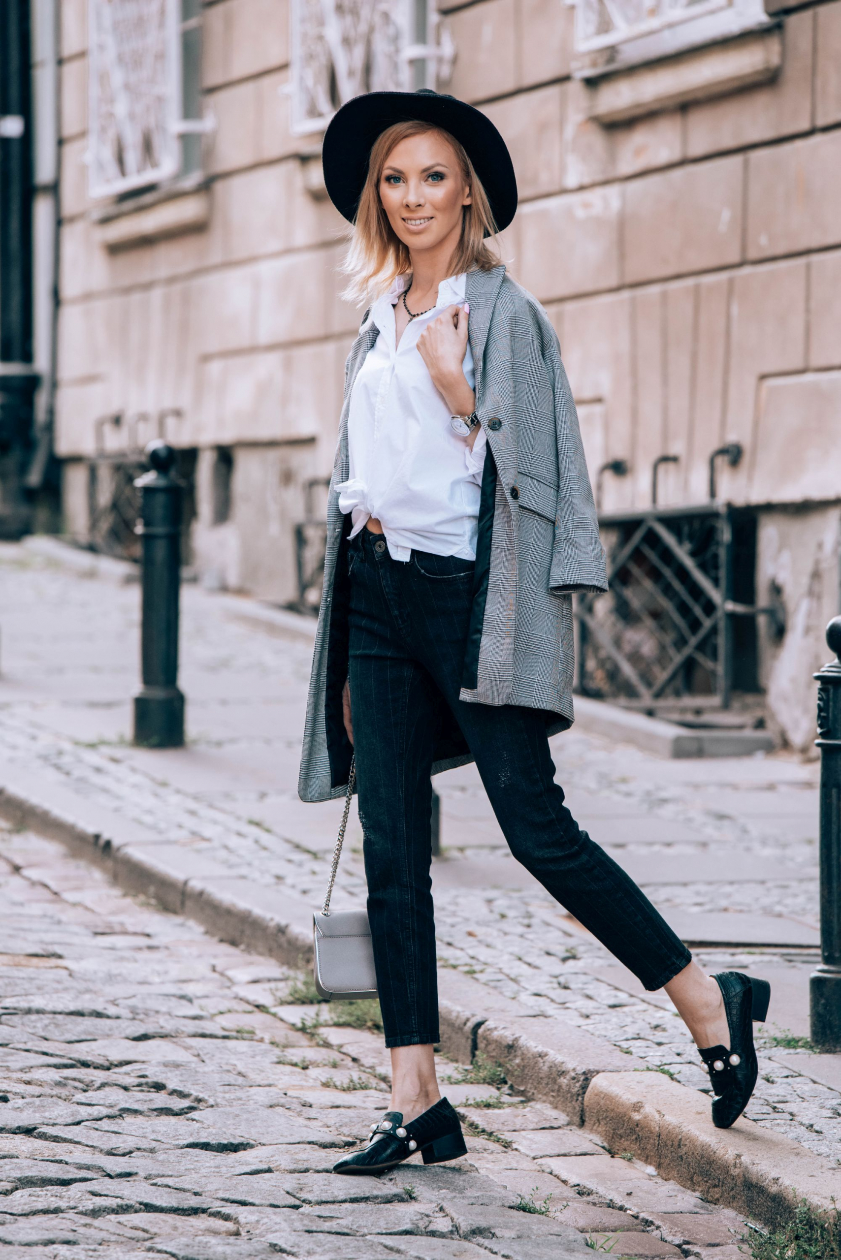 Jak możecie zauważyć, po raz kolejny nie bałam się połączyć dwóch wzorów – kratki na mojej długiej marynarce oraz delikatnych prążków na grafitowych jeansach z Kappahl. Do tego doszły jeszcze perły na butach i naszyjnik przypominający różaniec. Zgodzicie się, że mimo tego, wszystko do siebie pasuje i komponuje się w całkiem ciekawą całość. Dodatkowo miejsce w którym robiłam zdjęcia dopełniło świetnie zestaw dzięki czemu jestem z nich bardzo zadowolona. Mam nadzieję że Wam się spodobają.