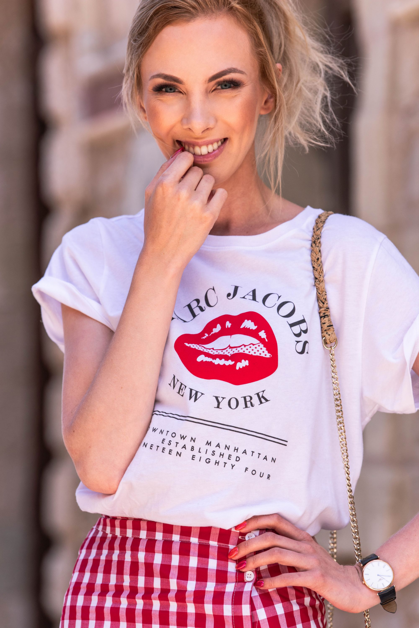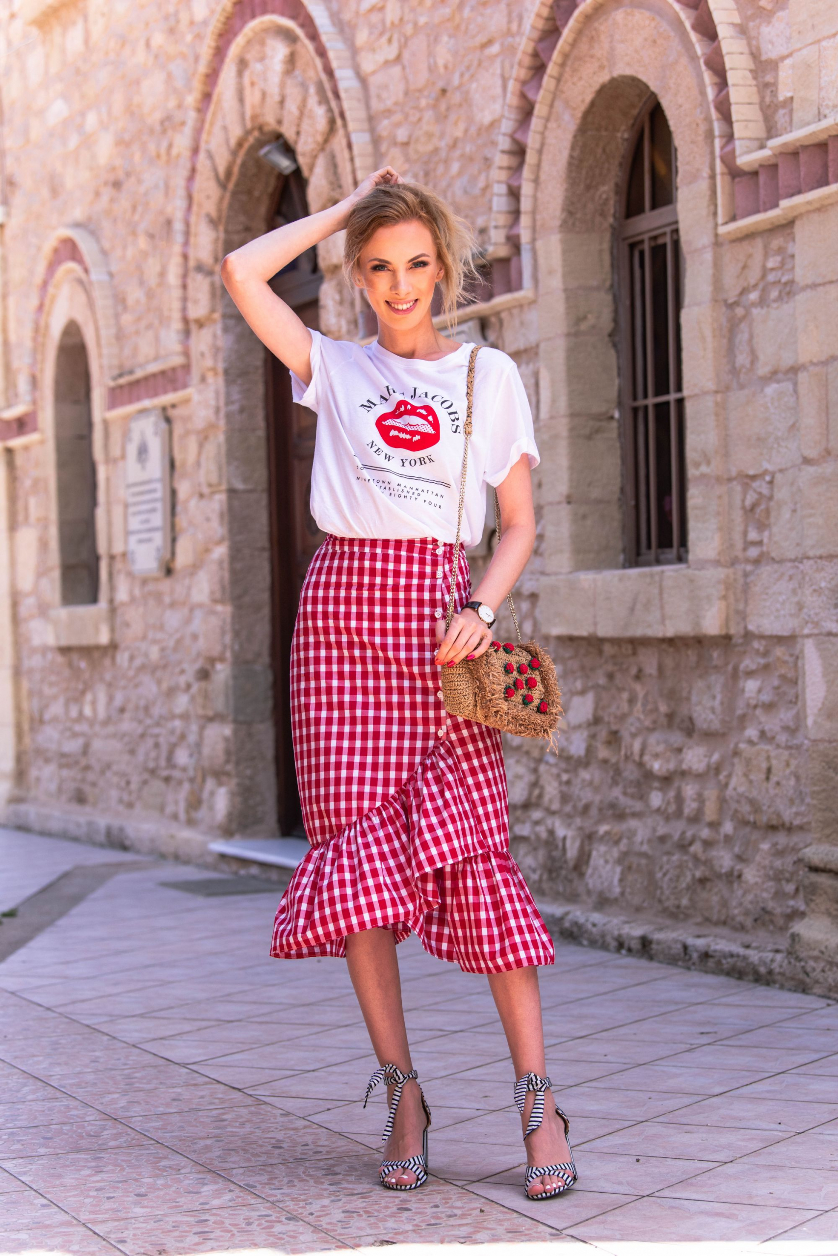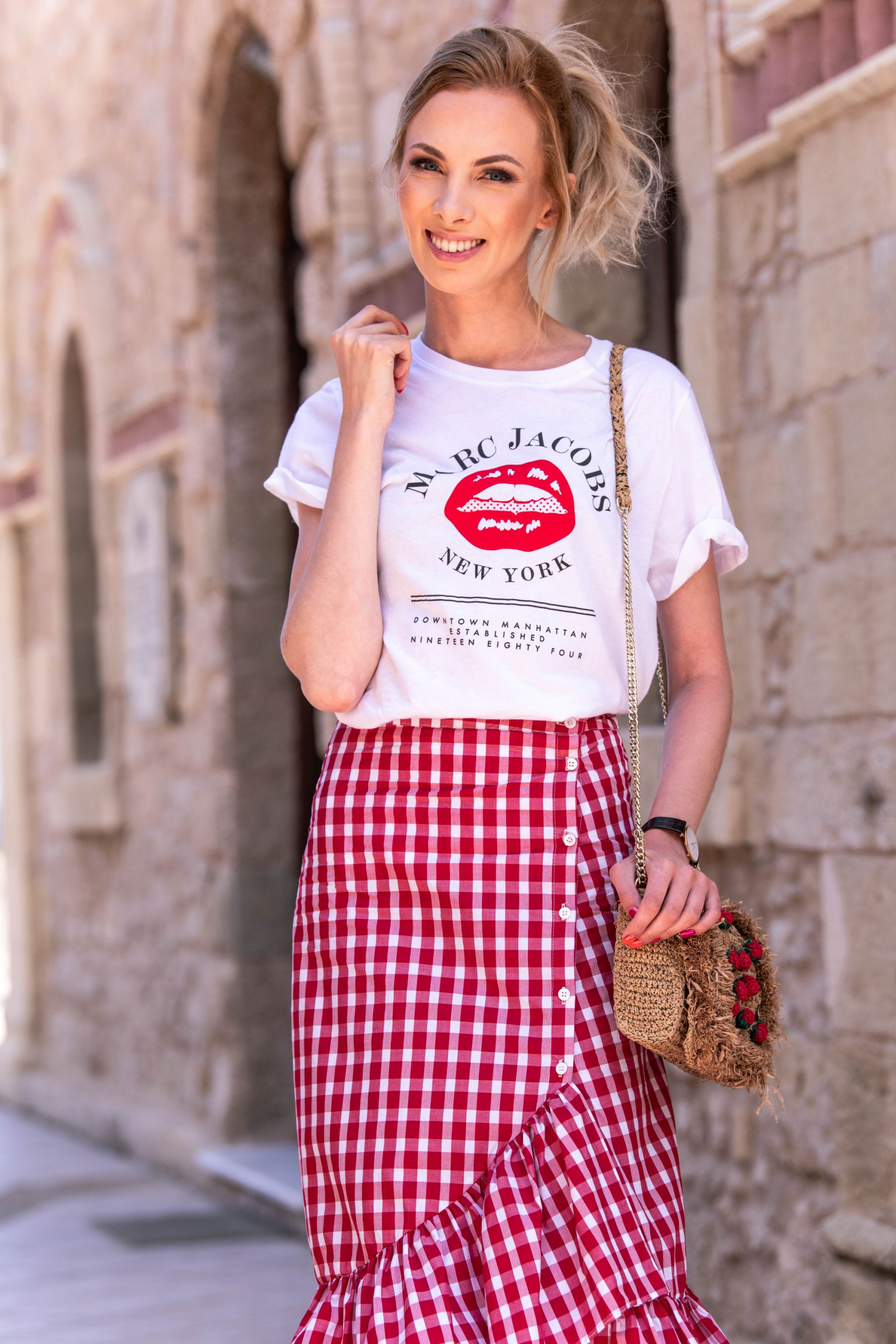 Z zestawów które pokazuje Wam na blogu mam swoje ulubione, które są dla mnie wyjątkowe i z różnych względów po jakimś czasie podobają mi się bardziej od pozostałych. Dziś chciałabym pokazać Wam zdjęcia jednej z takich właśnie stylizacji. Nie wiem czy jest to kwestia samego zestawu, miejsca, światła, na które w tamtym momencie udało nam się trafić czy wszystkiego po trochu, ale mam do niego sentyment. Jest pozytywny i może dlatego tak go polubiłam. Co ciekawe poza butami, które są moim wakacyjnym odkryciem, wszystkie pozostałe elementy mogliście już u mnie oglądać, część z nich nawet kilka razy. Nic jednak nie poradzę na to, że świetnie czuje się w takiej kraciastej spódnicy w hiszpańskim stylu czy ze słomkową torebką w poziomki na ramieniu. Tak charakterystycznym rzeczom wystarczył do kompletu biały tshirt z nadrukiem i klasyczny, elegancki zegarek, na czarnym skórzanym pasku. To wszystko uzupełnione pięknymi biało czarnymi sandałkami na klocku wiązanymi nad kostką i zestaw gotowy. W sam raz na słoneczny, wakacyjny dzień.