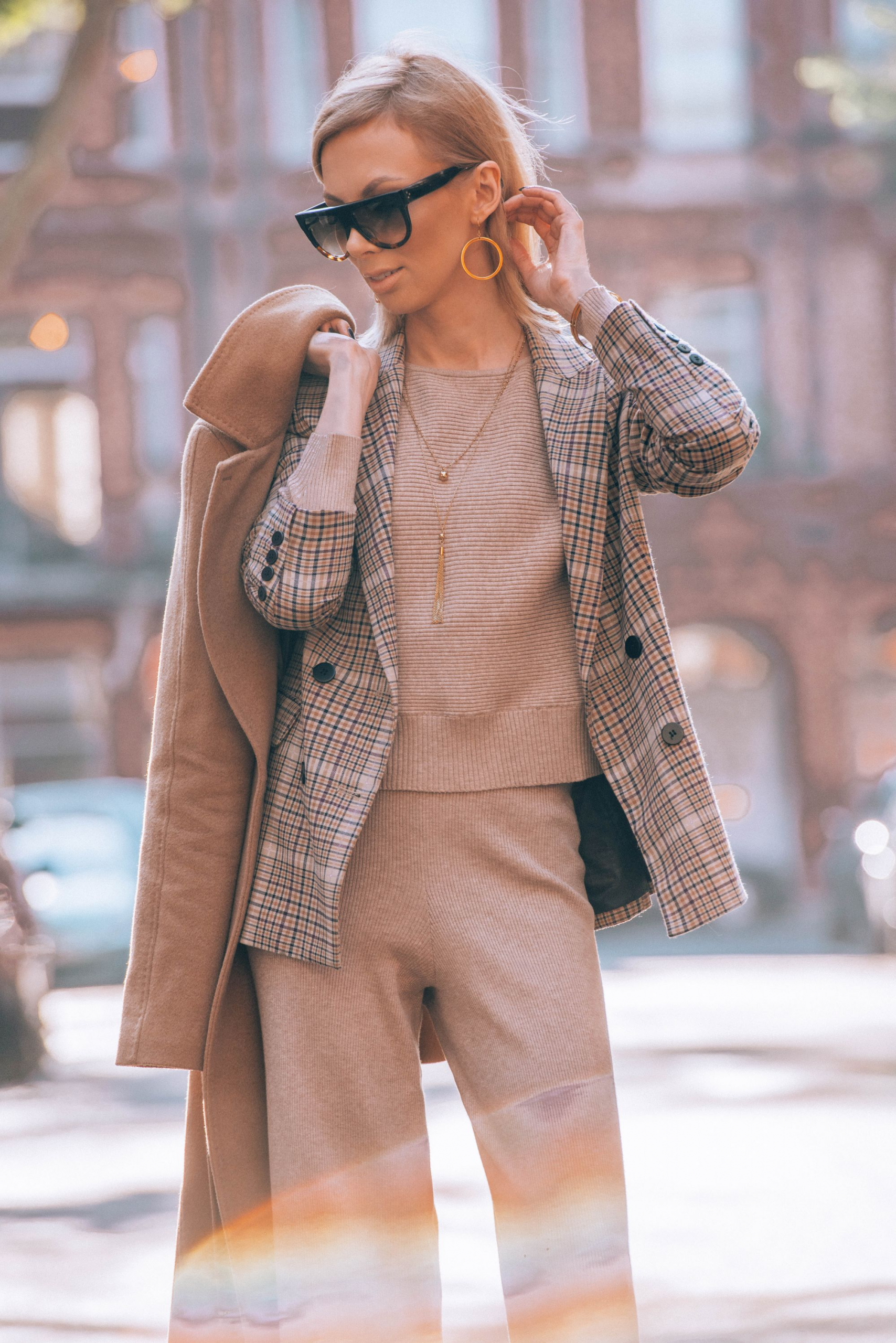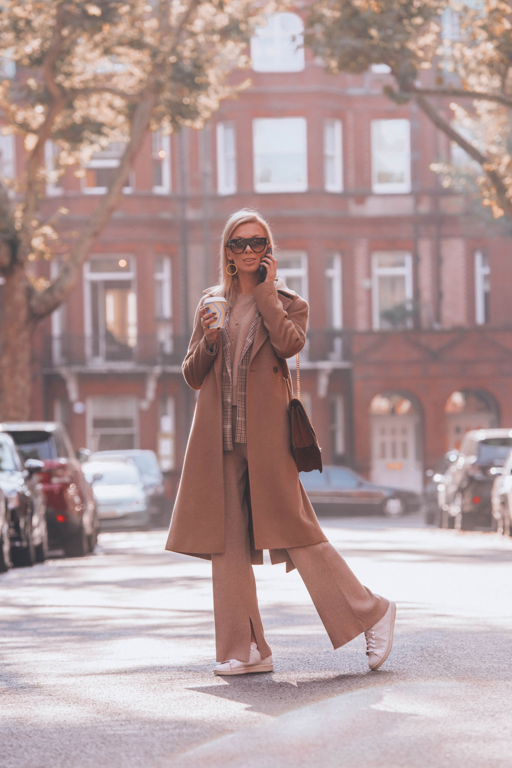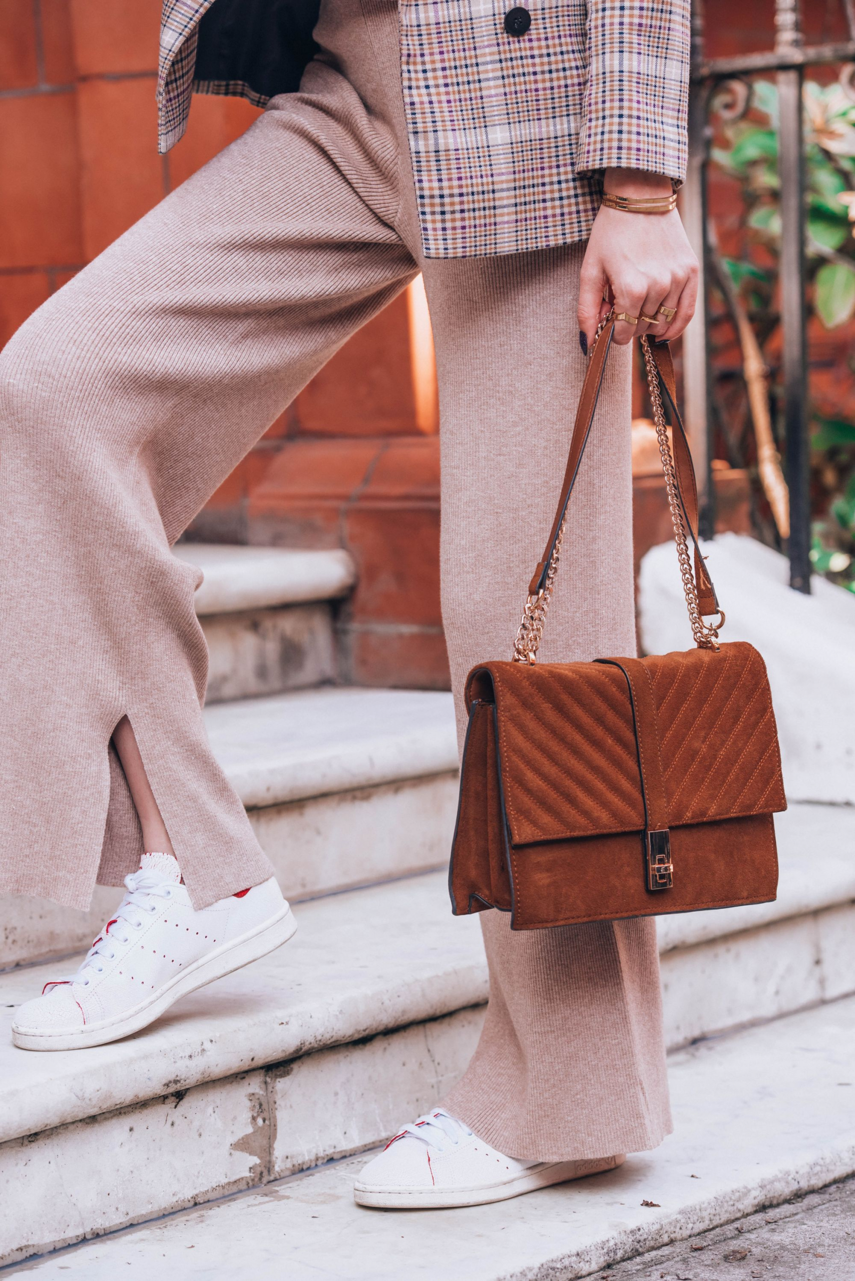 Pokazałam Wam już pierwszy zestaw z Holandii, czas więc na pierwszą stylizację z Londynu. Piękna pogoda na jaką trafiłam, lekko mnie zaskoczyła. Planowałam robić dla Was ciepłe, typowo jesienne zdjęcia, a dzięki słońcu szybko pozbyłam się płaszcza zostawiając kraciastą marynarkę jako moje okrycie wierzchnie. Tak jak obiecałam jakiś czas temu, tego wzoru nie zabraknie w najbliższych miesiącach na blogu i Instagramie. Poza marynarką postawiłam na dzianinowy, prążkowany komplet ze spodniami. Chcąc czuć się wygodnie wybrałam białe sportowe buty. Co ciekawe, w Londynie na każdym kroku spotykałam dziewczyny, które do eleganckiego looku ze spódnicą i rajstopami, dobierały białe Adidasy Stan Smith. Jak widać nie tylko dla mnie są to jedne z ulubionych sneakersów. Całość dopełniła zamszowa torebka i moje ukochane okulary przeciwsłoneczne od Celine. Do tego oczywiście biżuteria w kolorze złota od Elixy.