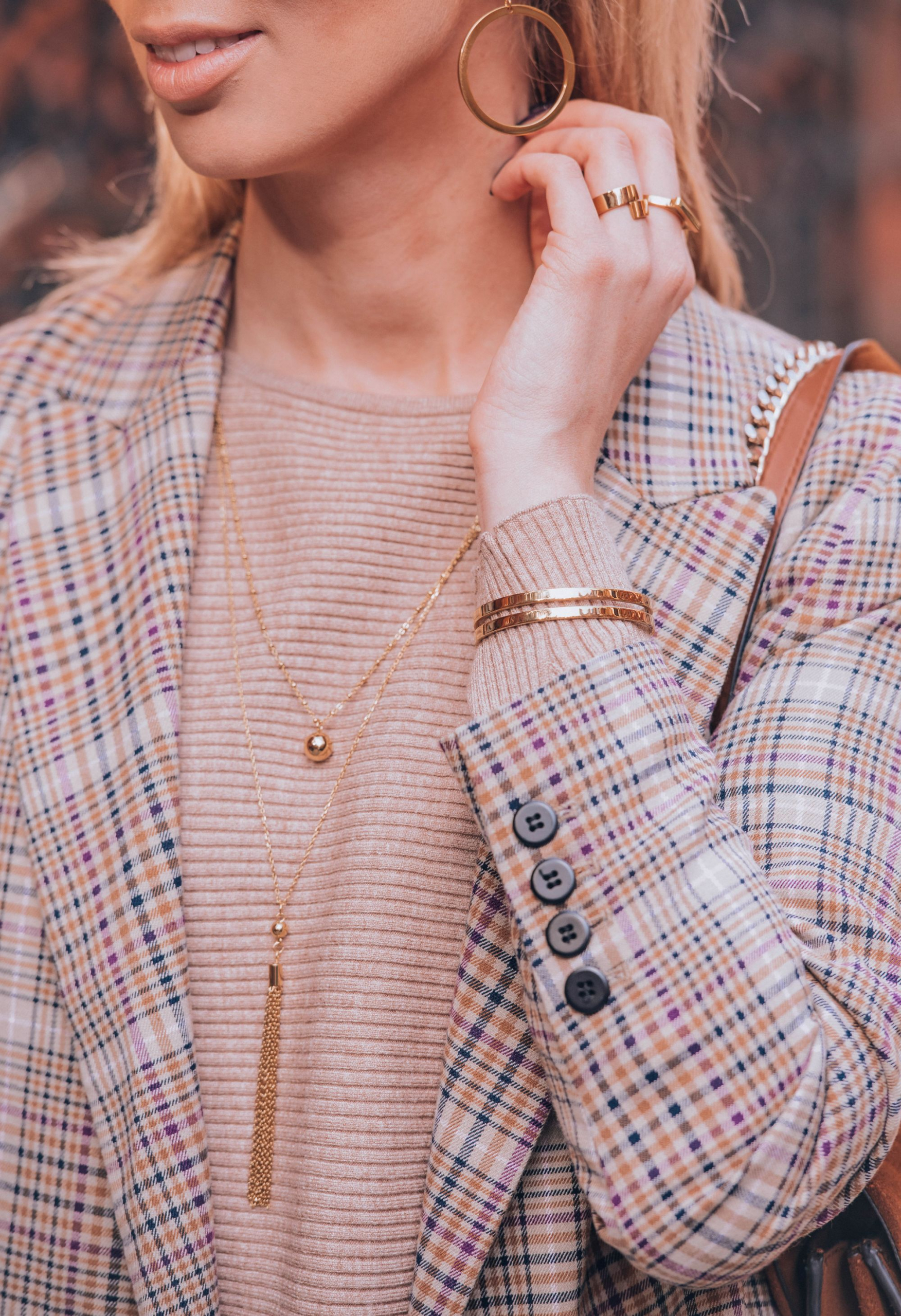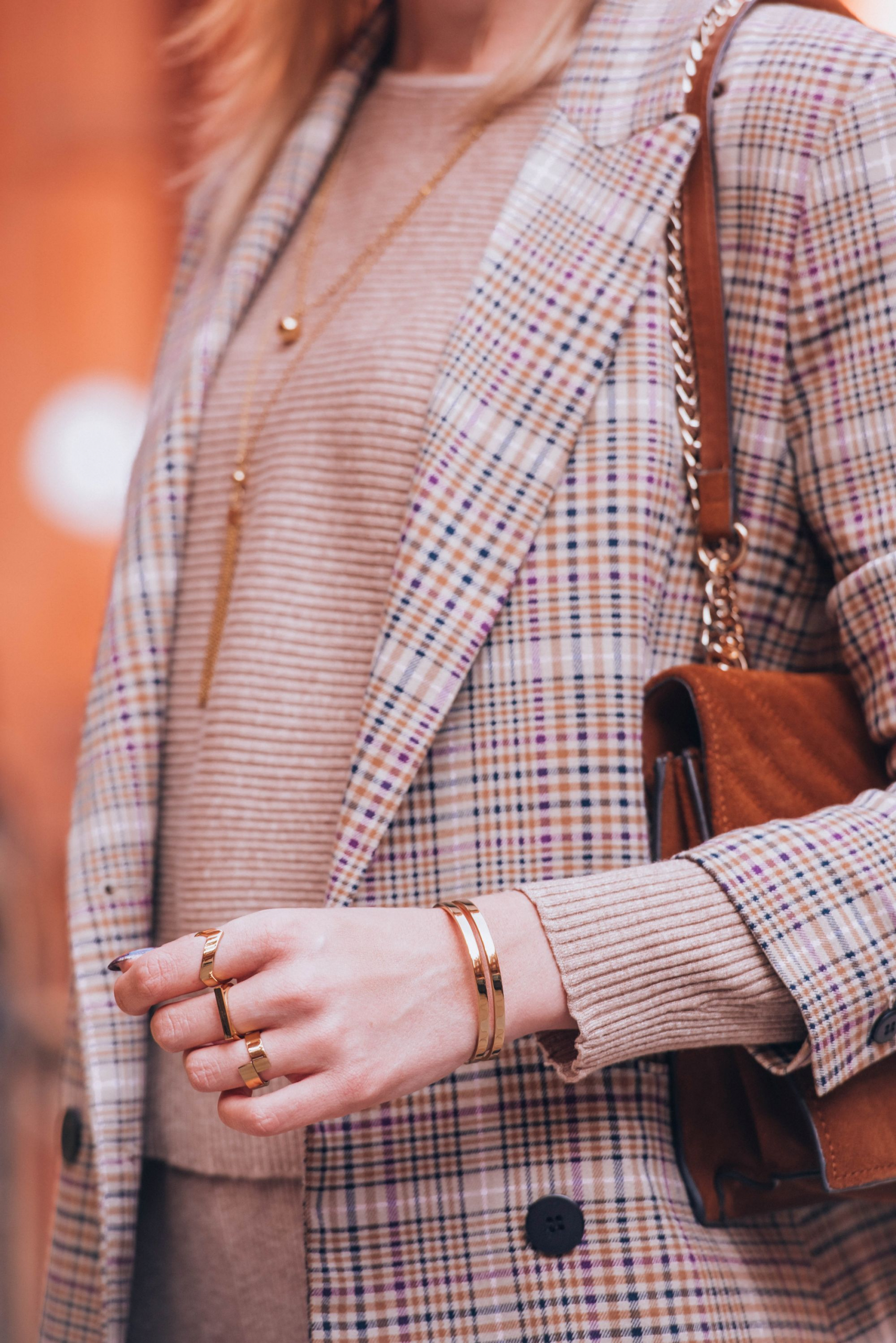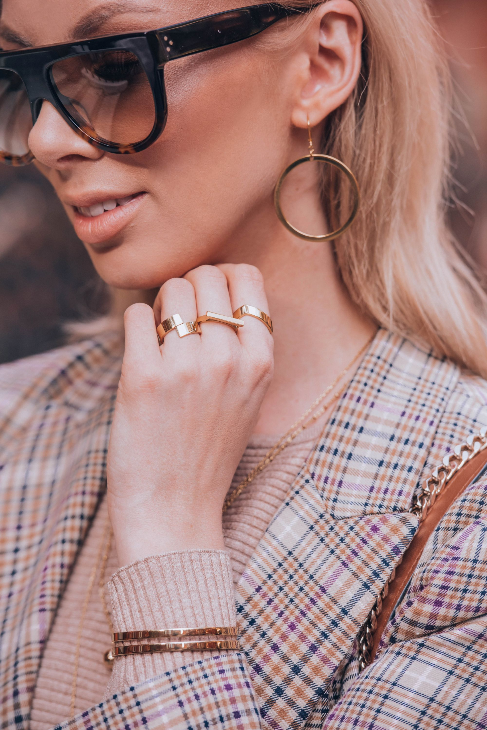 Pokazałam Wam już pierwszy zestaw z Holandii, czas więc na pierwszą stylizację z Londynu. Piękna pogoda na jaką trafiłam, lekko mnie zaskoczyła. Planowałam robić dla Was ciepłe, typowo jesienne zdjęcia, a dzięki słońcu szybko pozbyłam się płaszcza zostawiając kraciastą marynarkę jako moje okrycie wierzchnie. Tak jak obiecałam jakiś czas temu, tego wzoru nie zabraknie w najbliższych miesiącach na blogu i Instagramie. Poza marynarką postawiłam na dzianinowy, prążkowany komplet ze spodniami. Chcąc czuć się wygodnie wybrałam białe sportowe buty. Co ciekawe, w Londynie na każdym kroku spotykałam dziewczyny, które do eleganckiego looku ze spódnicą i rajstopami, dobierały białe Adidasy Stan Smith. Jak widać nie tylko dla mnie są to jedne z ulubionych sneakersów. Całość dopełniła zamszowa torebka i moje ukochane okulary przeciwsłoneczne od Celine. Do tego oczywiście biżuteria w kolorze złota od Elixy.