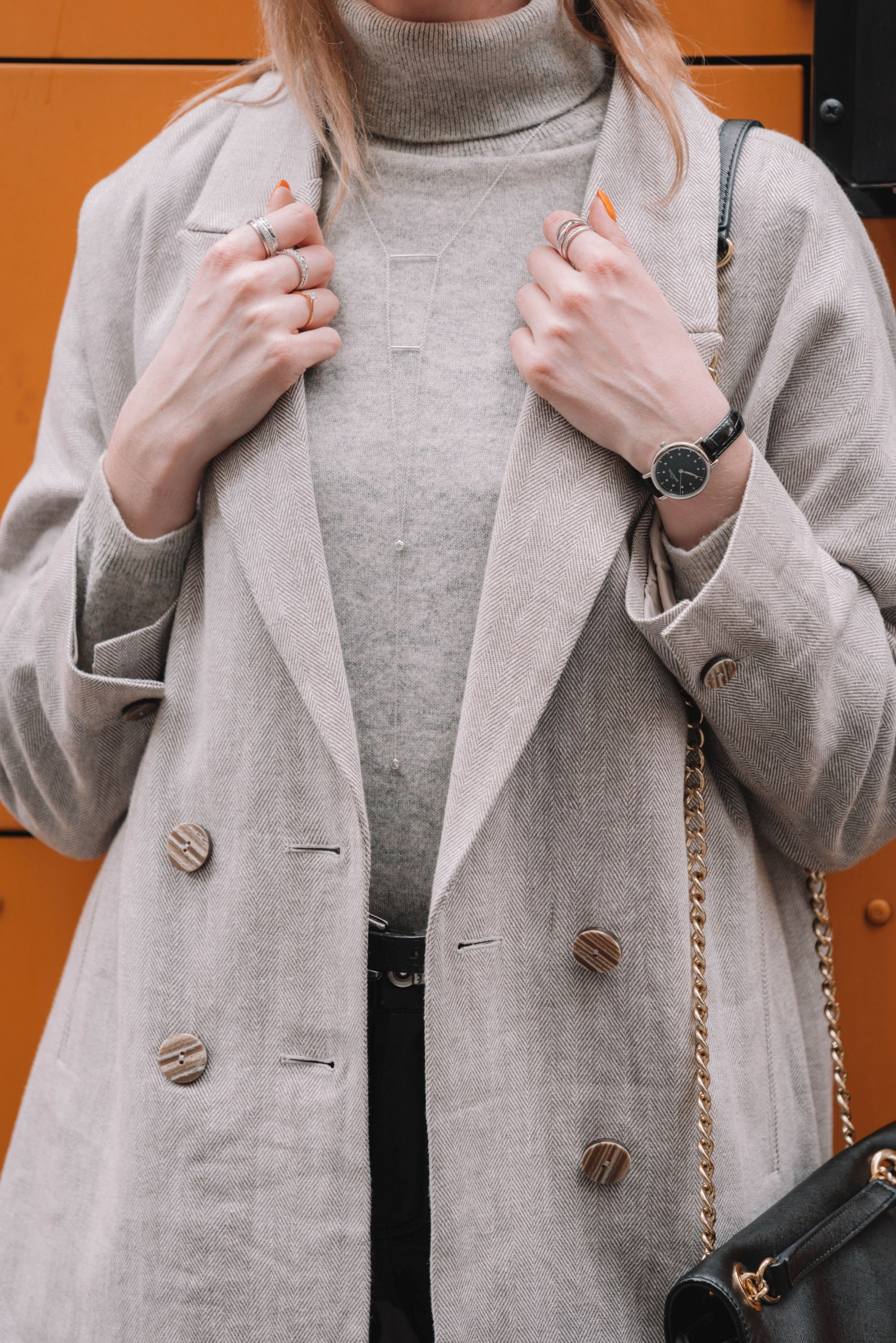 W związku z tym, że tego dnia nie było za ciepło, postawiłam na szary golf i jako okrycie wierzchnie wykorzystałam dłuższą marynarką w podobnym odcieniu. Na dół założyłam skórzane spodnie rozpinane po bokach oraz czarne workery. Reszta dodatków to oczywiście biżuteria Apart, zegarek Bergstern, jedna z moich ulubionych czarnych torebek oraz okulary, które zakładam prawie do każdej stylizacji i które mam zawsze przy sobie. Dajcie znać jak podoba Wam się takie połączenie.