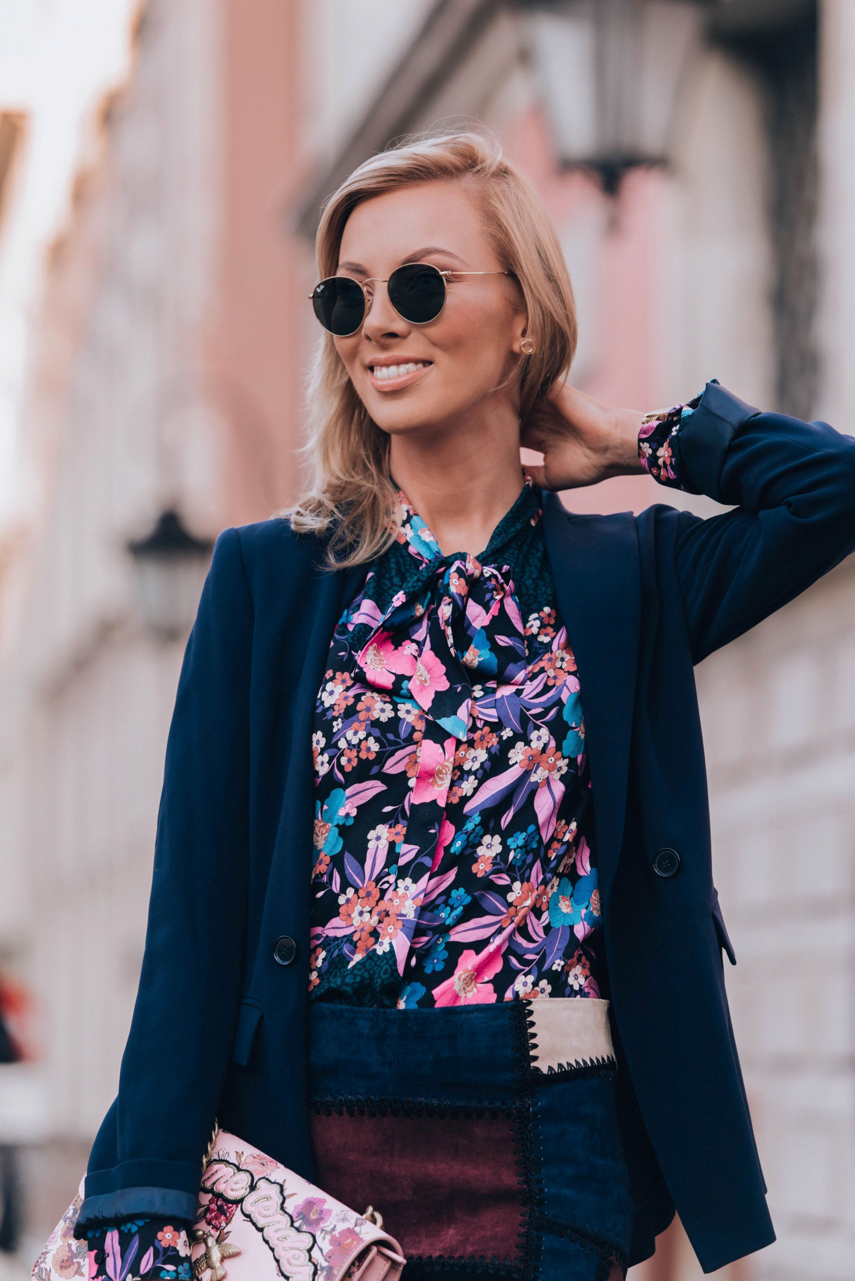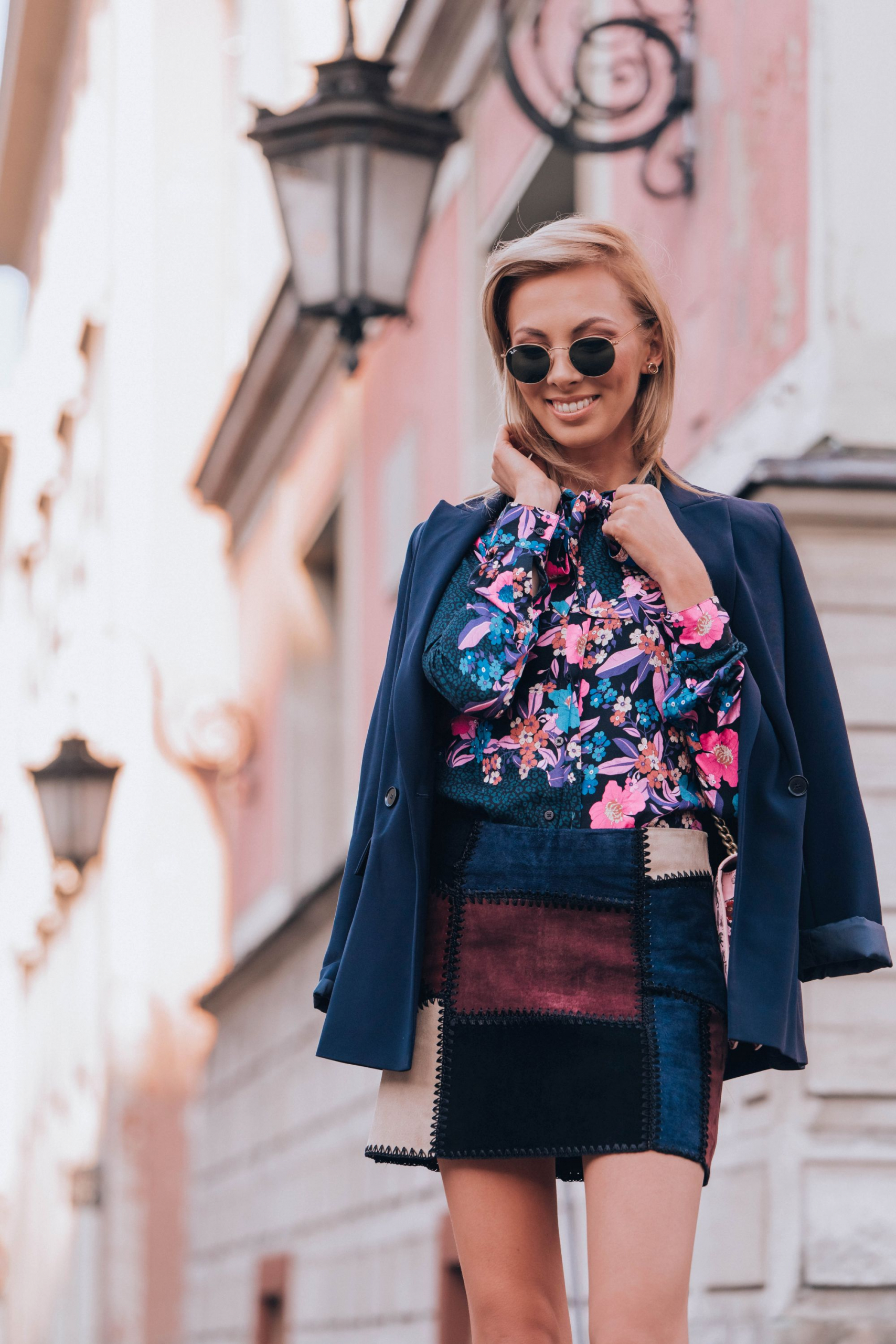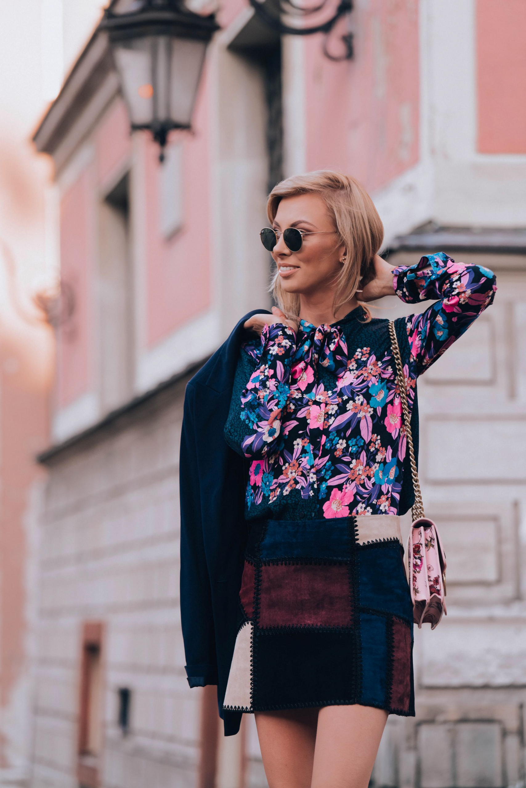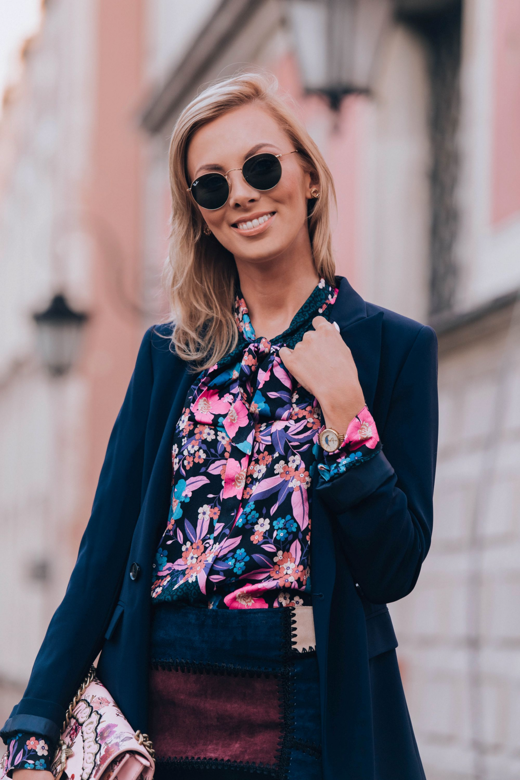 Do tego dobrałam żakiet kolejnej polskiej marki którą uwielbiam, a mianowicie Patrizia Aryton. To nie koniec elementów ‘made in Poland” . Buty pochodzą z mojego ukochanego L37, a biżuteria tradycyjnie z Apartu. Bardzo lubię wspierać polskie marki, szczególnie takie, za którymi dodatkowo idzie jakość. Łączę je zarówno z rzeczami z sieciówek (spódnica jest z Zary) jak i markowymi elementami, które służą mi potem latami (torebka Pinko). Ostatni element to moje ulubione okulary przeciwsłoneczne tego lata – Raybany . Chodziłam w nich prawie całe lato.