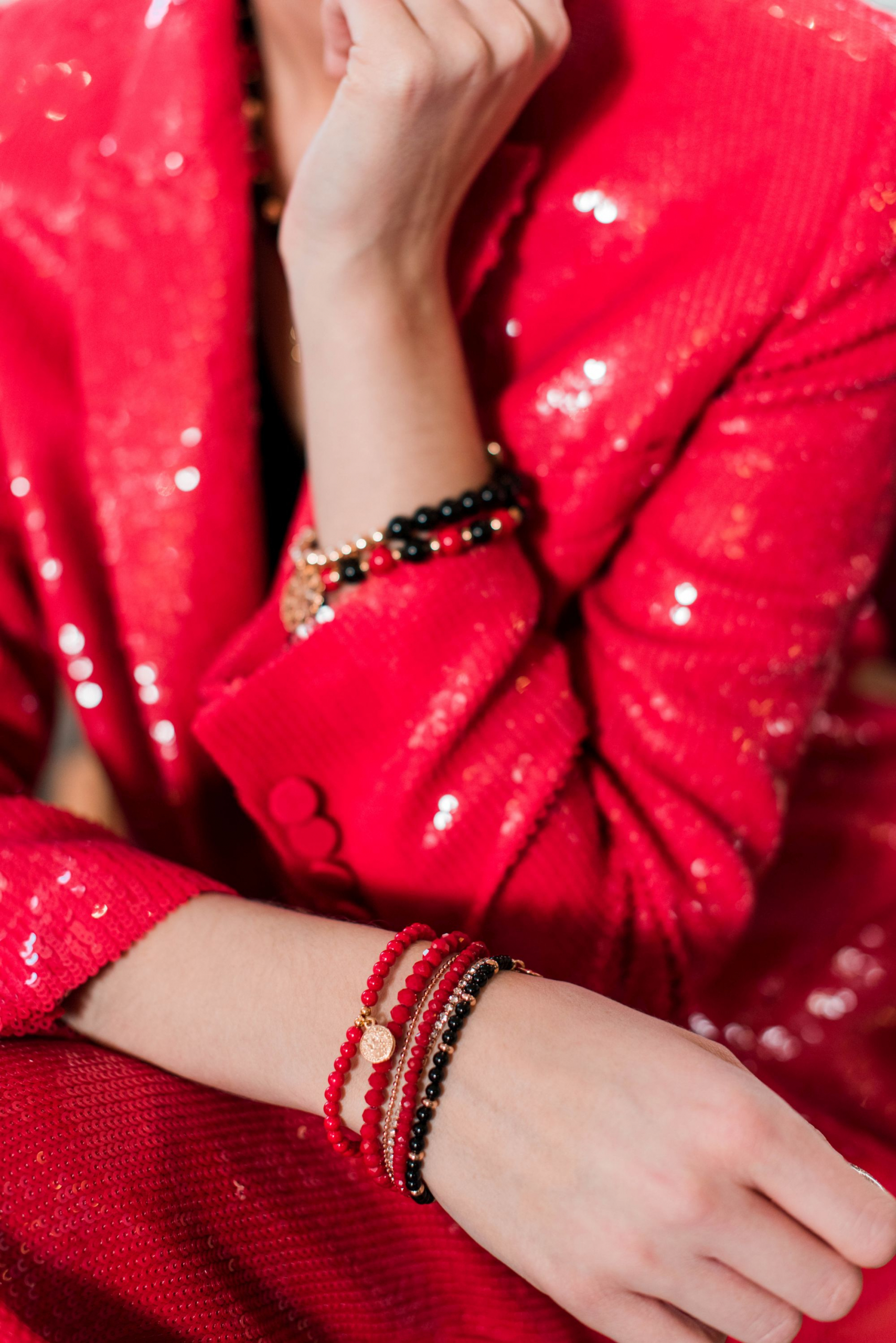 Pierwszy zestaw zdecydowanie powinien przypaść do gustu osobom, które lubią być w centrum uwagi. Nie da się przejść obojętnie obok czerwonego garnituru, pokrytego w całości cekinami. Absolutnie przyciąga wzrok, pięknie mieniąc się w świetle.