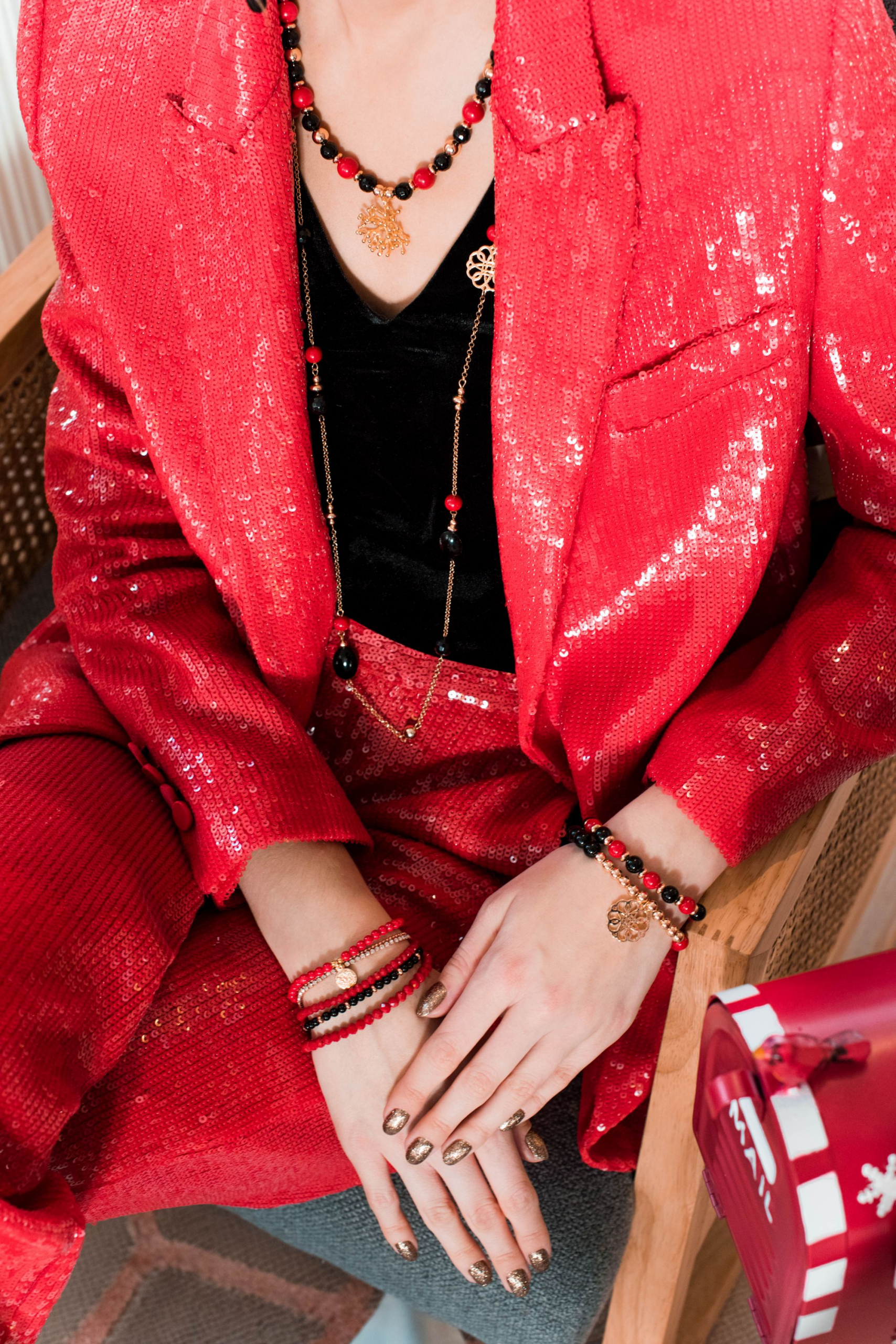 Do tak rzucającej się w oczy bazy, nie mogłam dobrać nić innego jak czarne, dodatki, które tonują całość. Postawiłam na czarny, welurowy top z dość głębokim dekoltem, który dzięki temu świetnie wyeksponował naszyjnik oraz sandałki, których wiązanie ukryło się pod nogawką spodni. To połączenie oczywiście nadaje się tylko w wypadku, gdy to u Was odbywają się Święta. Jeśli wybieracie się w gości, proponowałabym zmienić sandałki, na pełne czółenka. Całość uzupełniła czarno- czerwona biżuteria od Apartu z kolekcji Artelioni. Moim faworytem są szczególnie kolczyki, więc oglądając zdjęcia koniecznie zwróćcie na nie uwagę.