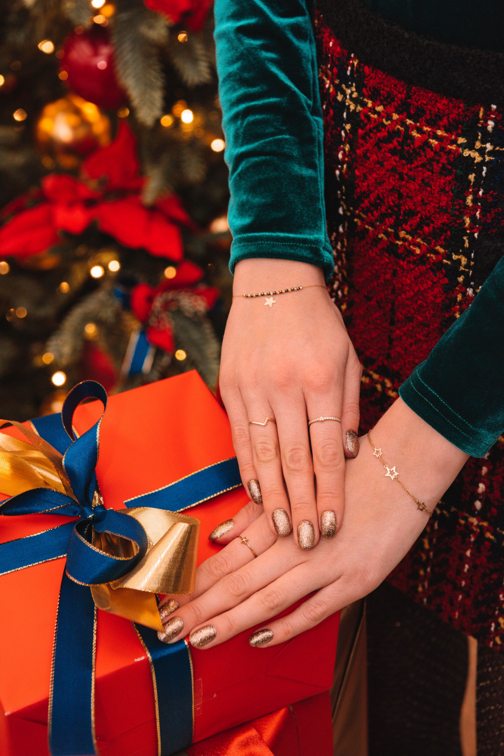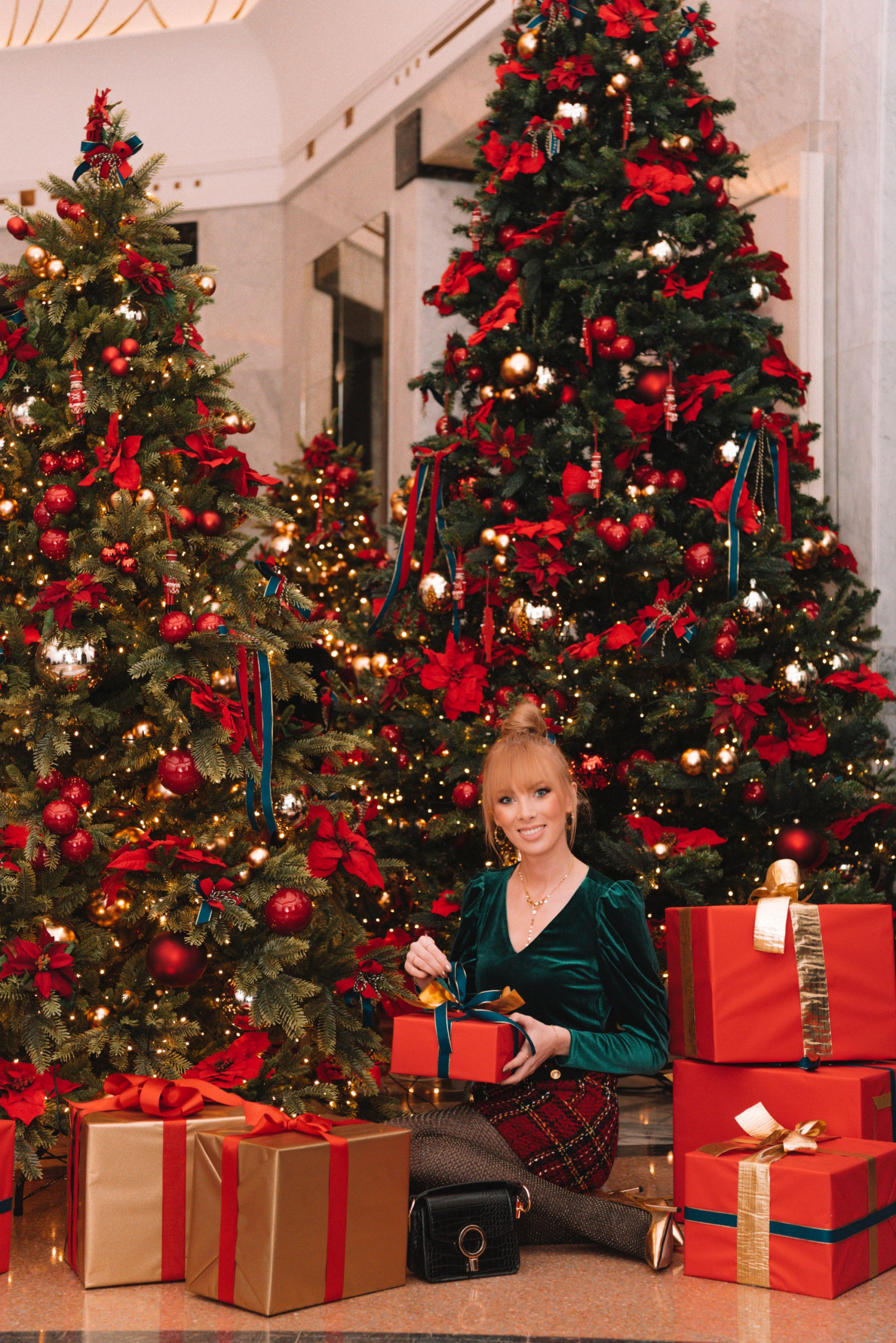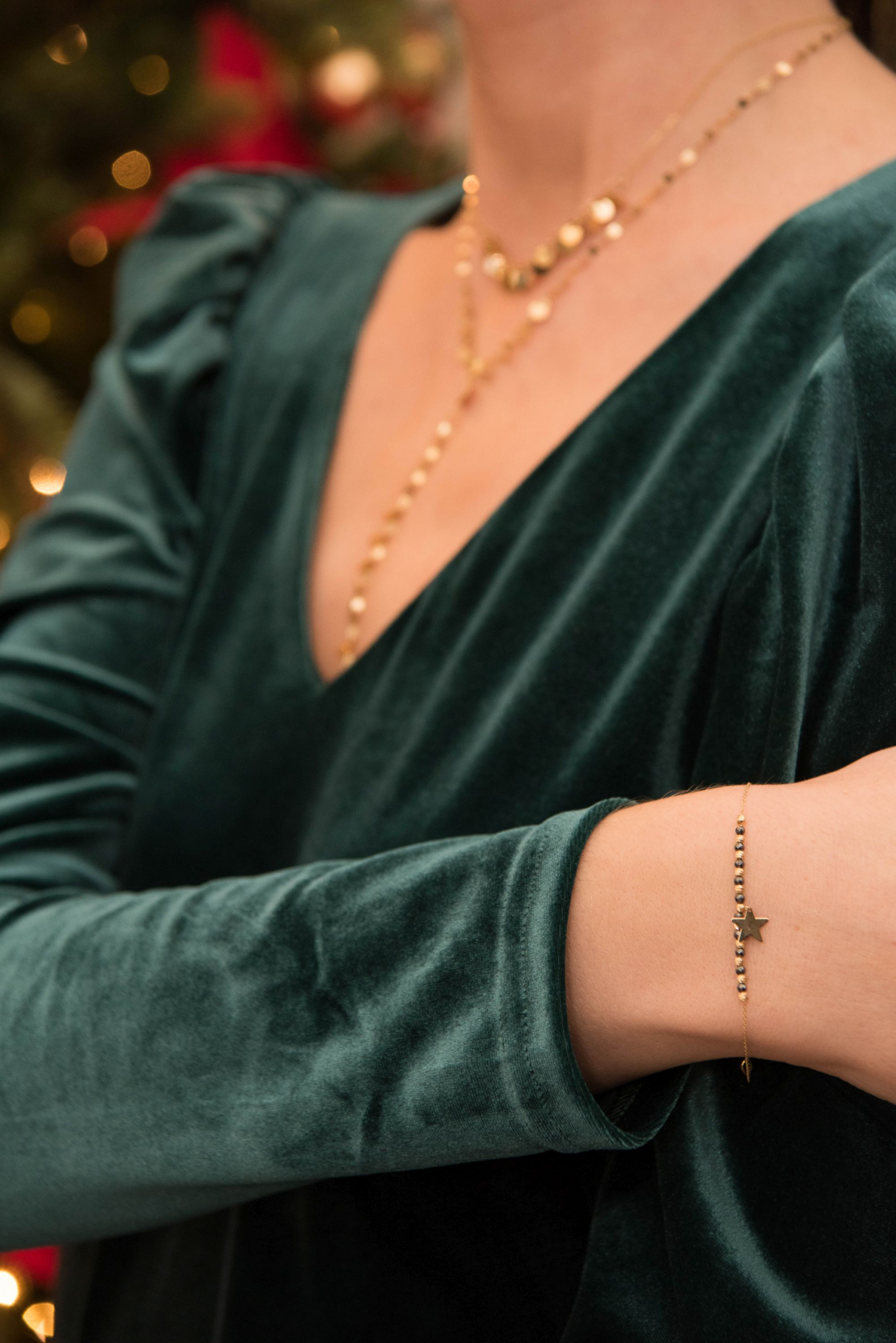 Drugi zestaw najbardziej nawiązuje do Świąt Bożego Narodzenia. Tutaj za bazę posłużyła mi welurowa, zielona bluzka z bufiastymi rękawami oraz czerwona tweedowa spódnica w złoto-czarną kratę. Do tego dobrałam złote szpilki oraz rajstopy wykończone złotą nicią. Również biżuteria w tym wypadku musiała być w tym kolorze, by subtelnie dopełnić całość. To najnowsza kolekcja Apart. Ta stylizacja powstała w hotelu Bristol i jest moim cichym faworytem spośród wszystkich zestawów, które Wam dziś pokazałam.
