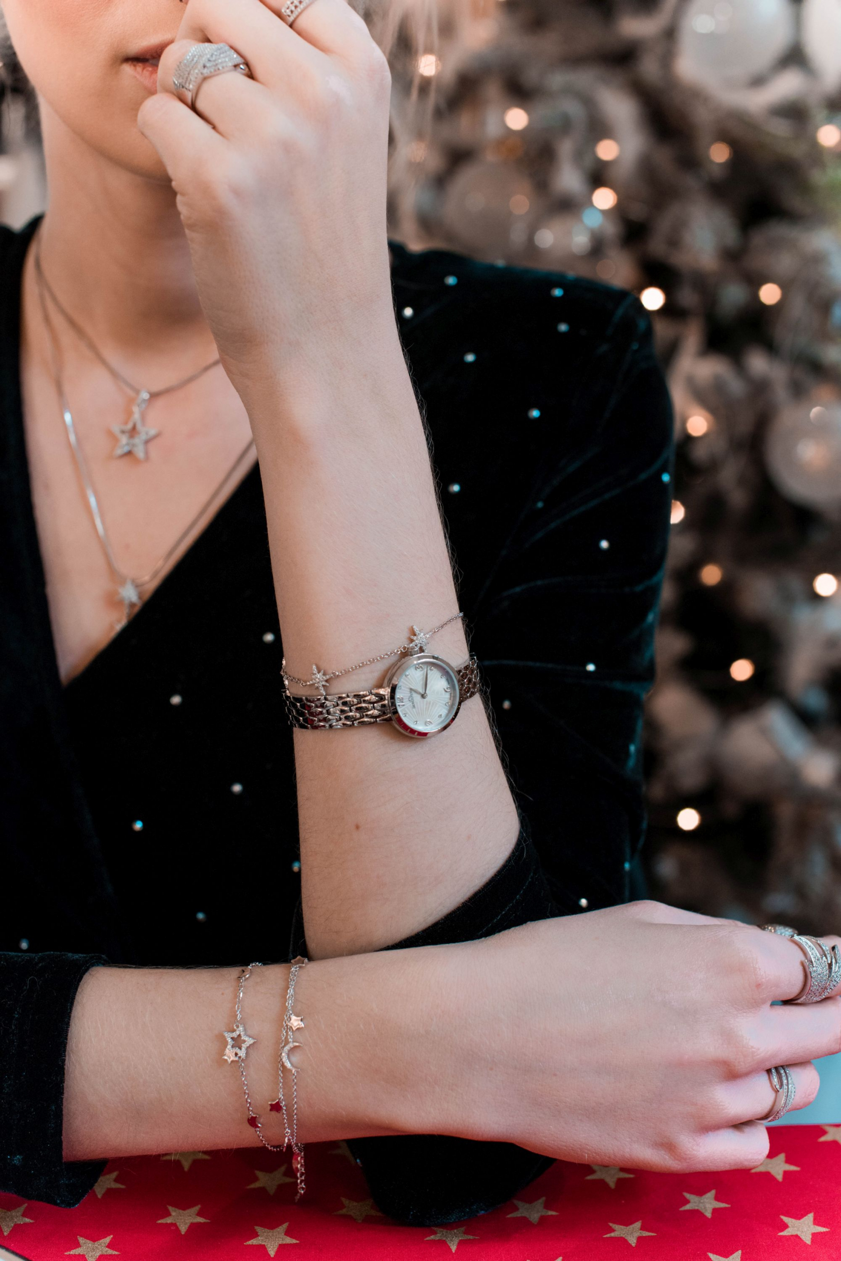 Trzeci zestaw jest bardzo elegancki i kobiecy. Jestem pewna, że idealnie sprawdzi się na Wigilię czy obiad w Pierwszy Dzień Świąt. Bazę stanowi tutaj czarna, welurowa, dopasowana do ciała sukienka z zapięciem kopertowym, w całości pokryta drobnymi dżetami. Zestawiłam ją z bordowymi, zamszowymi czółenkami na klocku oraz półprzezroczystymi rajstopami. Wśród dodatków znalazły się mała, błyszcząca torebka oraz srebrna biżuteria z kolekcji Elixa z Apartu. Dzięki niej zestaw wydaje się jeszcze bardziej elegancki.
