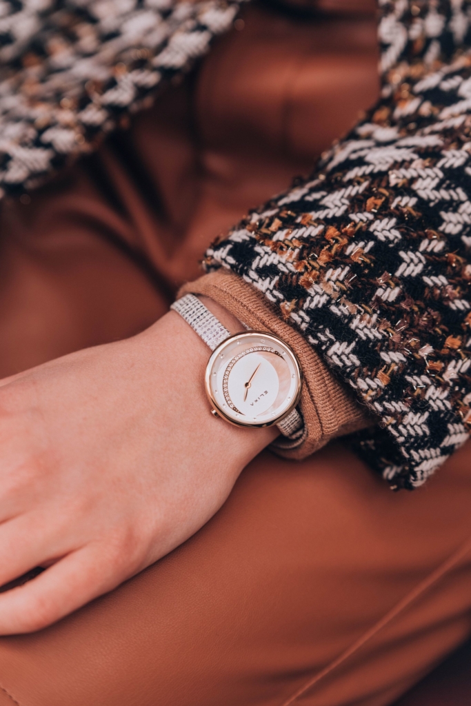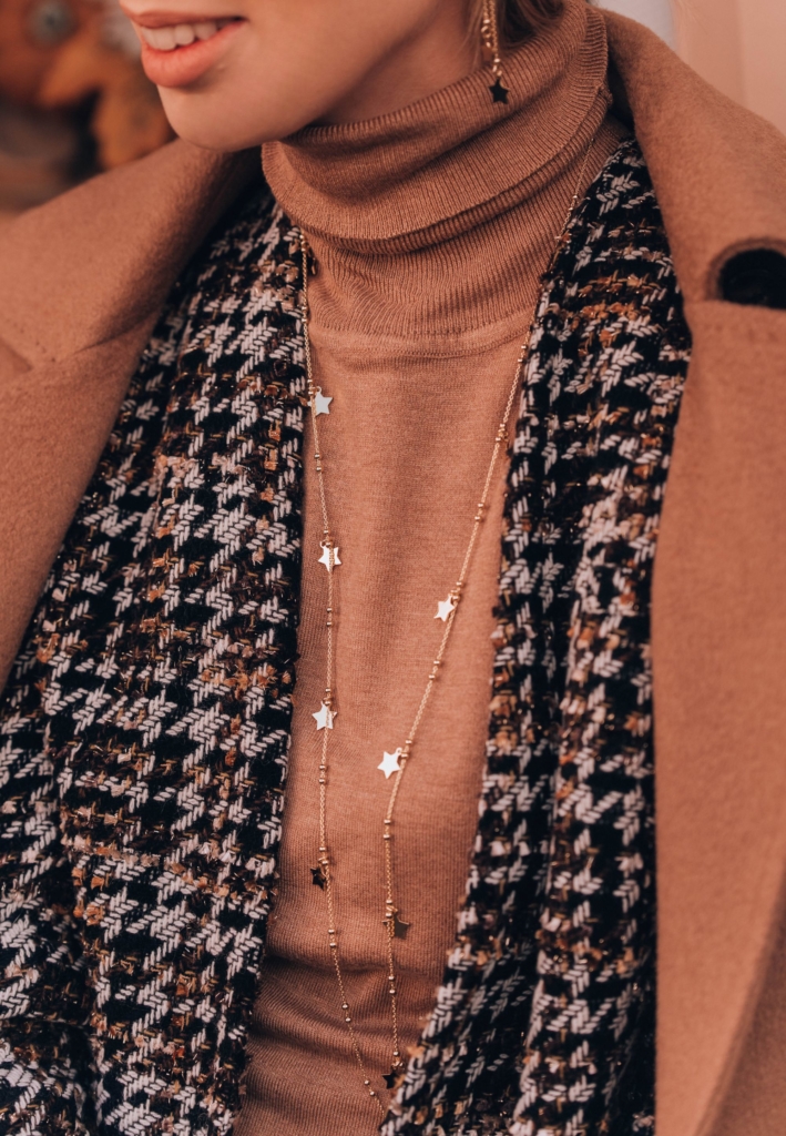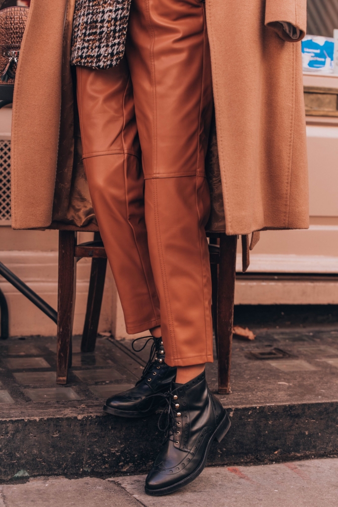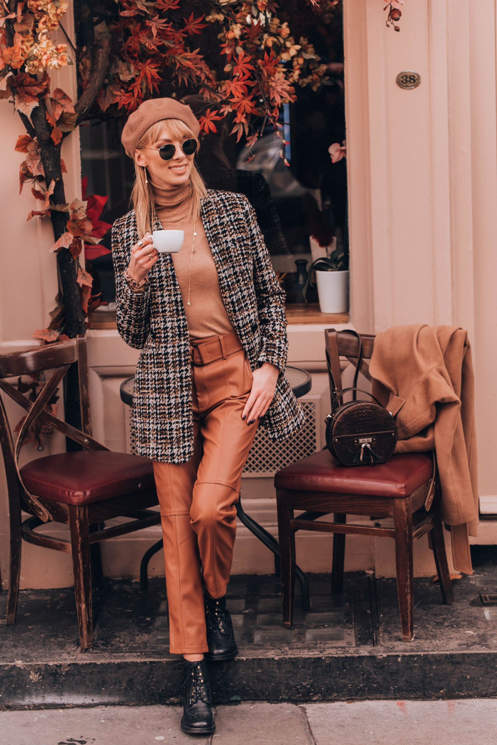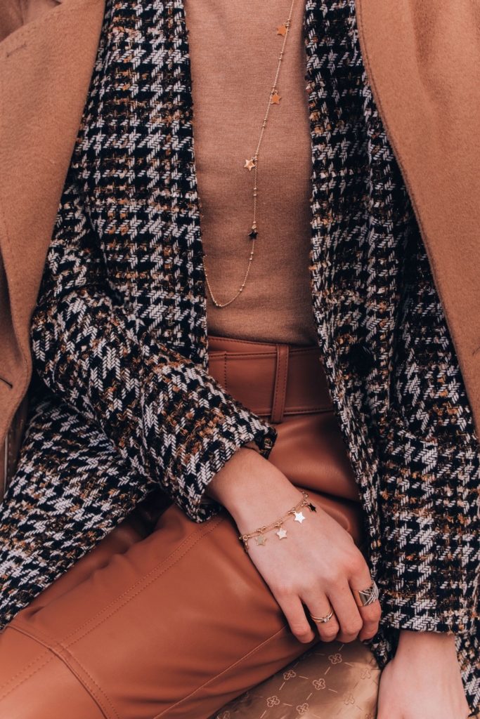 Jak widzicie długi, camelowy płaszcz z Arytonu ponownie jest jednym z głównych elementów zestawu. Jest wykonany w 100% z wełny wielbłądziej, więc gwarantuje Wam, że nigdy w nim nie zmarzłam. Poza tym jest przepięknie wykonany i przemiły w dotyku. Jeśli chodzi o bazę mojego stroju, to stanowi ją wełniany golf, spodnie z eko skóry oraz tweedowa, dwurzędowa marynarka. Wszystkie elementy poza butami są utrzymane w podobnej, brązowej kolorystyce.